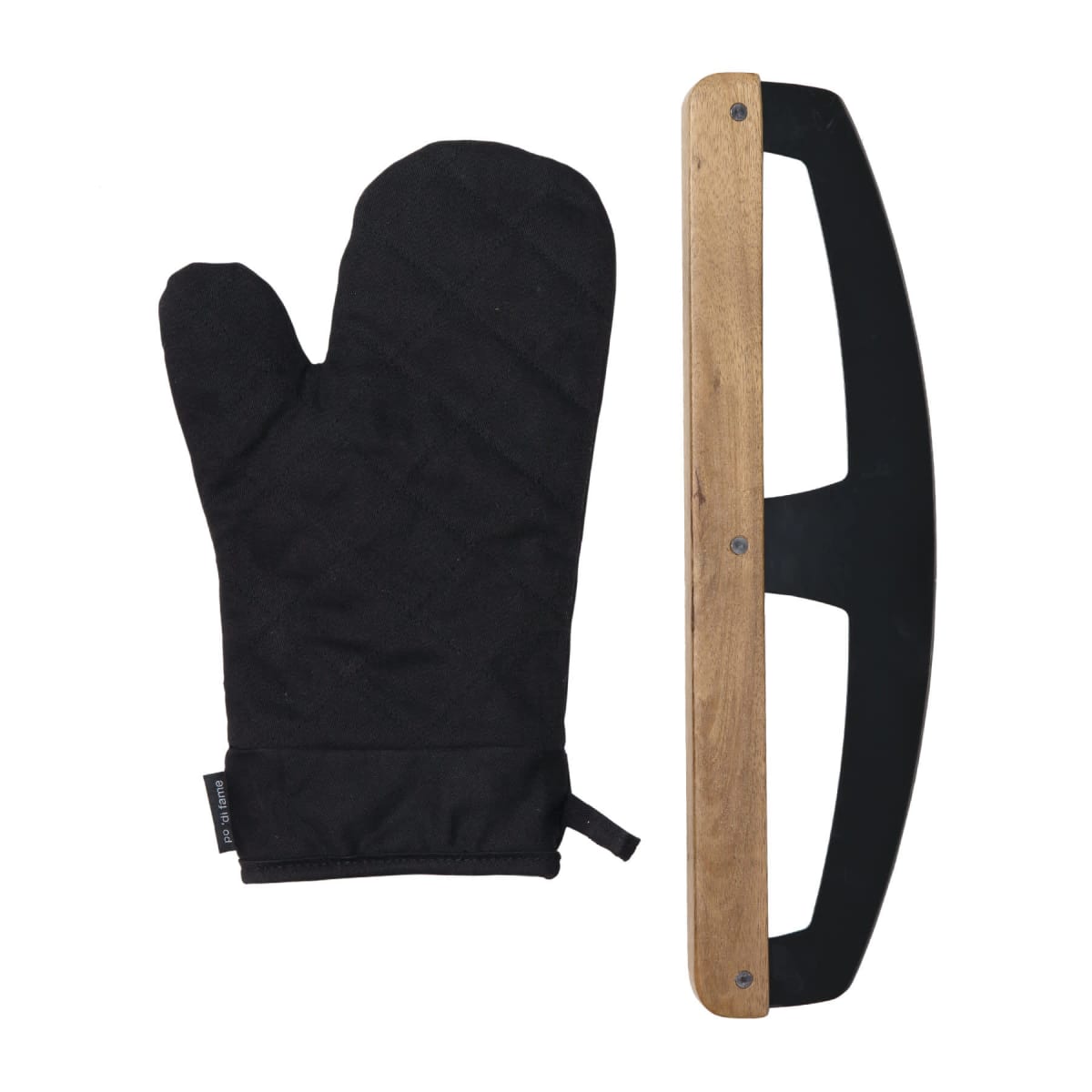 Set includes: Pizza Stone, Peel, cutter and oven mitt|Plantation grown Acacia hardwood board (FSC Certified) with FDA grade food oil finish|Black Cordierite pizza stone with dual handles|Pizza peel with beveled edge and integrated carry handle|Each peel displays its own character through its unique wood grain and subtle patina finish|Cutter with black Stainless steel blade and Acacia wood handle|Black padded oven mitt with po ‘di fame side pip|Nonna’s pizza dough recipe included|Supplied: in a bespoke po ‘di fame kraft presentation box (60.5cm W x 7cm H x 37cm D)