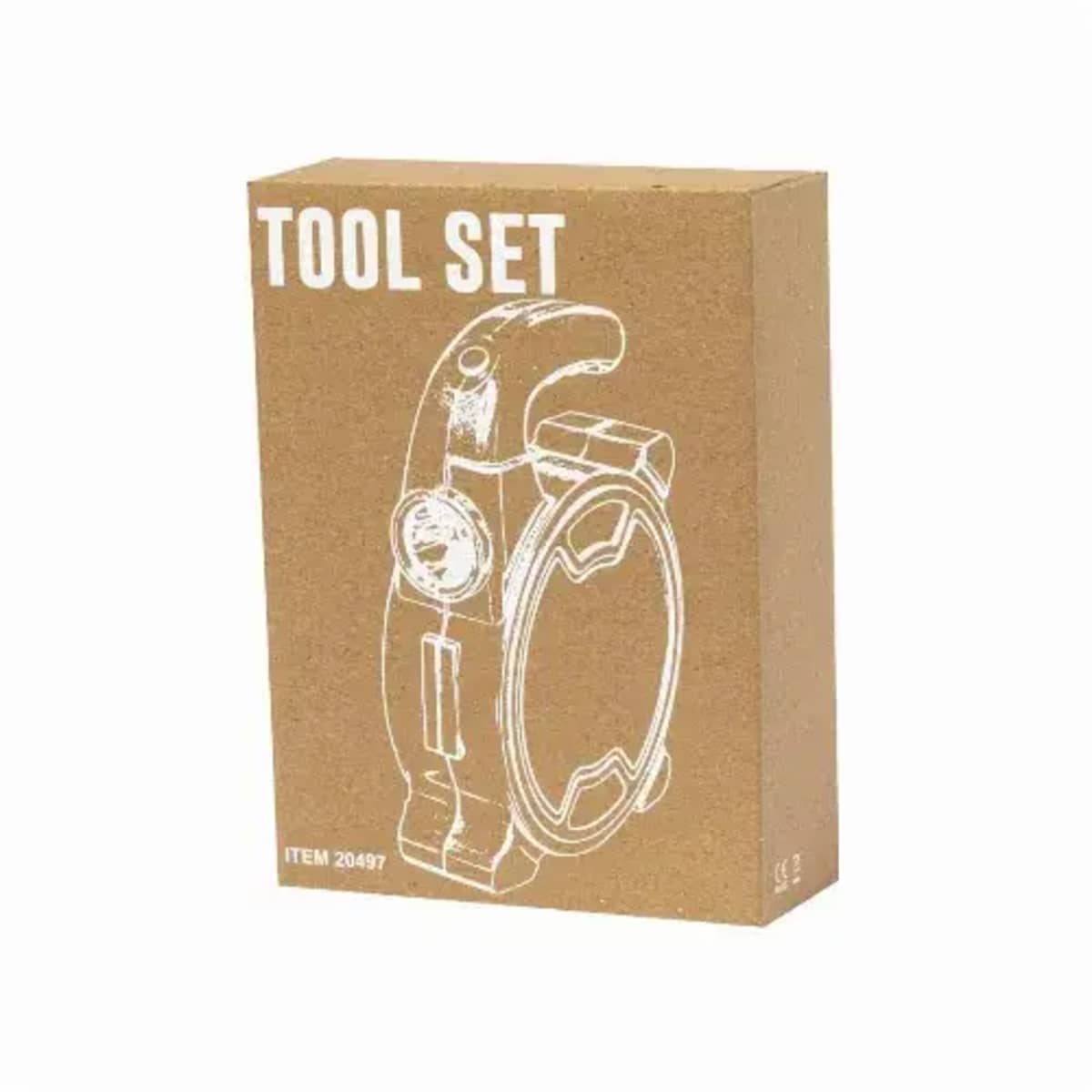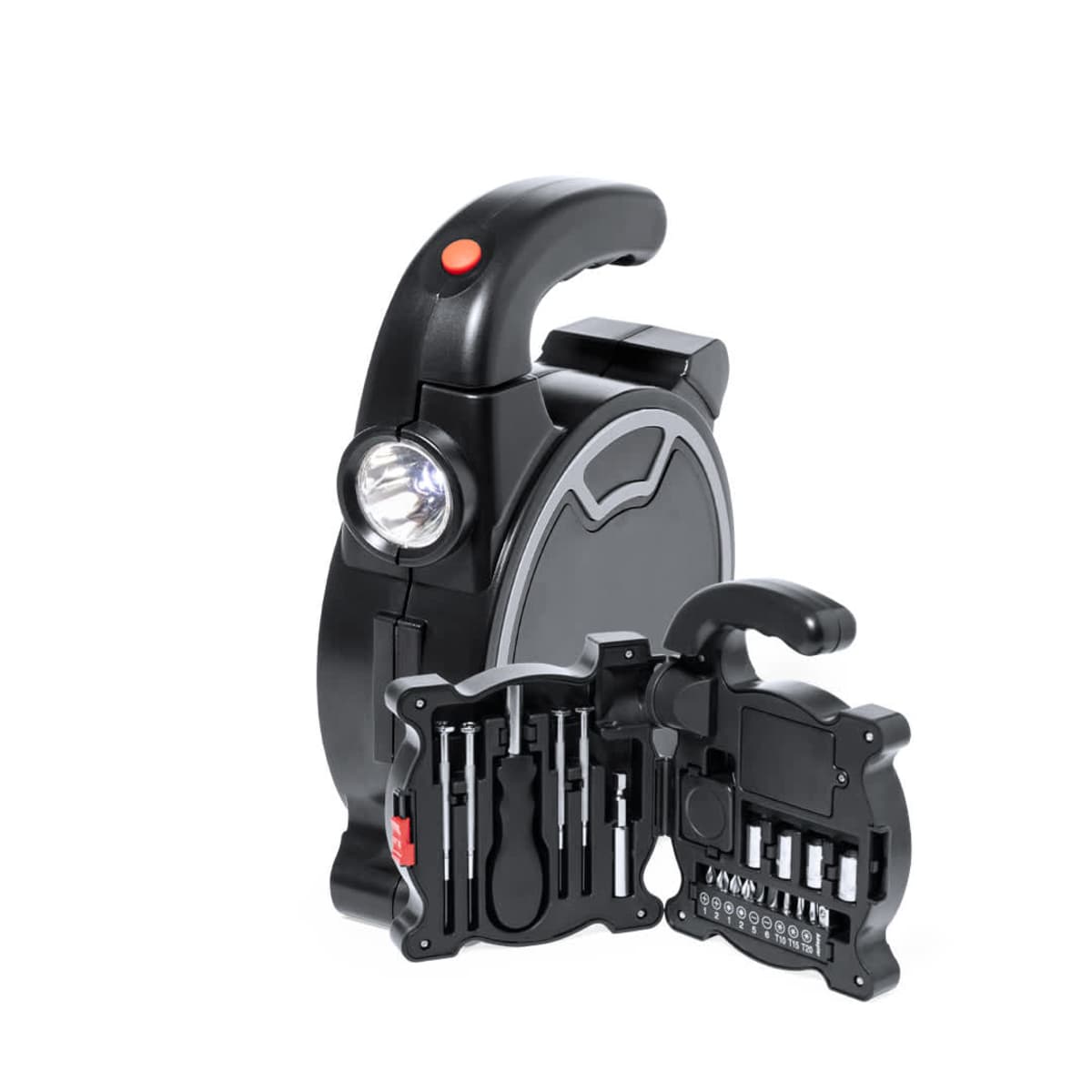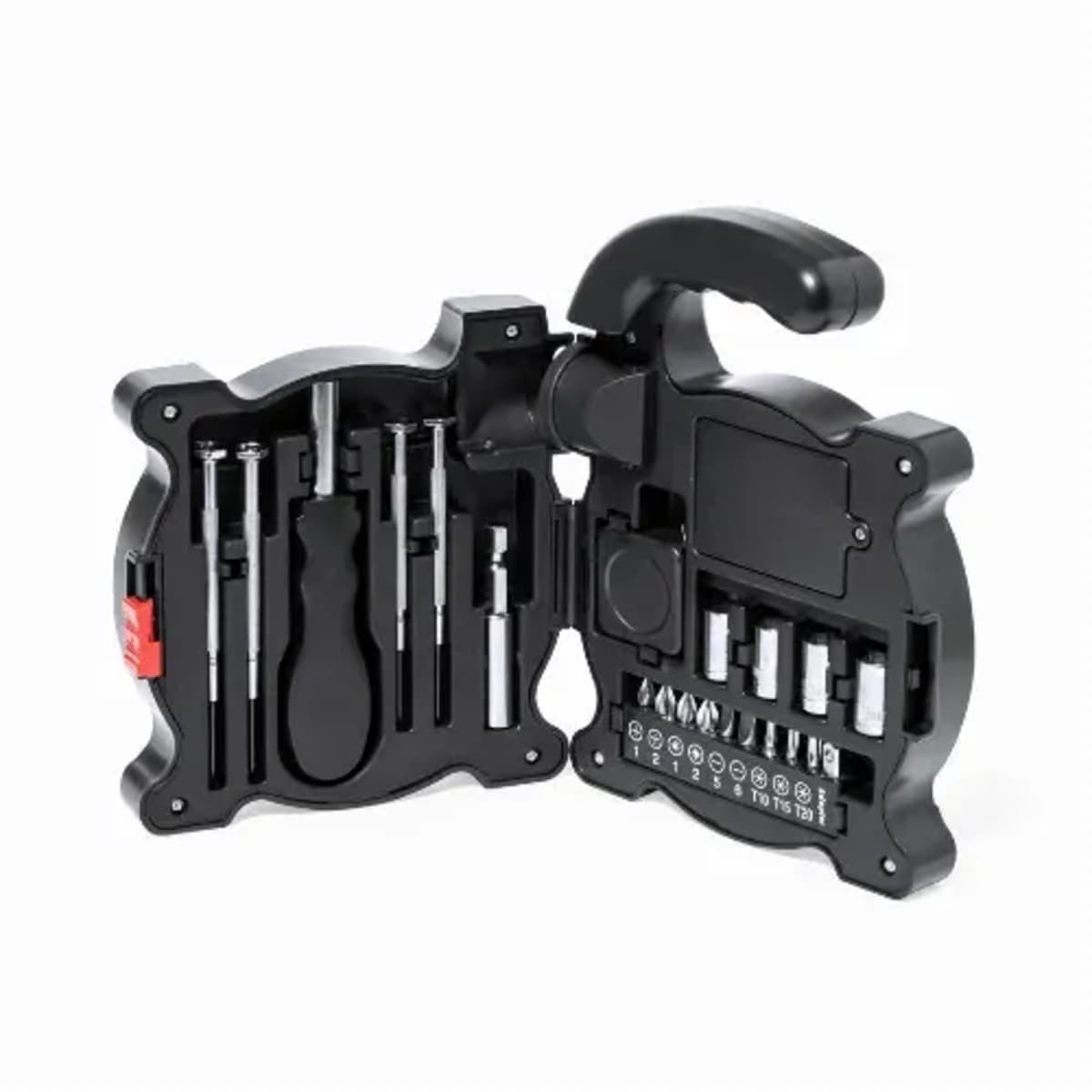 Features:  It has 21 accessories inside: precision screwdrivers (flat and philips), multifunction tool handle for compatible bits (philips, flat, adapters), socket spanners and flexometer. Presented in a kraft design box.