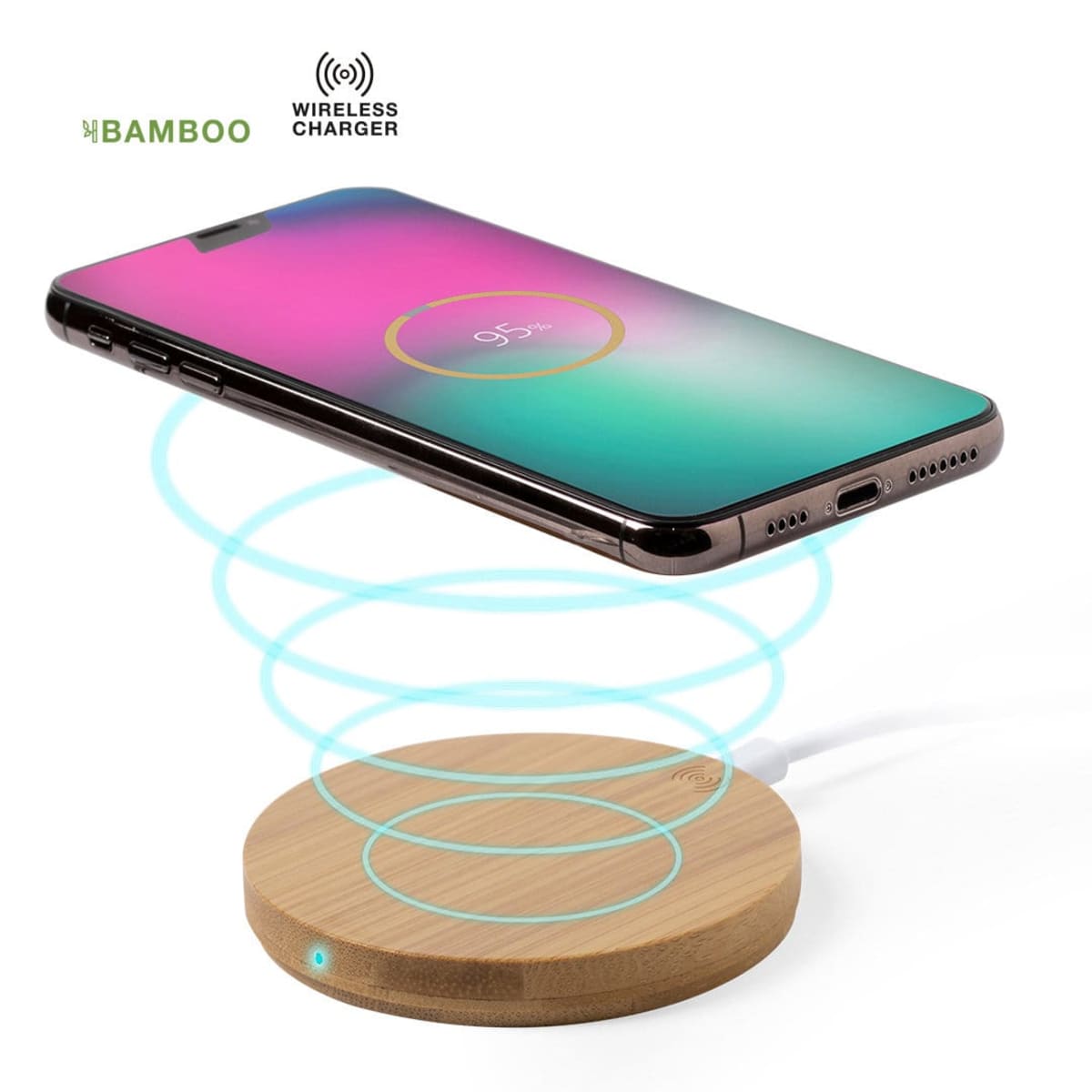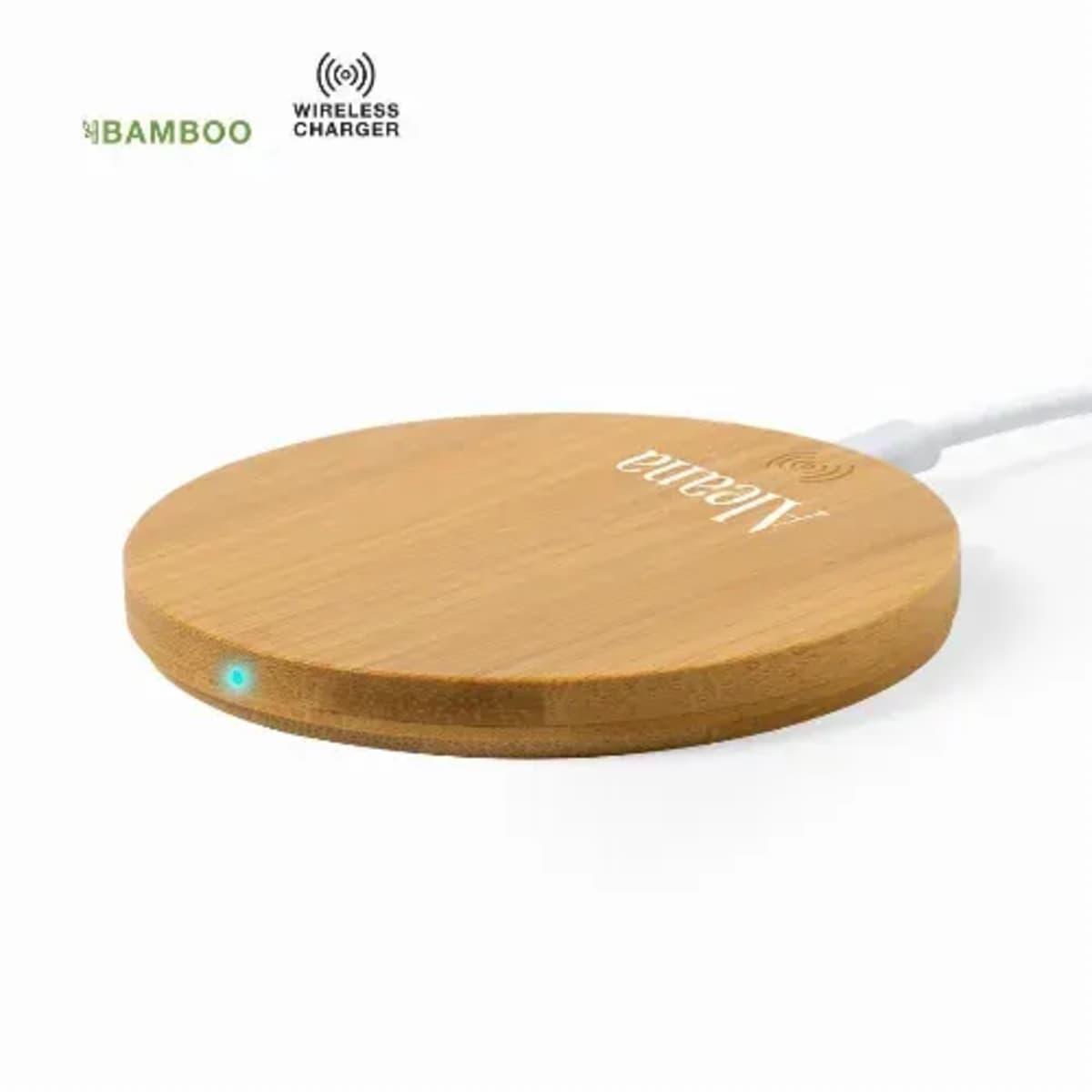 Features:  Shell in bamboo, from natural cut bamboo pieces. Charging indicator and compatible with devices equipped with wireless charging technology. Wide printing area and presented in an attractive, individual, eco-design box.