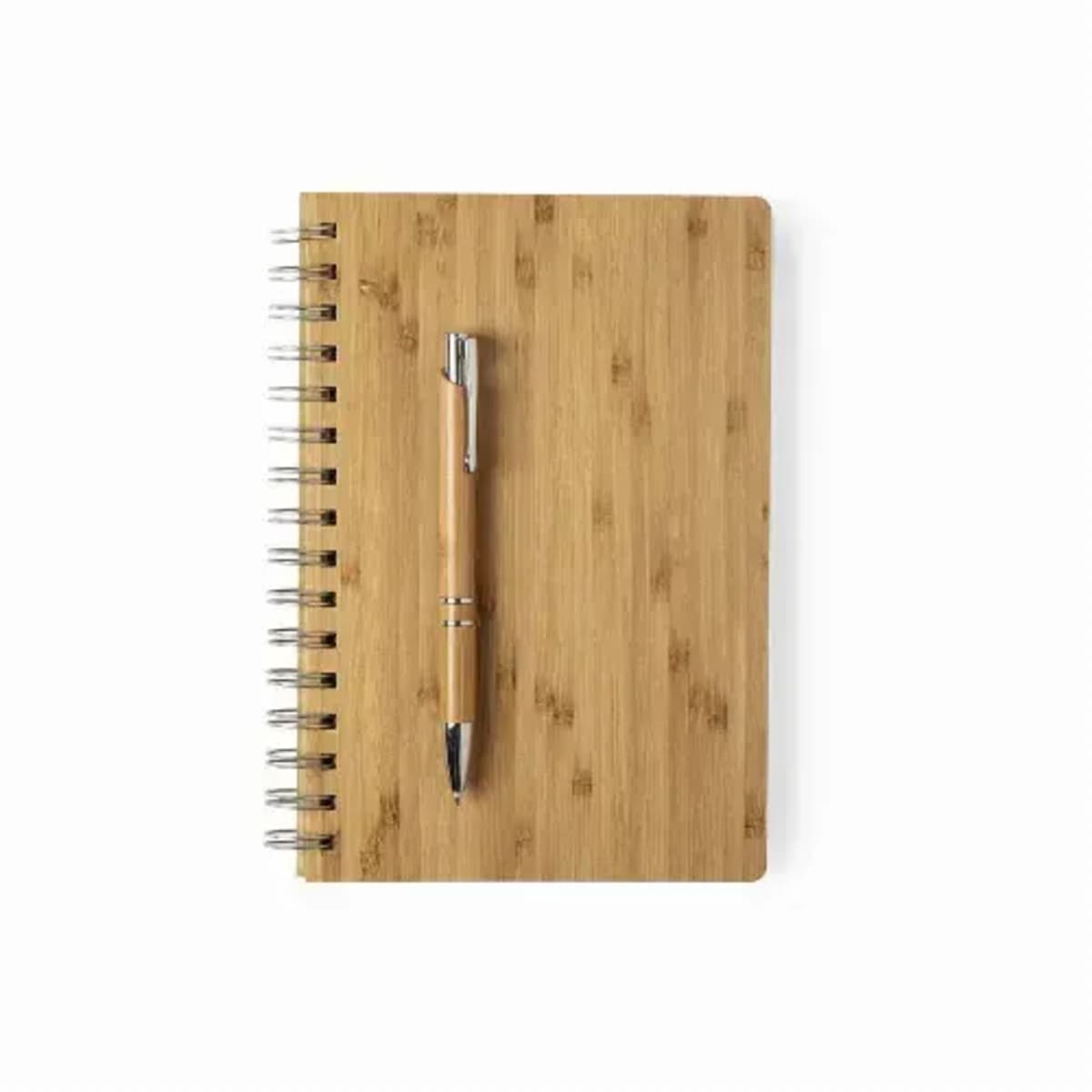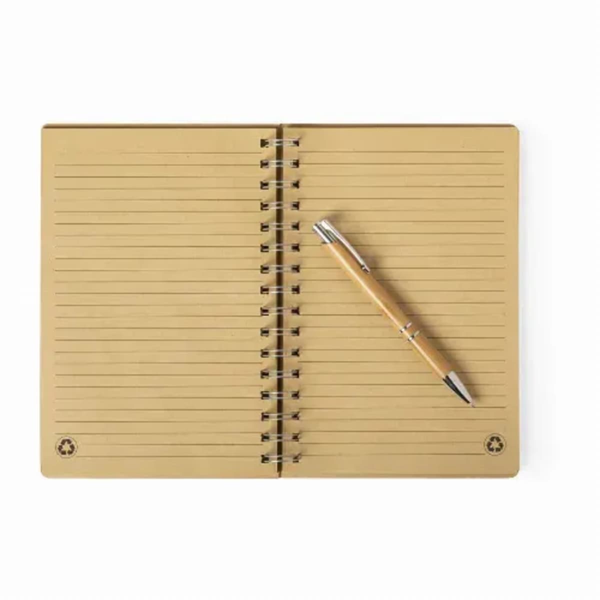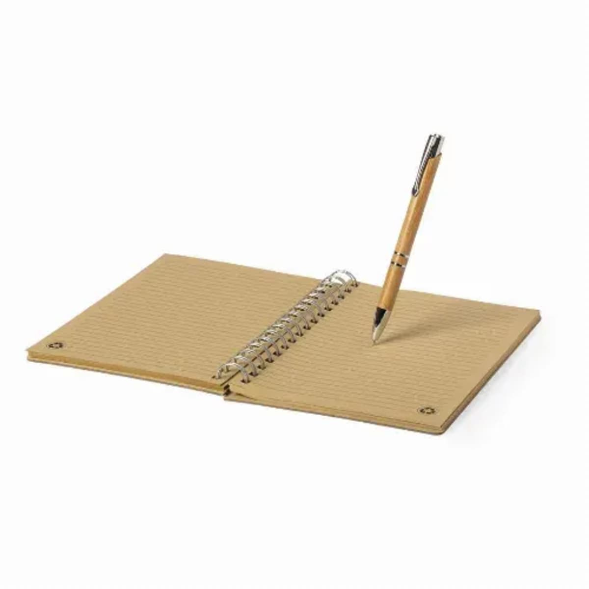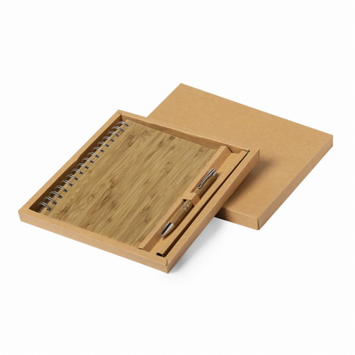 Features:  Ring notebook with hard covers in bamboo, with 80 sheets in striped layout and eco design. Ball pen with push-up mechanism, with bamboo body and metal accessories -jumbo cartridge and black ink-. Presented in a cardboard, die-cut case with eco design