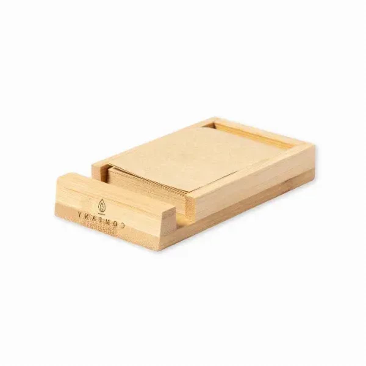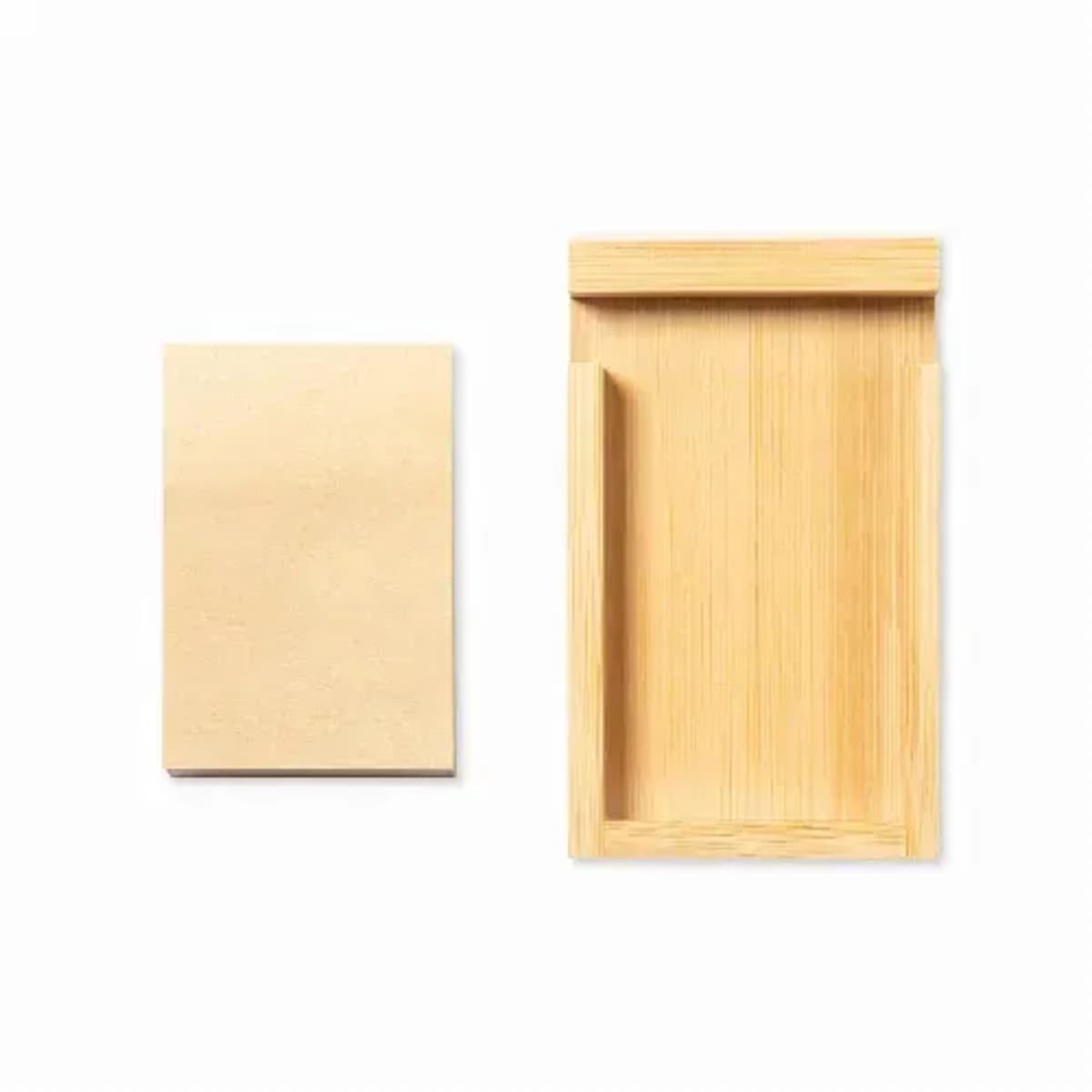 Made of bamboo, including 80 sticky notes in kraft finish. Presented in an individual box with kraft design.