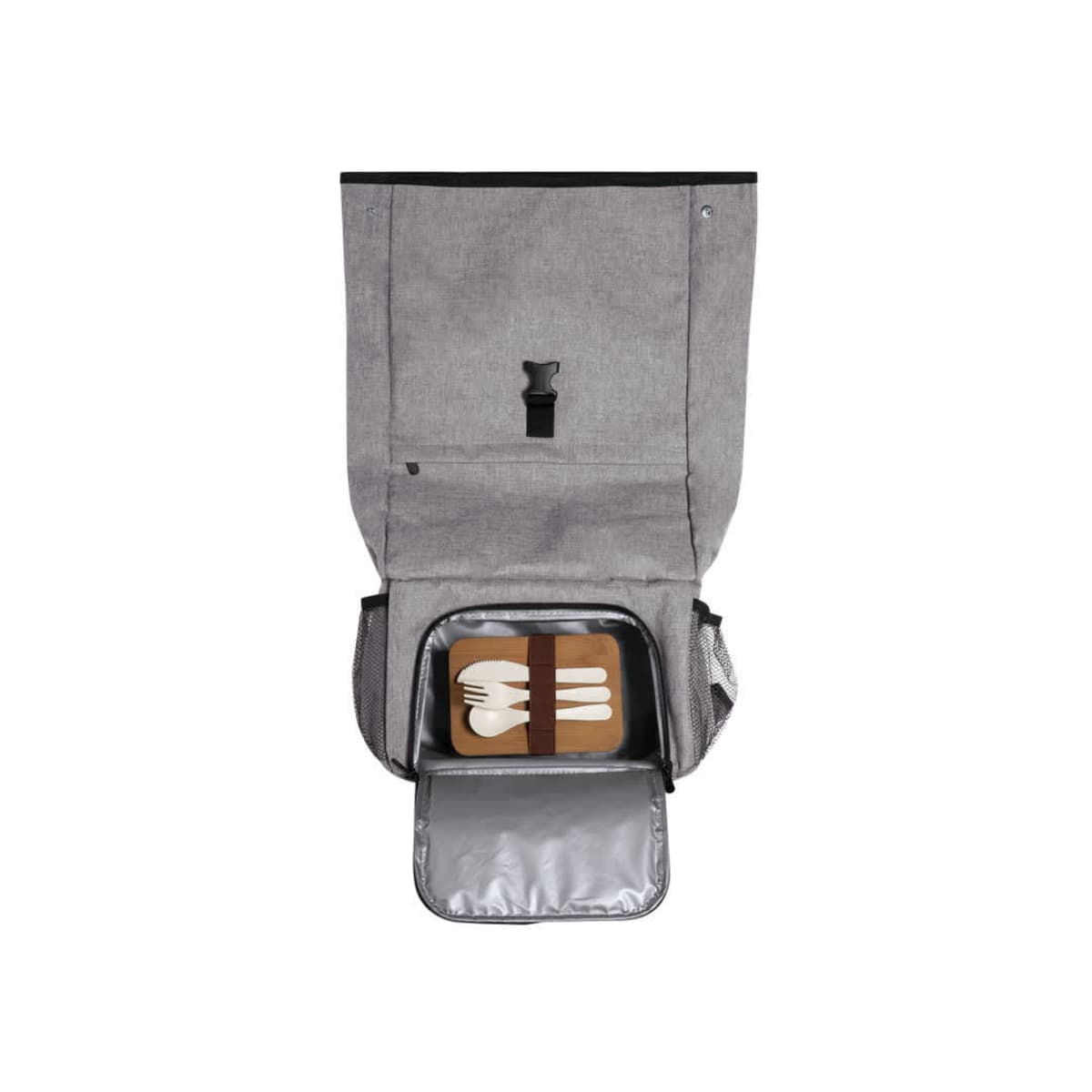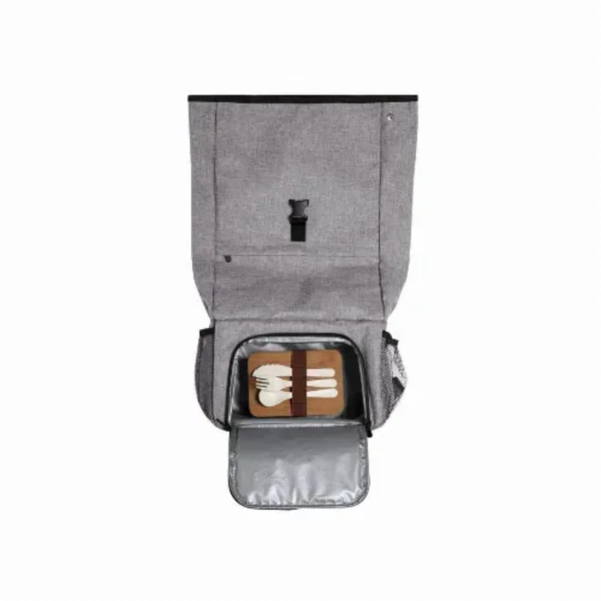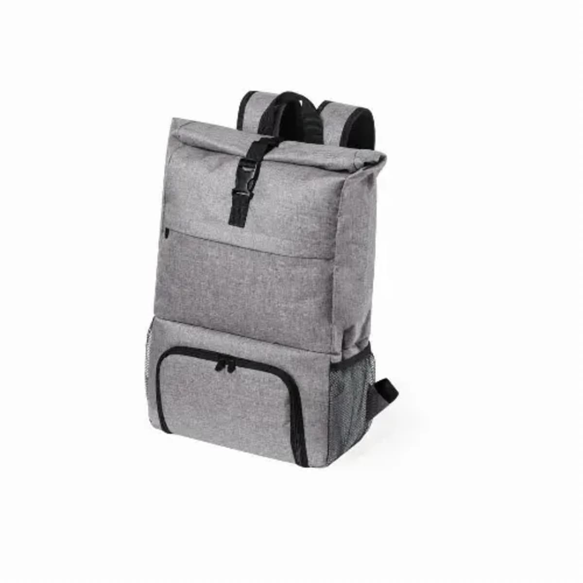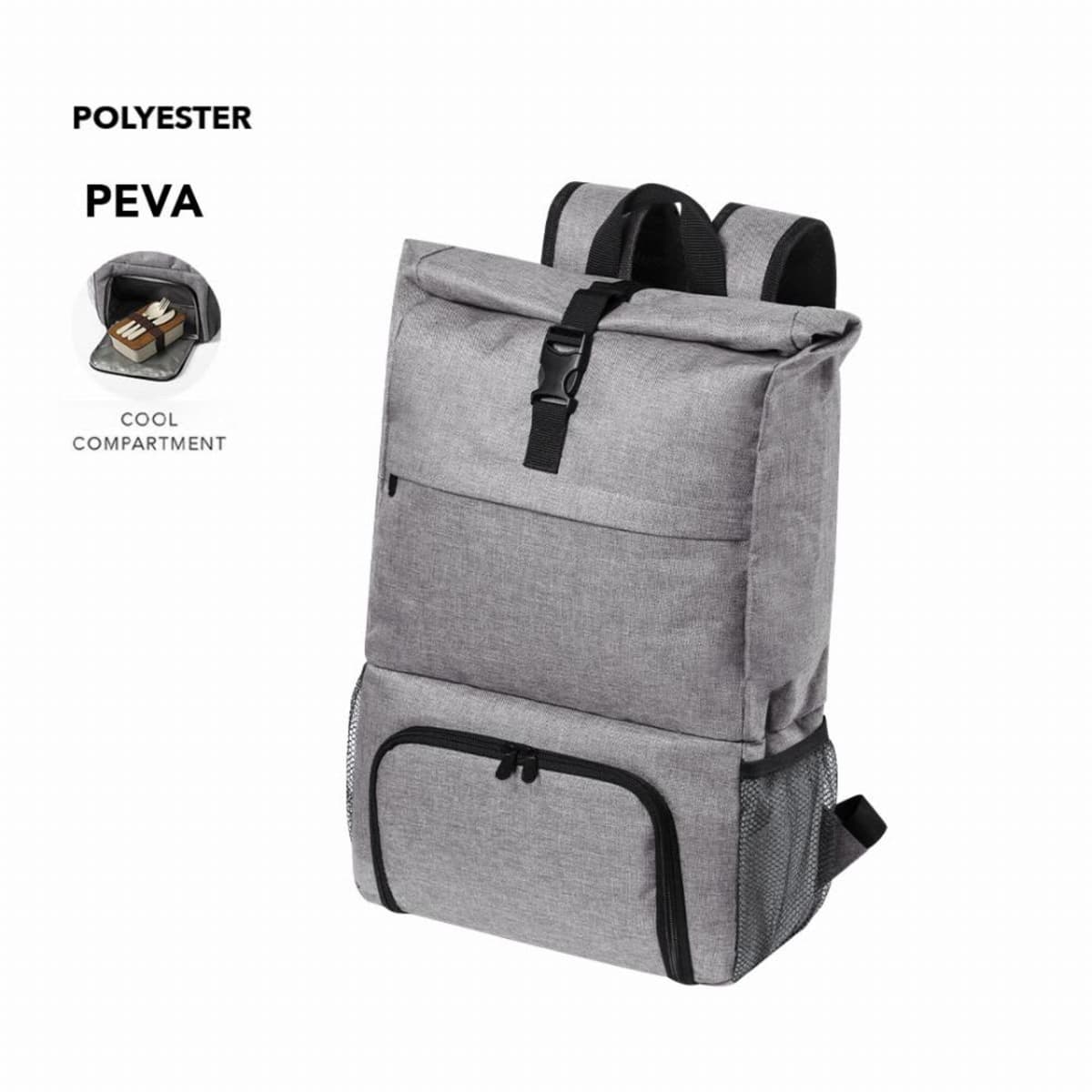 Urban design, including isothermal compartment with PEVA coating for lunchbox. Main compartment with safety buckle closure and side mesh pockets. Adjustable, padded shoulder straps.