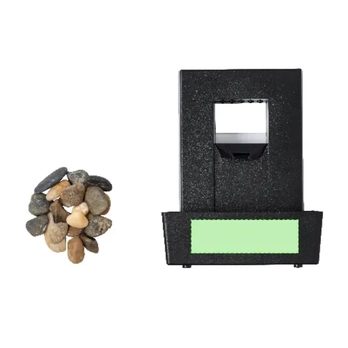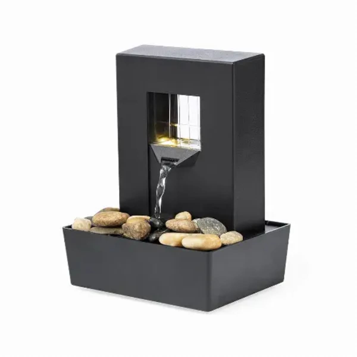 Water cascade over natural stones, ideal for decoration or relaxing moments. Including a water tank and a structure lit by LEDs in natural tones, flowing water through it. Powered by 3 AA batteries (not included). Presented in a kraft design box.