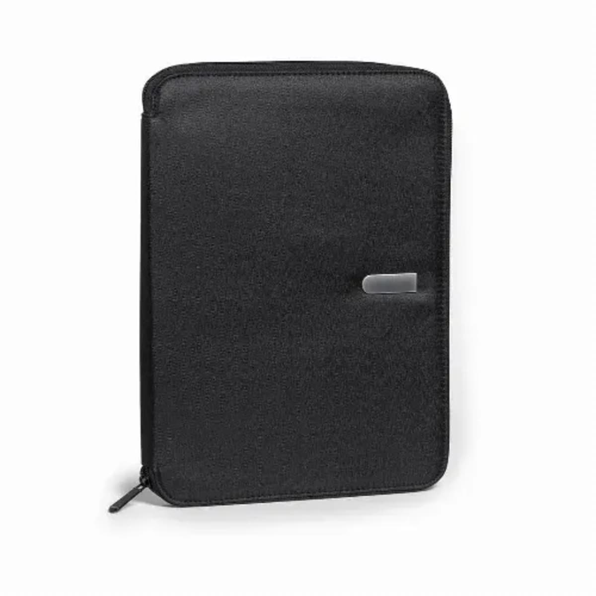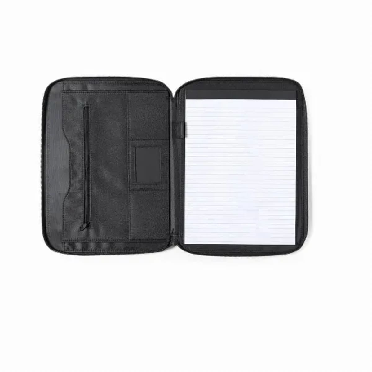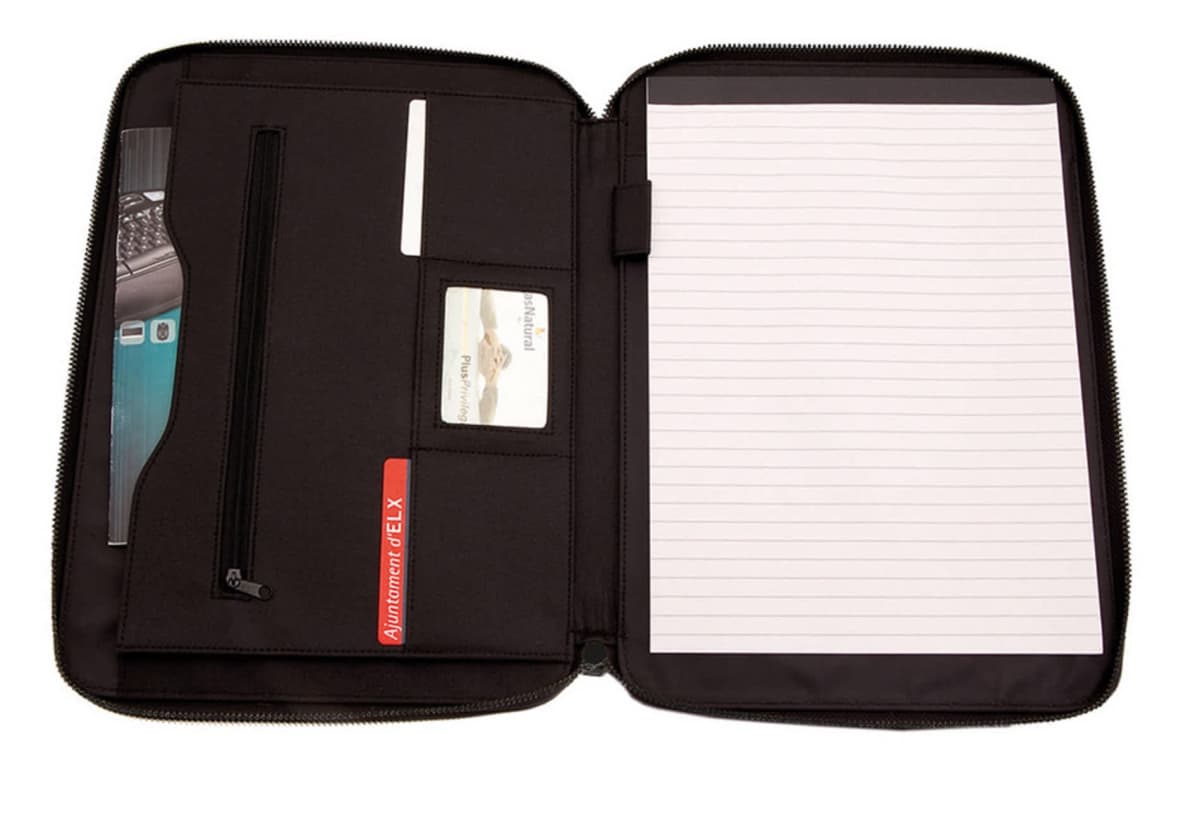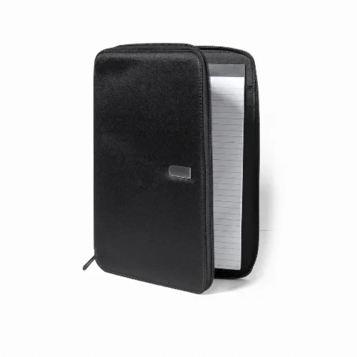 Features:  Inside with notepad of 20 sheets with striped layout, a zippered pocket, a flap pocket, card holders and a pen holder. With elegant metal plate in front for laser printing.