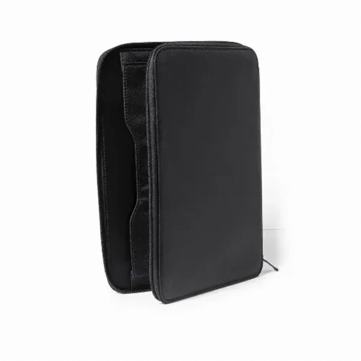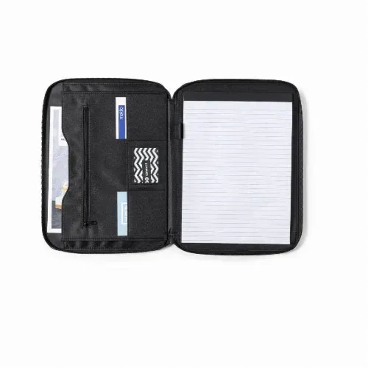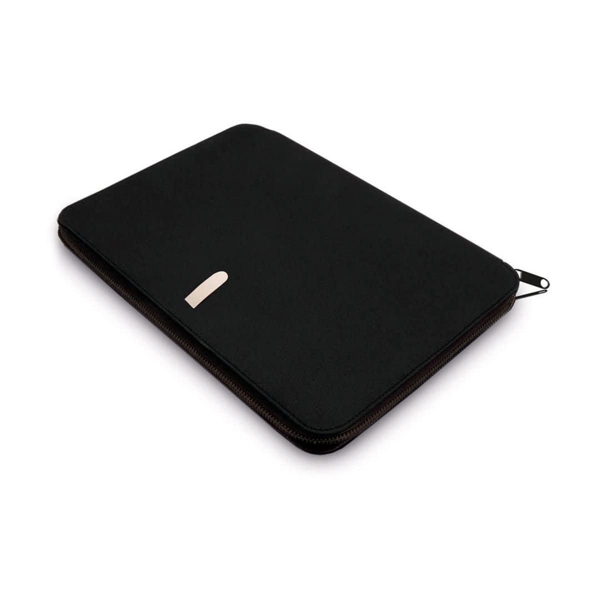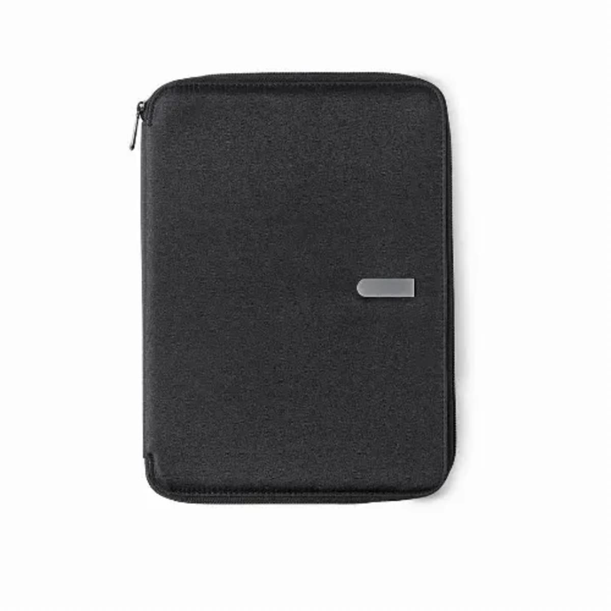 Features:  Inside with notepad of 20 sheets with striped layout, a zippered pocket, a flap pocket, card holders and a pen holder. With elegant metal plate in front for laser printing.