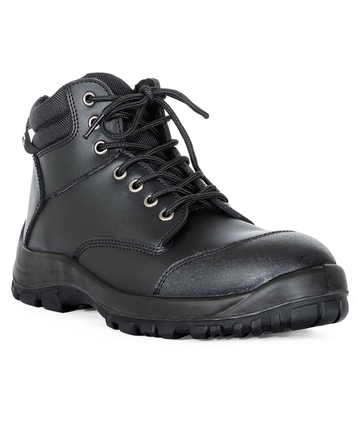 Dual Density PU injection sole construction | Fully lined with polyester mesh. Oxford padded tongue, Oxford cushion back | 200J impact resistant steel toe cap with embossed leather toe cover | Triple stitch at inner and outer sides for durability | 7 Nickel eyelets | YKK nylon zip | Toe kick & ladder grip on outer sole, shock absorbing heel | Oil resistant, Anti-static sole | SRC slip resistant sole | Individually boxed, carton of 5 | Meets AS 2210.3:2019 Certified by BSI BMP No 622279
