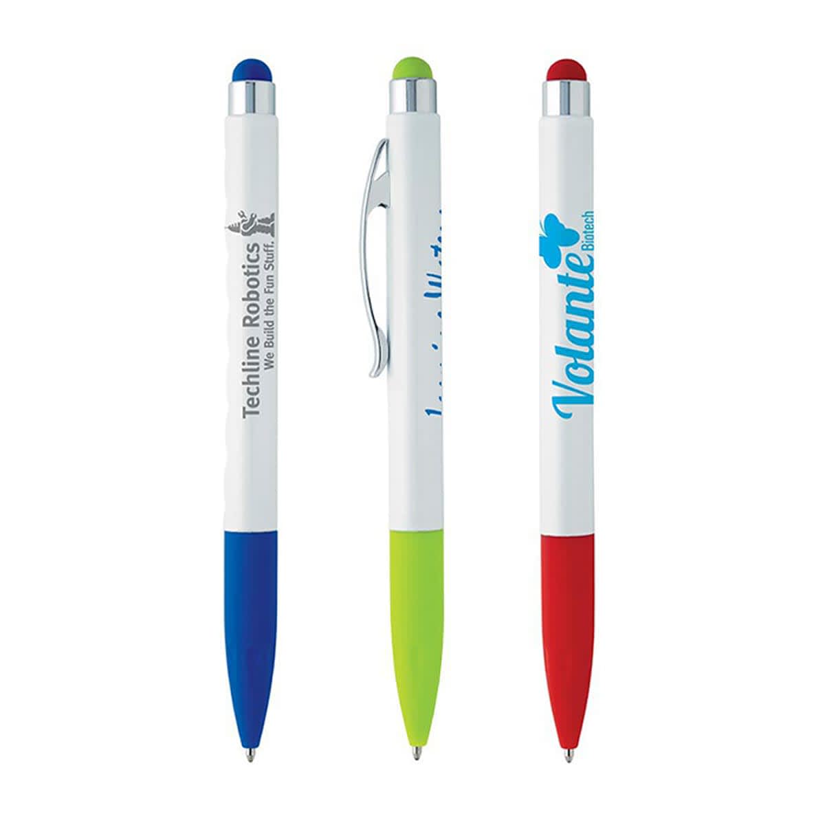 With a built in soft-touch stylus matching the colourful accent of each design, the pens are truly jewelling. Make a delicate impact with your branding. Comes with black ink.