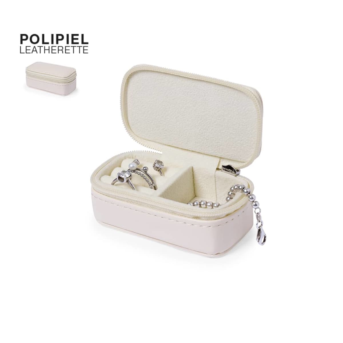 Natural colour design with zip closure and two compartments inside. One compartment in the shape of a box and another compartment with pads for rings and earrings, lined with soft fabric. Presented in an individual paper bag.