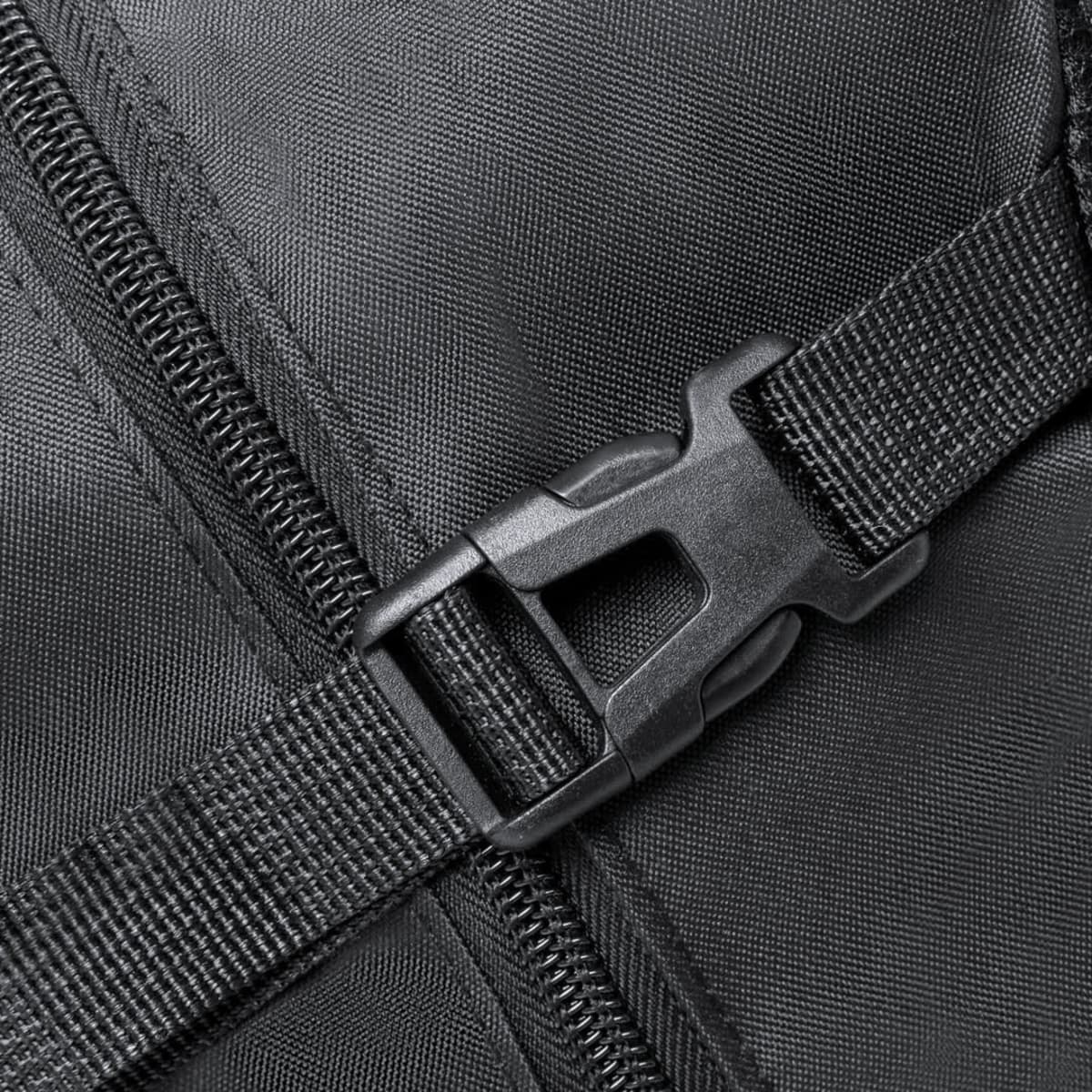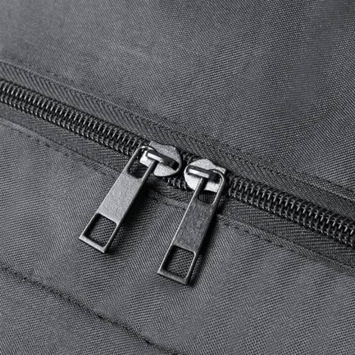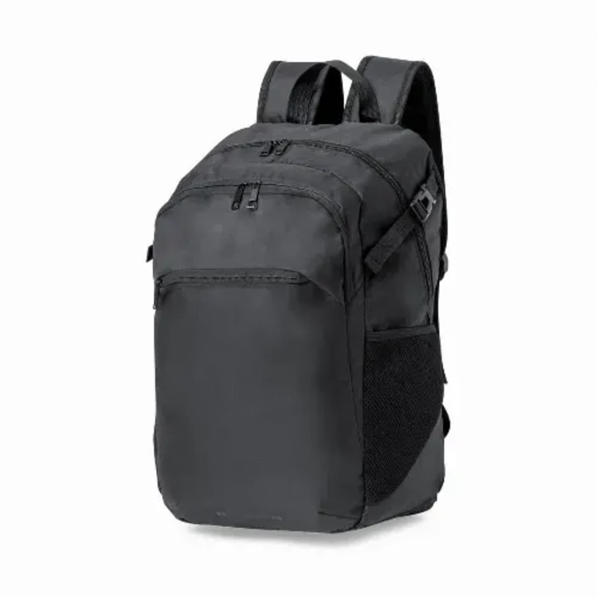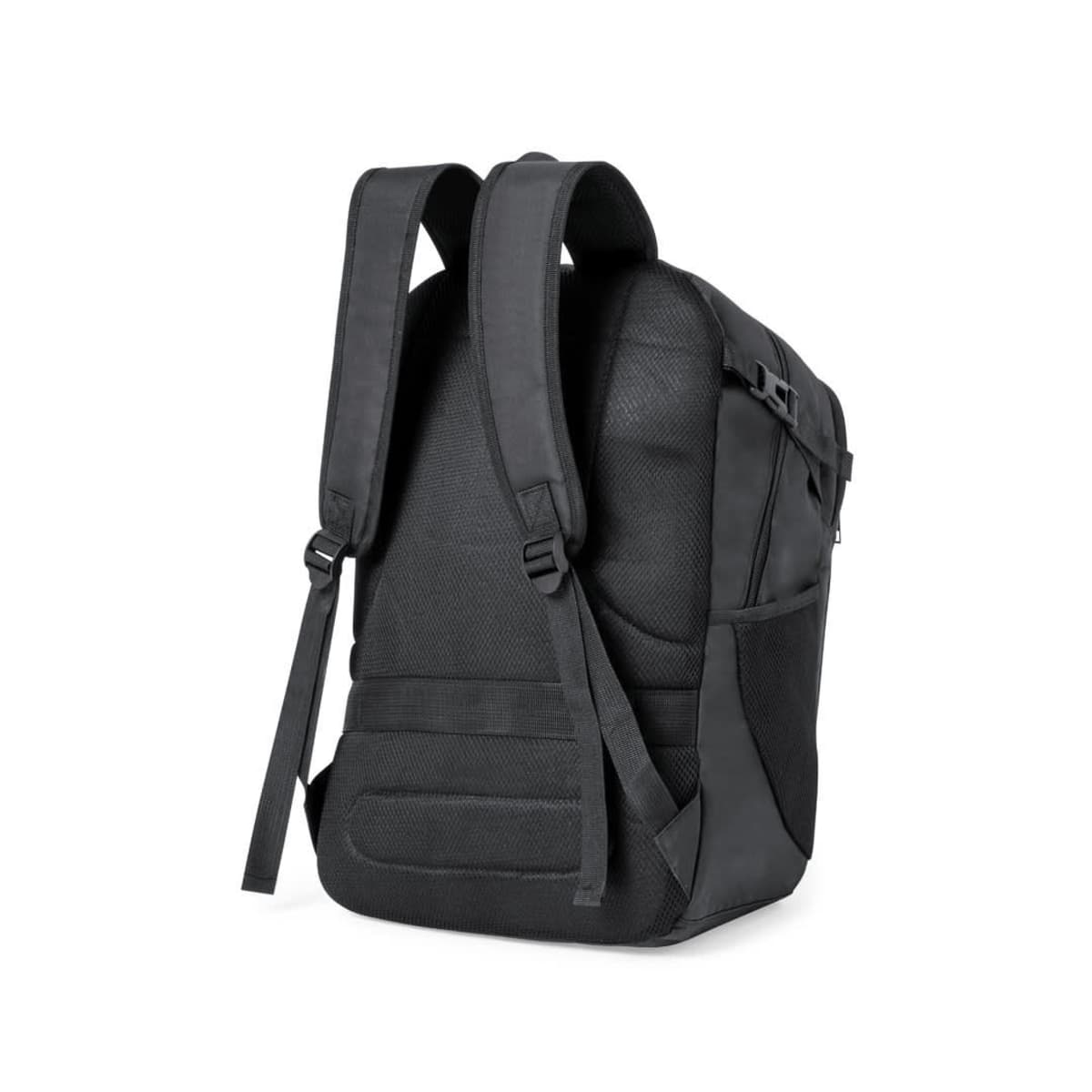 Main compartment and outside pockets with matching zip closure carrying handle and side pockets. Side adjustment straps with buckle closure and brand logo on base. Padded inner compartments for laptop up to 17 inches and tablet up to 10 inches. Padd