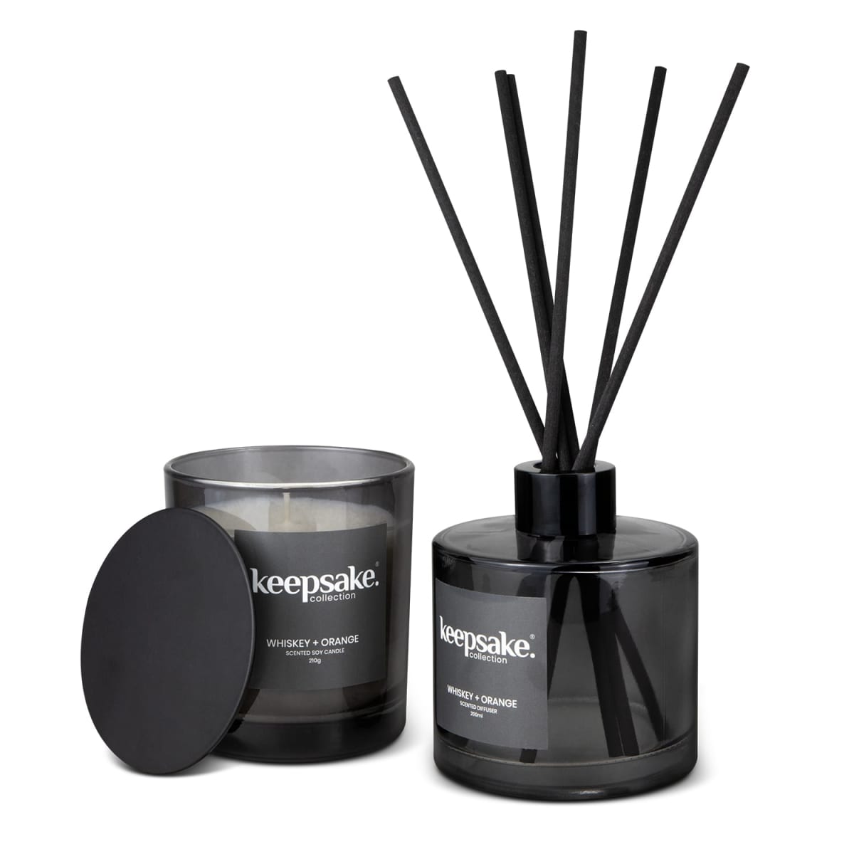 Elevate your home ambiance with this stylish candle and diffuser set. This sophisticated set includes a scented candle complete with a sleek black lid, and a matching diffuser paired with black reed sticks, all designed to infuse your space with the invigorating scent of whiskey and orange. Beautifully packaged in a natural gift box with Keepsake branded sleeve, it makes an ideal branded gift or a luxurious treat for yourself Transform any room with this elegant and aromatic set.