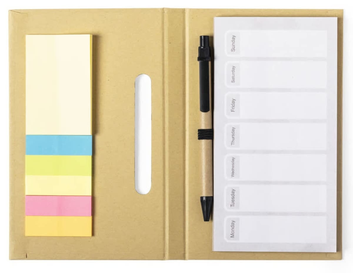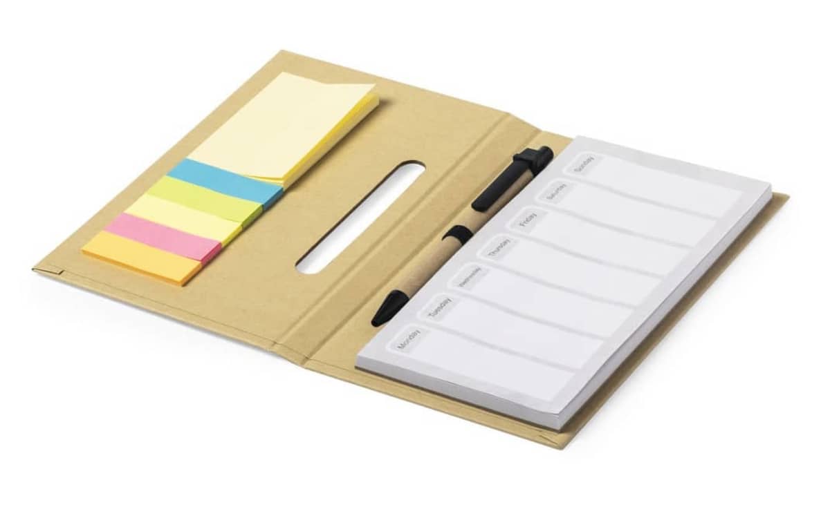 Hard covers in recycled cardboard, with ball pen holder and 60 sheets for weekly planning. Including 25 medium sized adhesive notes and 125 mini adhesive notes. Ball pen with push-up mechanism, with body in recycled cardboard -blue ink-.