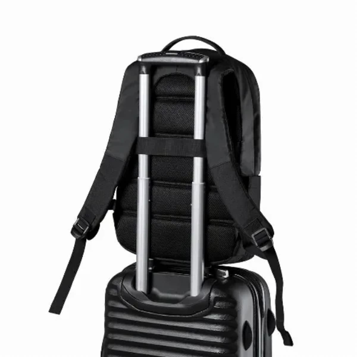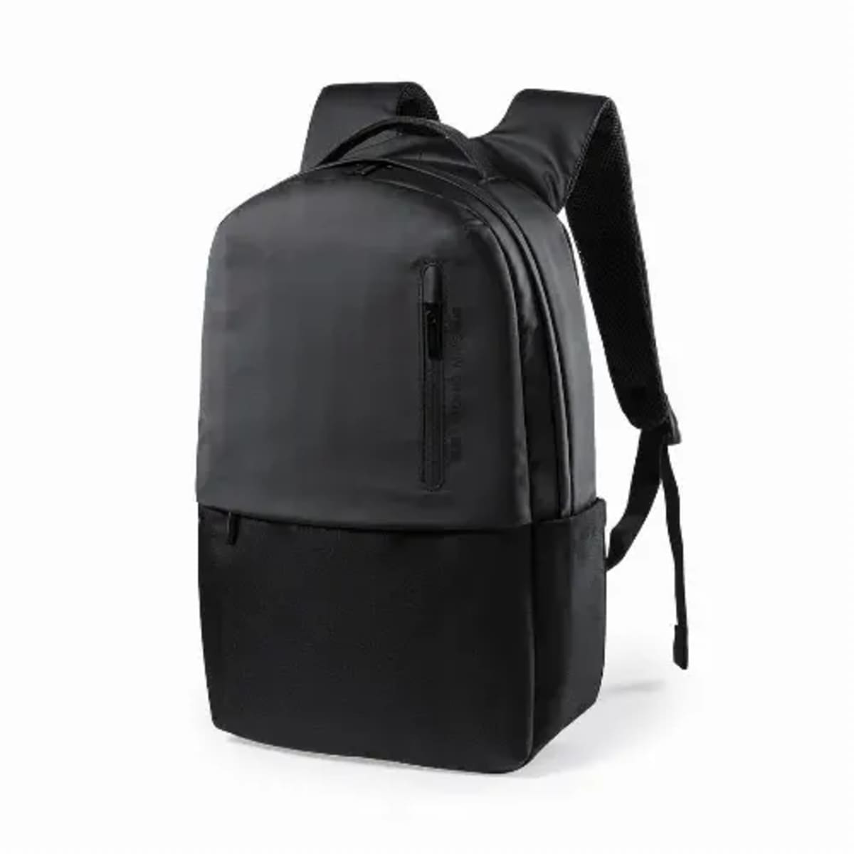 With zip closure, front pocket and reinforced metal handle. Ergonomically padded back and shoulder straps, with padded inside compartment for laptops up to 15 inches and tablets up to 10 inches. Inner sleeves for pens and smartphone. With brand logo