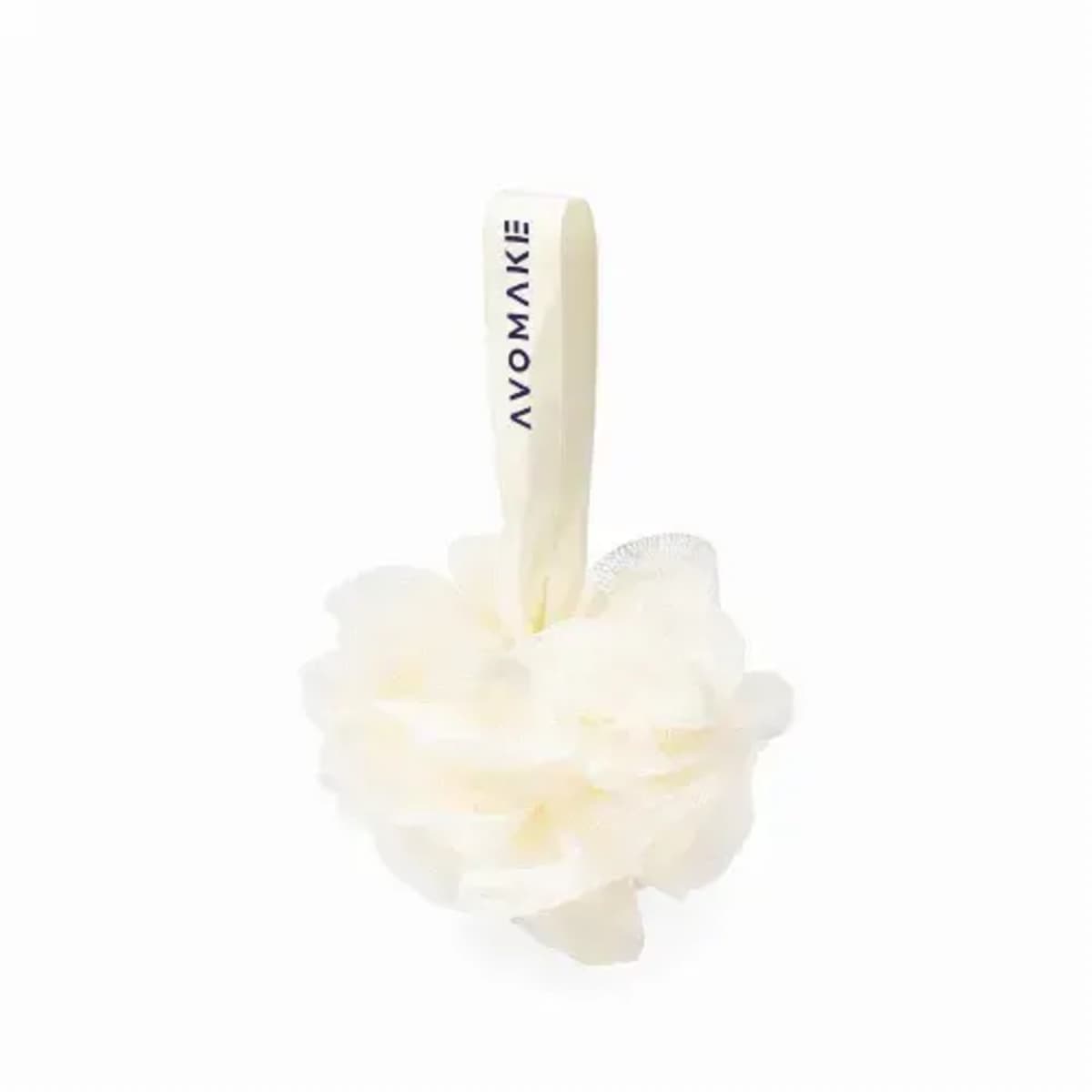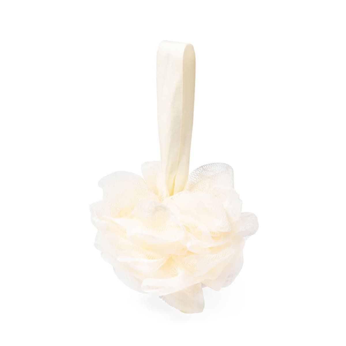 Soft bath sponge made of PE fibre, with matching fastening strap and a large printing surface..