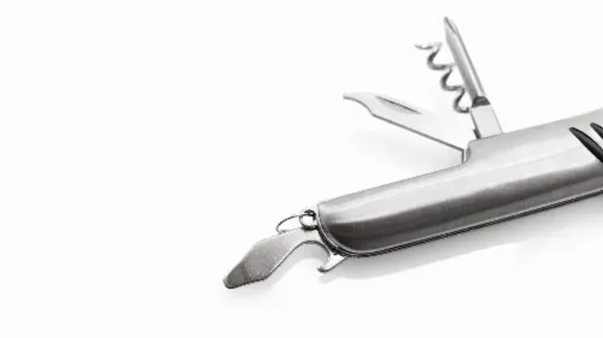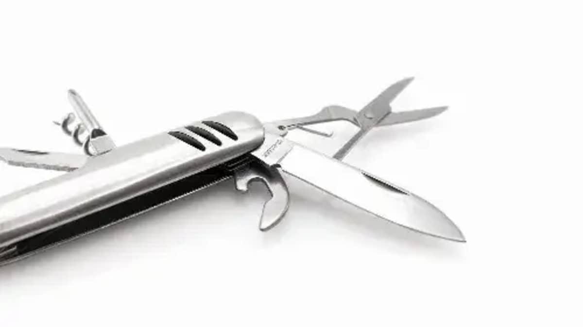 Multi purpose 10-function stainless steel knife with non-slip handle.