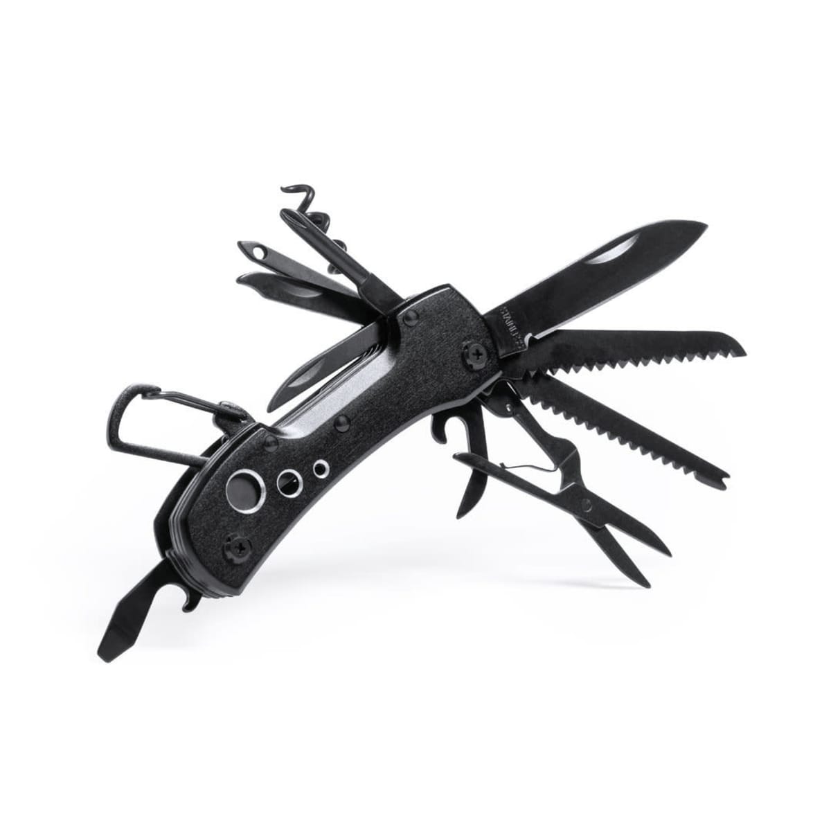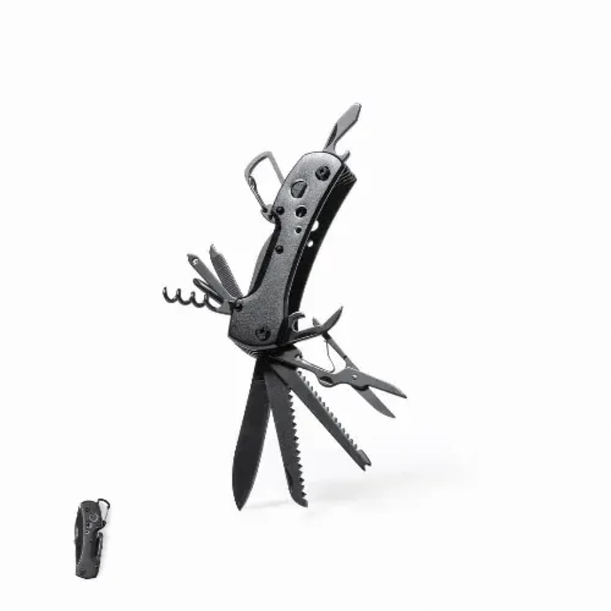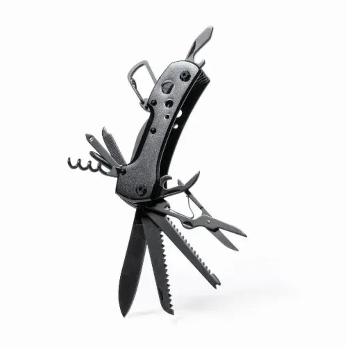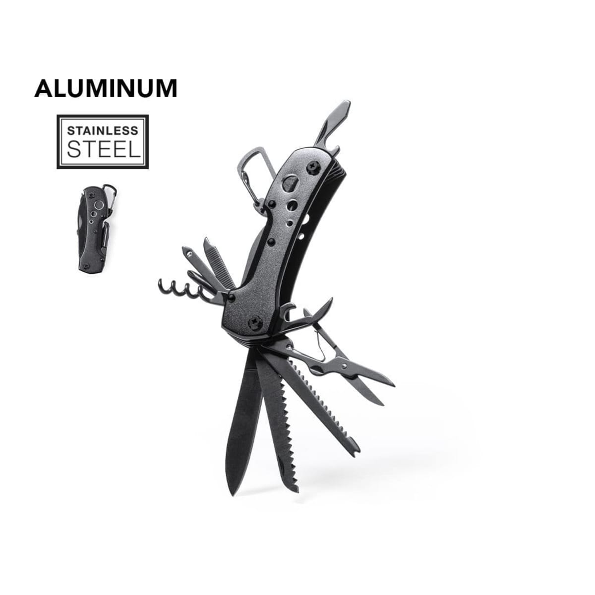 Matching resistant aluminium handle with integrated carabiner. 13 functions, including knife, screwdriver, file, opener, and scissors. Foldable and compact in size, presented in an individual box in black design.