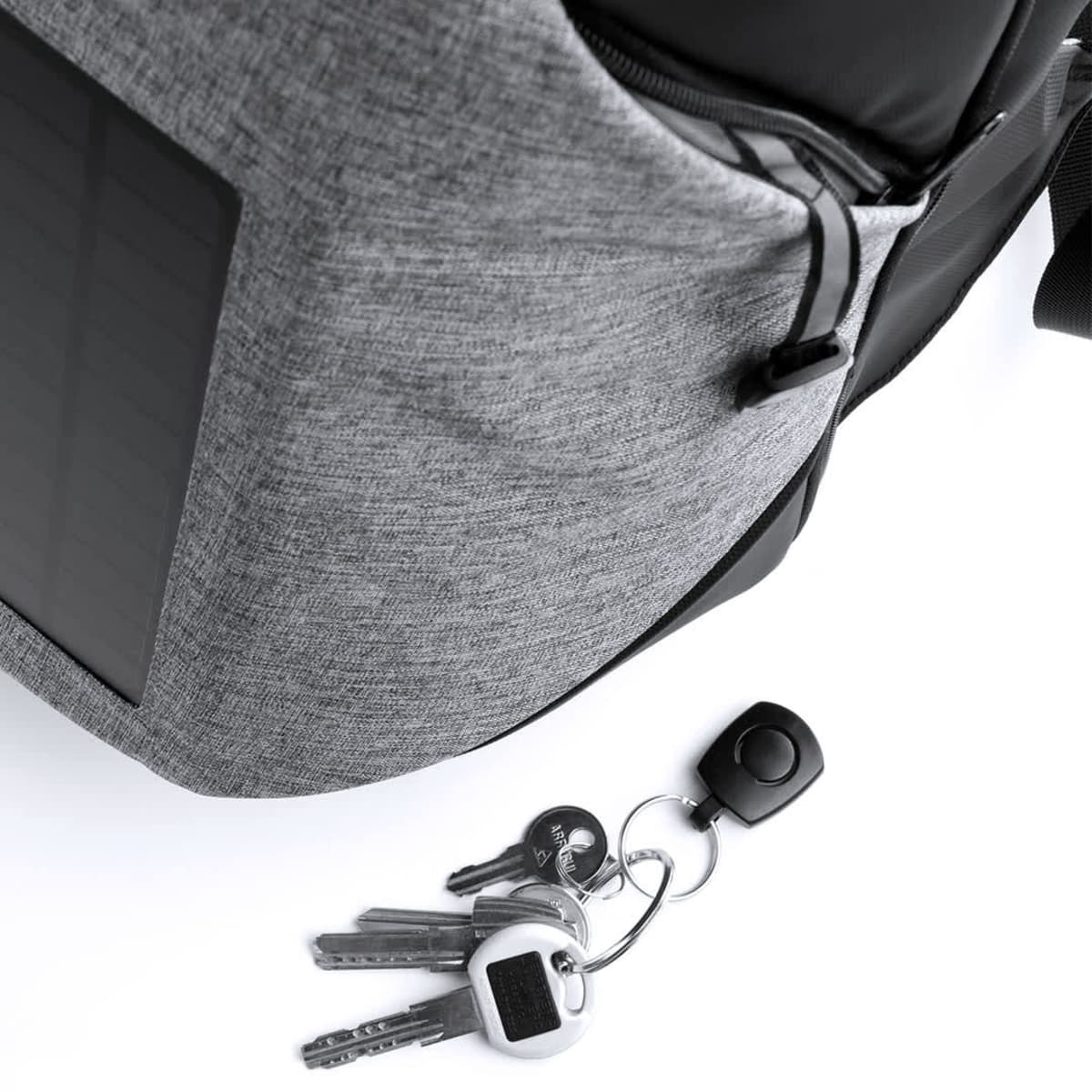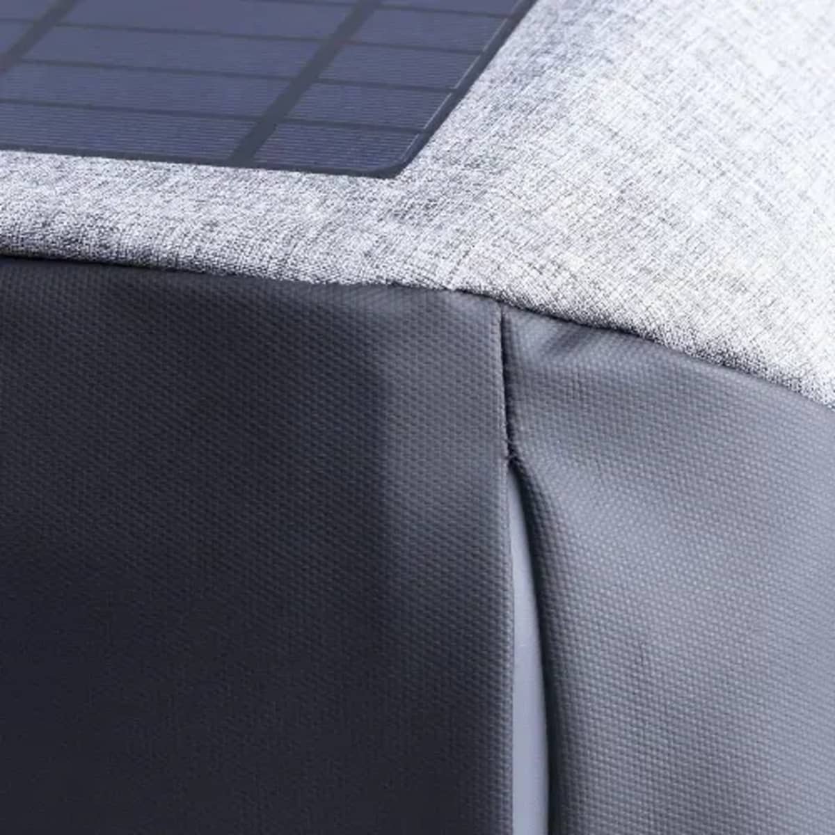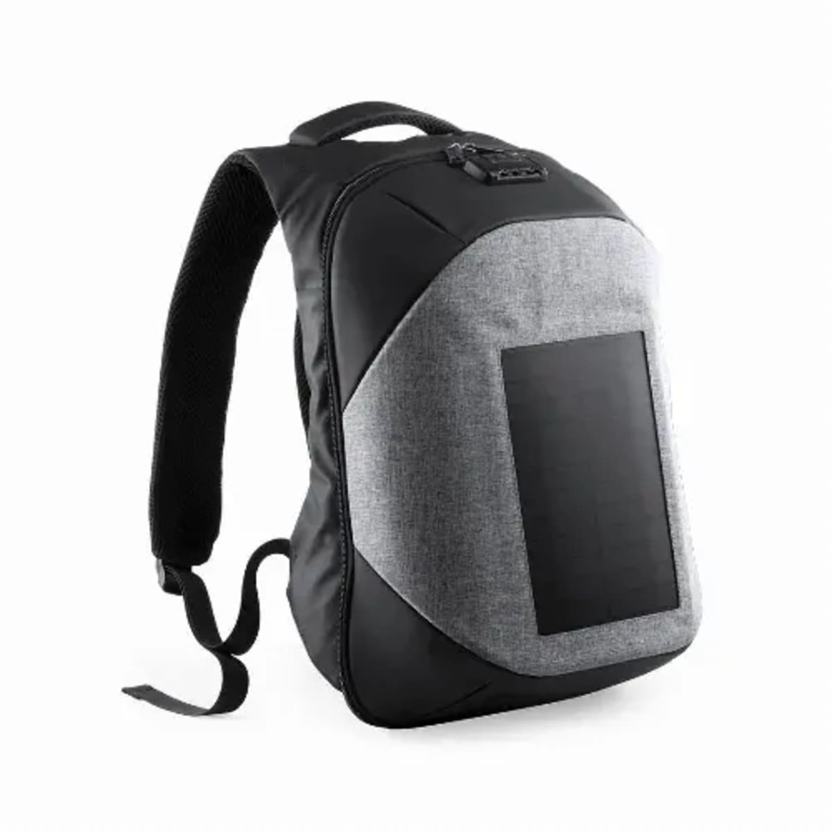 Backpack with integrated solar power panel in resistant 1200D polyester.