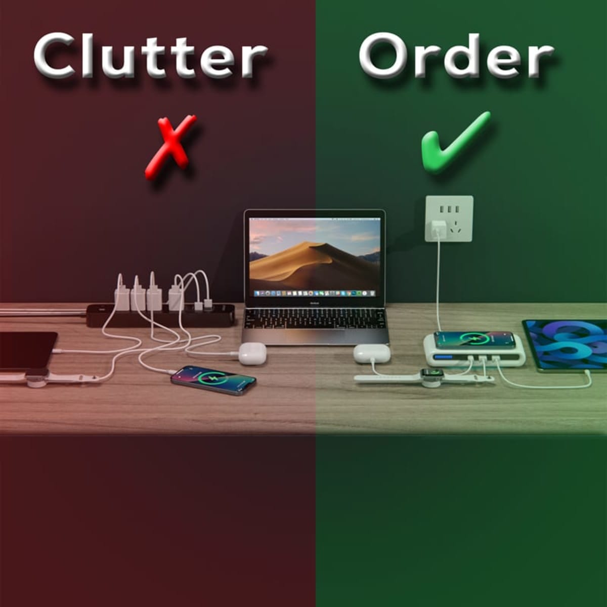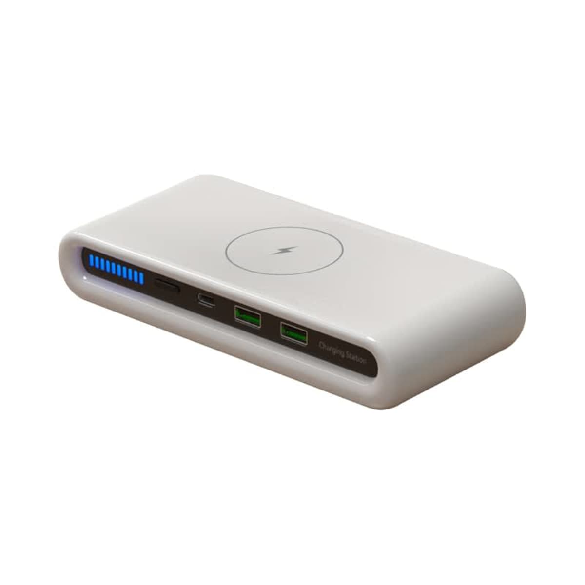 Bid farewell to the chaos of messy cables with the Korda multifunctional charging station. Delivering 15 Watts of wireless power to your Qi-compatible devices, the side indicator lets you quickly find your phone in the dark and adjust the ambient light at the bottom by pressing the on/off button. The sleek-looking Korda has three additional USB fast charging ports, allowing simultaneous charging of multiple devices. Equipped with Foreign Object Detection, the charger protects against over-current, over-voltage, and short-circuit, ensuring this multi-port charging dock is safe and worry-free. Please Note: Your phone must support fast charging, and for optimal performance, you use a Quick Charge 3.0 wall adaptor (not included). Includes Type-C charge cable and user manual. Material: ABS, PC.