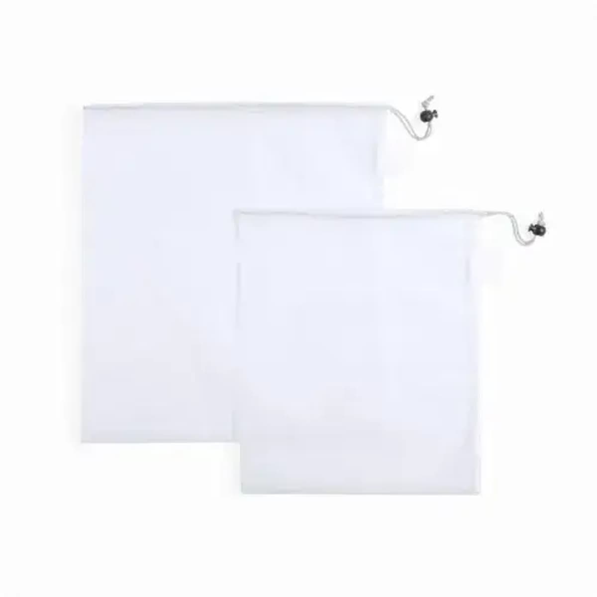 Set of reusable bags Manufactured in mesh polyester String closure and adjusting accessory Including 2 bags (1 bag 30x35 cm, 1 bag 25x30 cm)