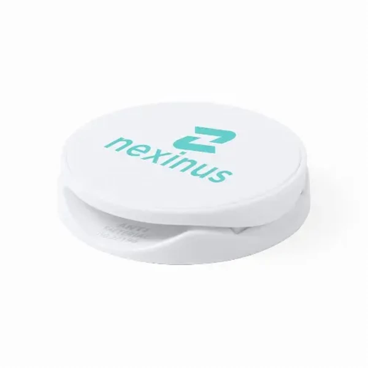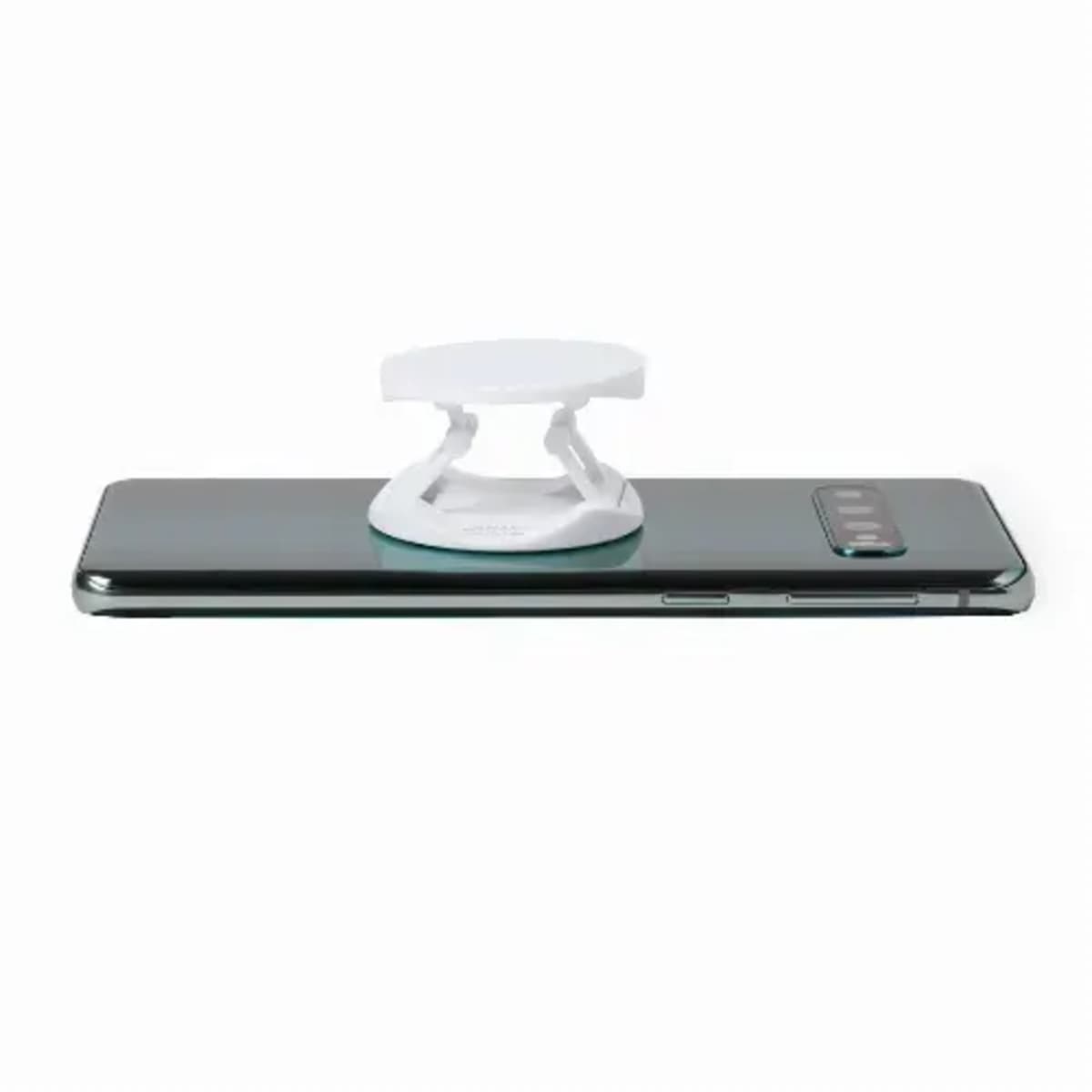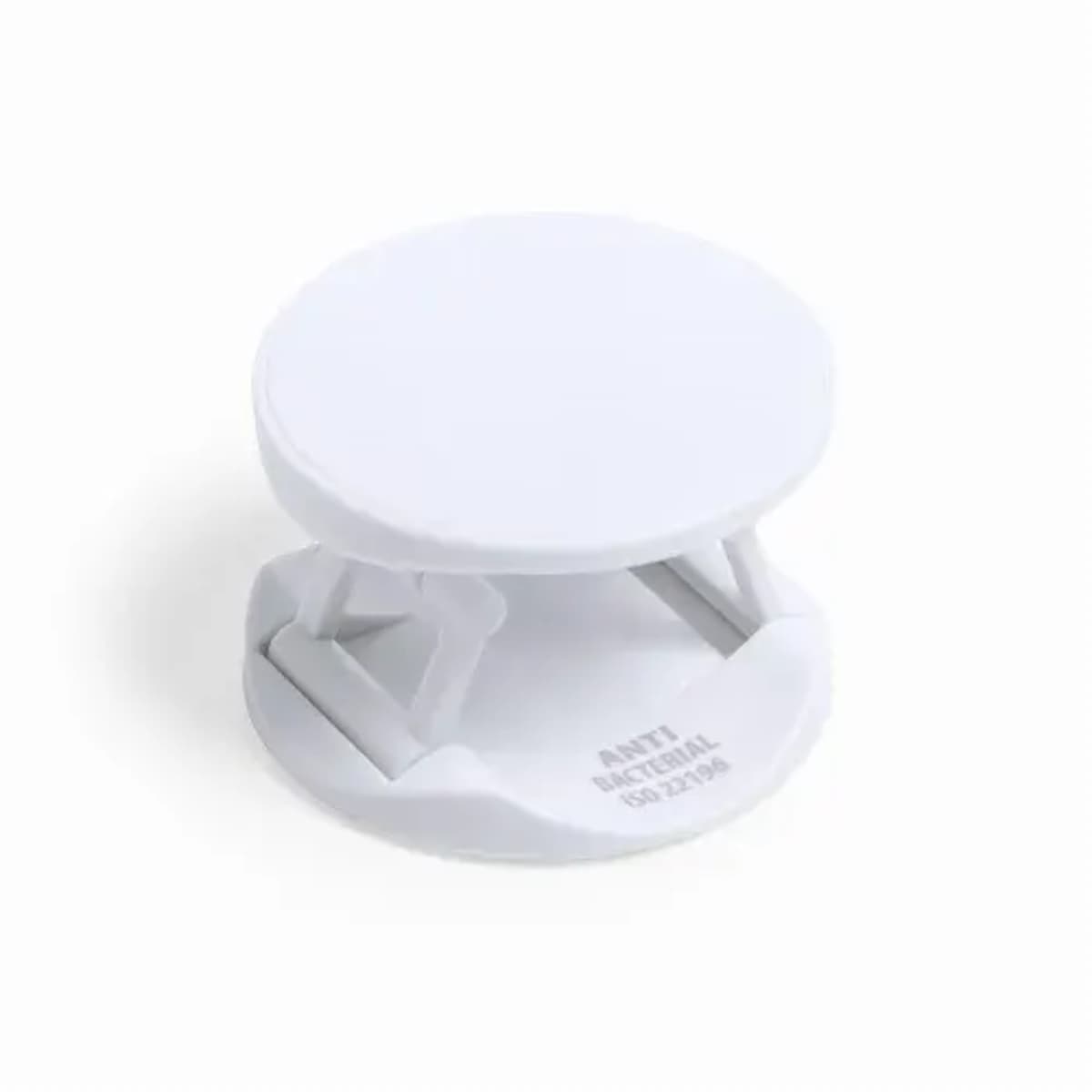 Antibacterial, folding holder for smartphone in an elegant, white color design.