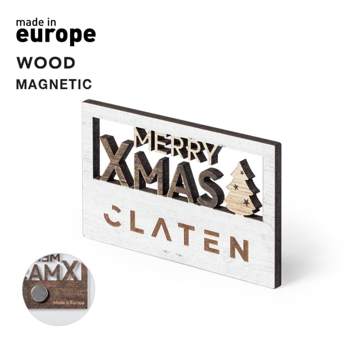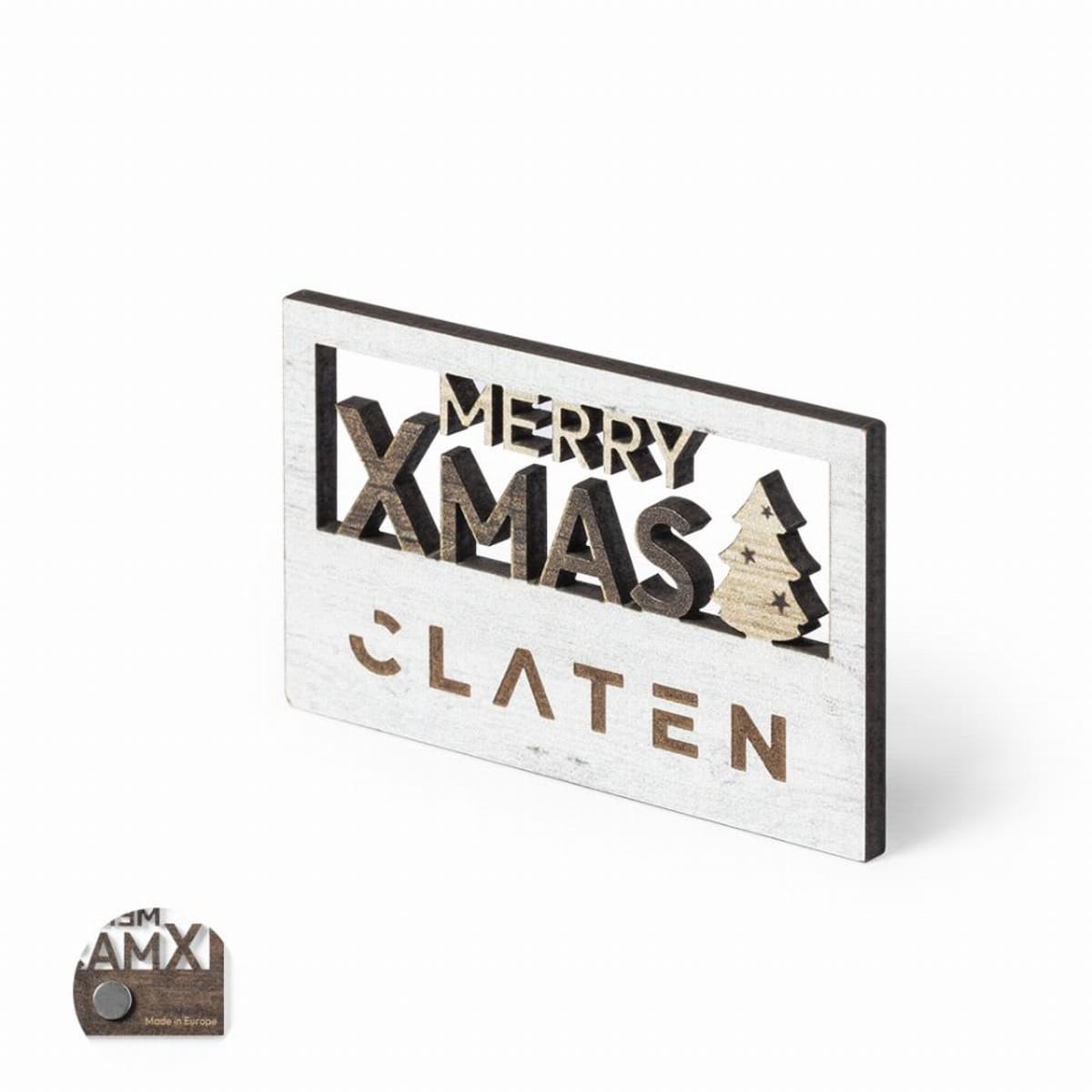 Genuine Merry Christmas magnet made of natural wood, with die-cut text and original bicolor finish.