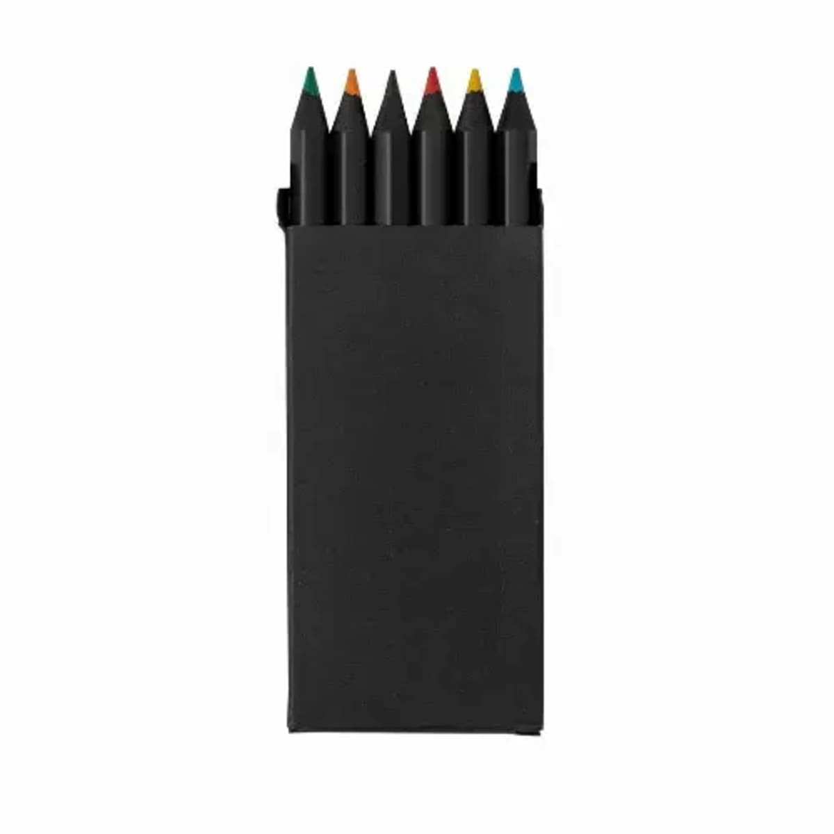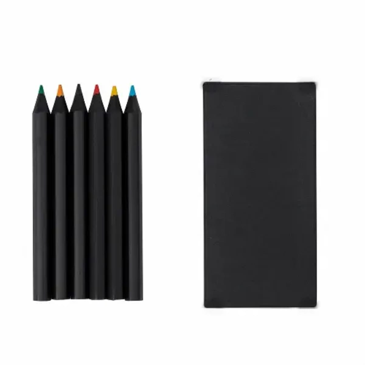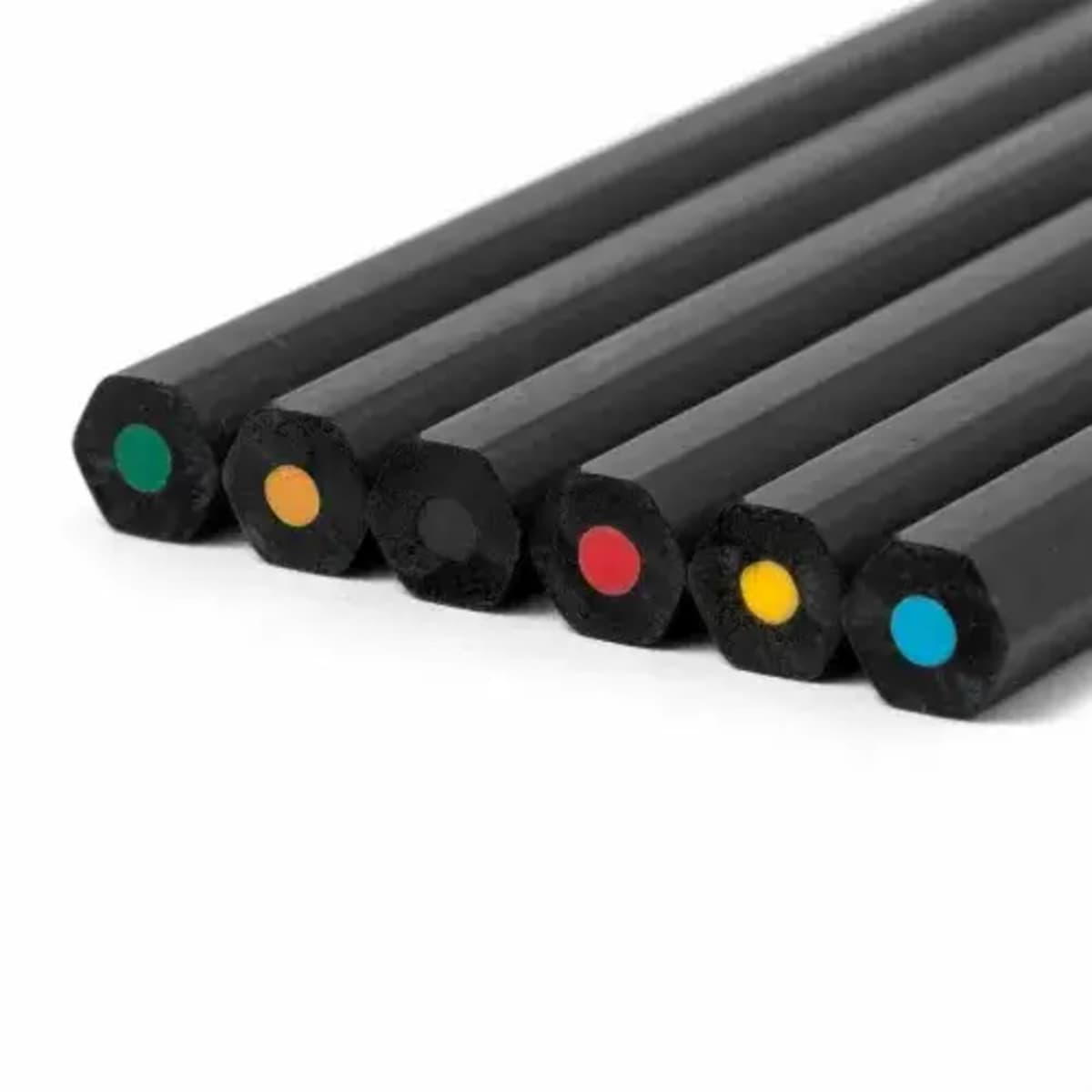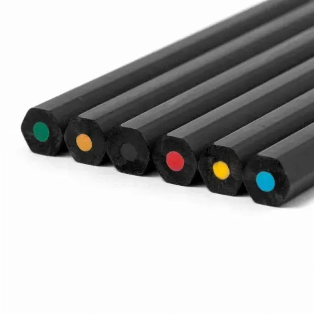 Set of 6 wooden pencils finished in black, with hexagonal body and leads in various colours.