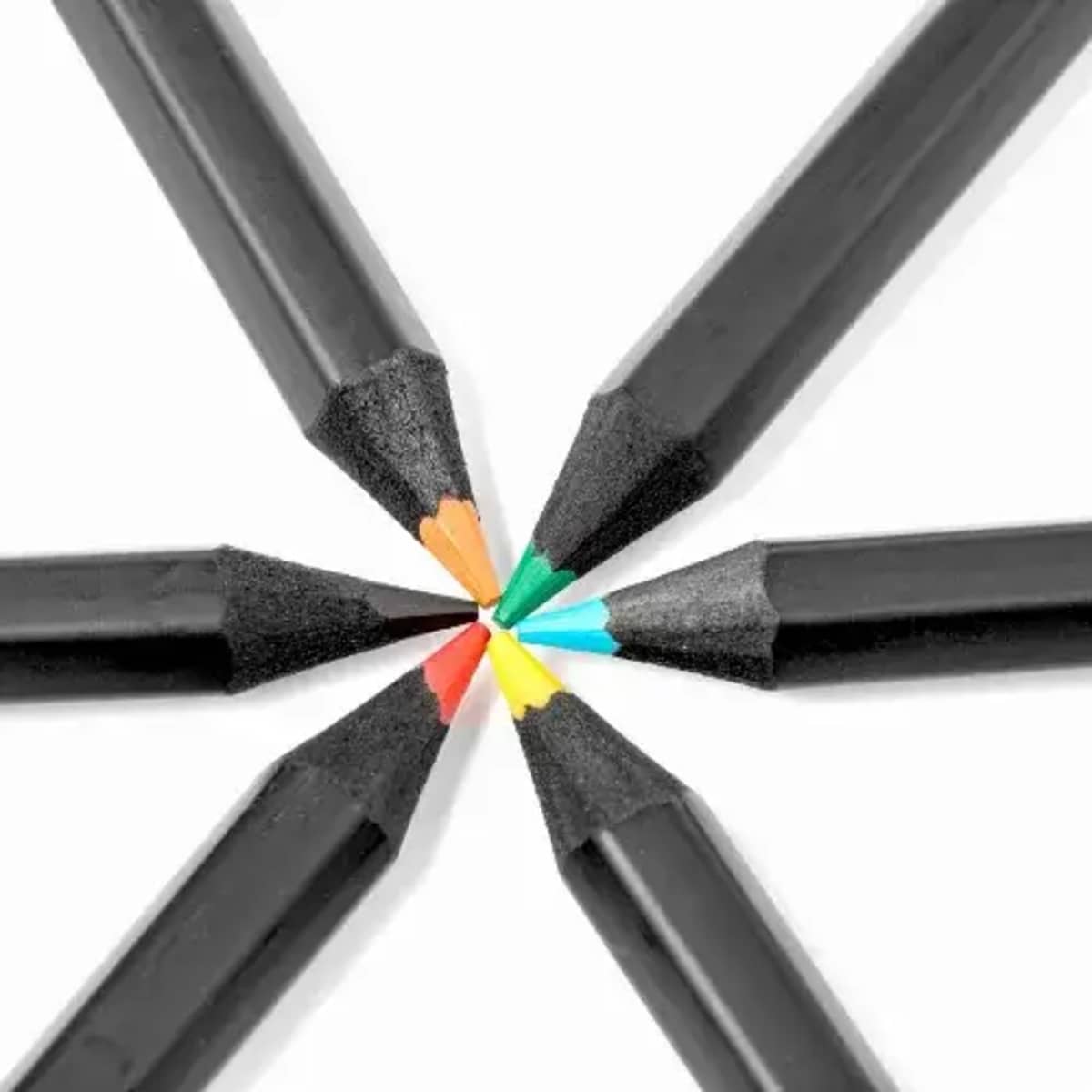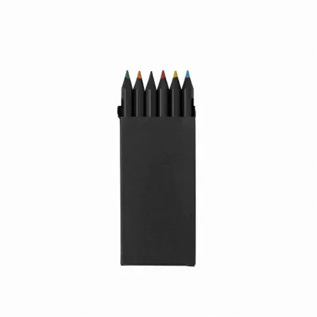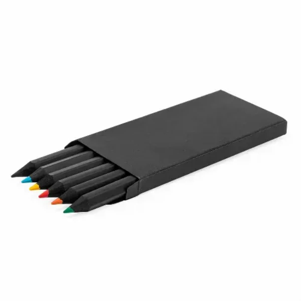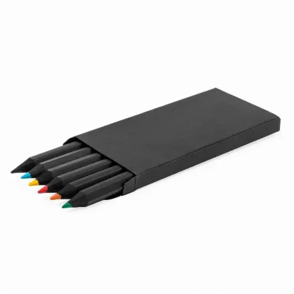 Set of 6 wooden pencils finished in black, with hexagonal body and leads in various colours.