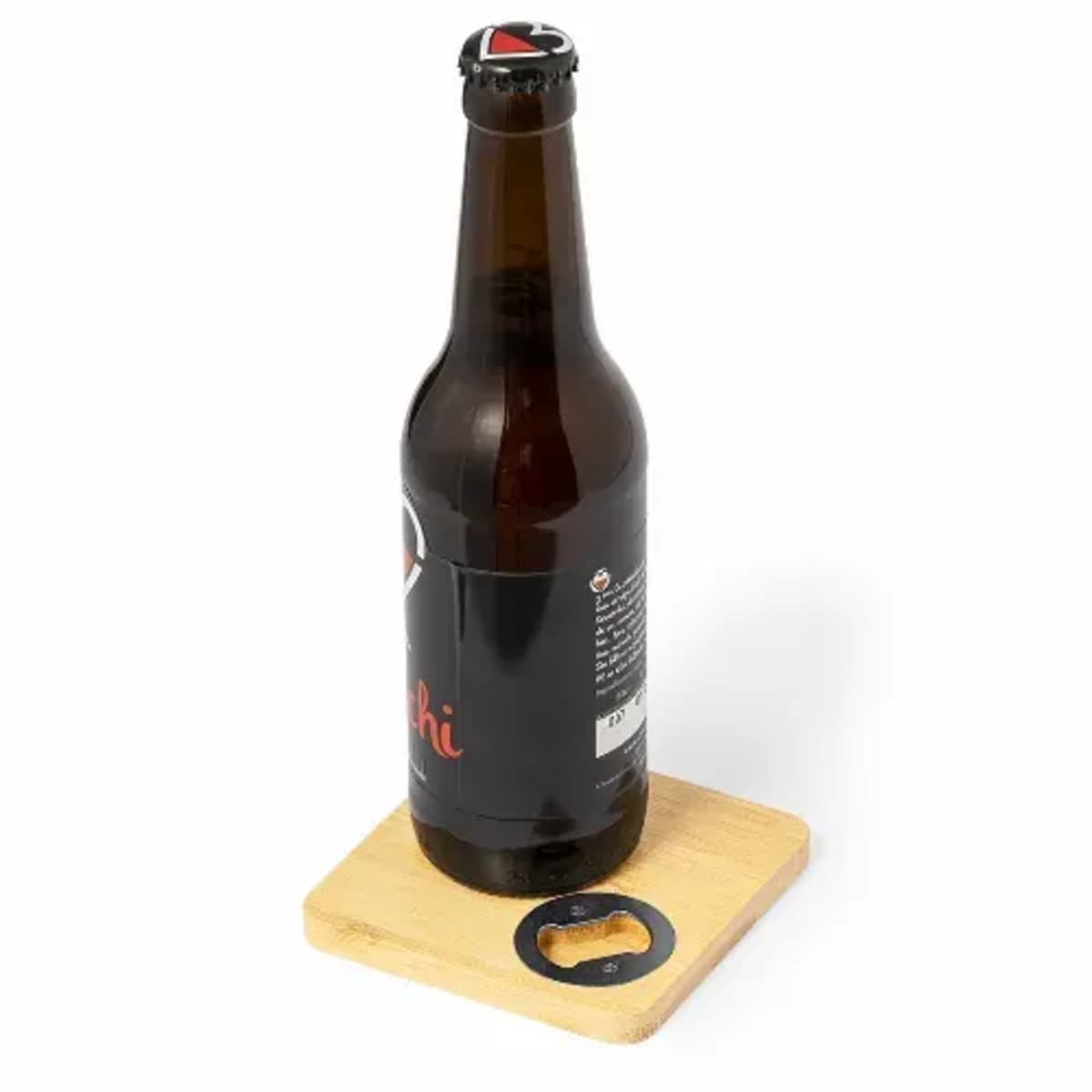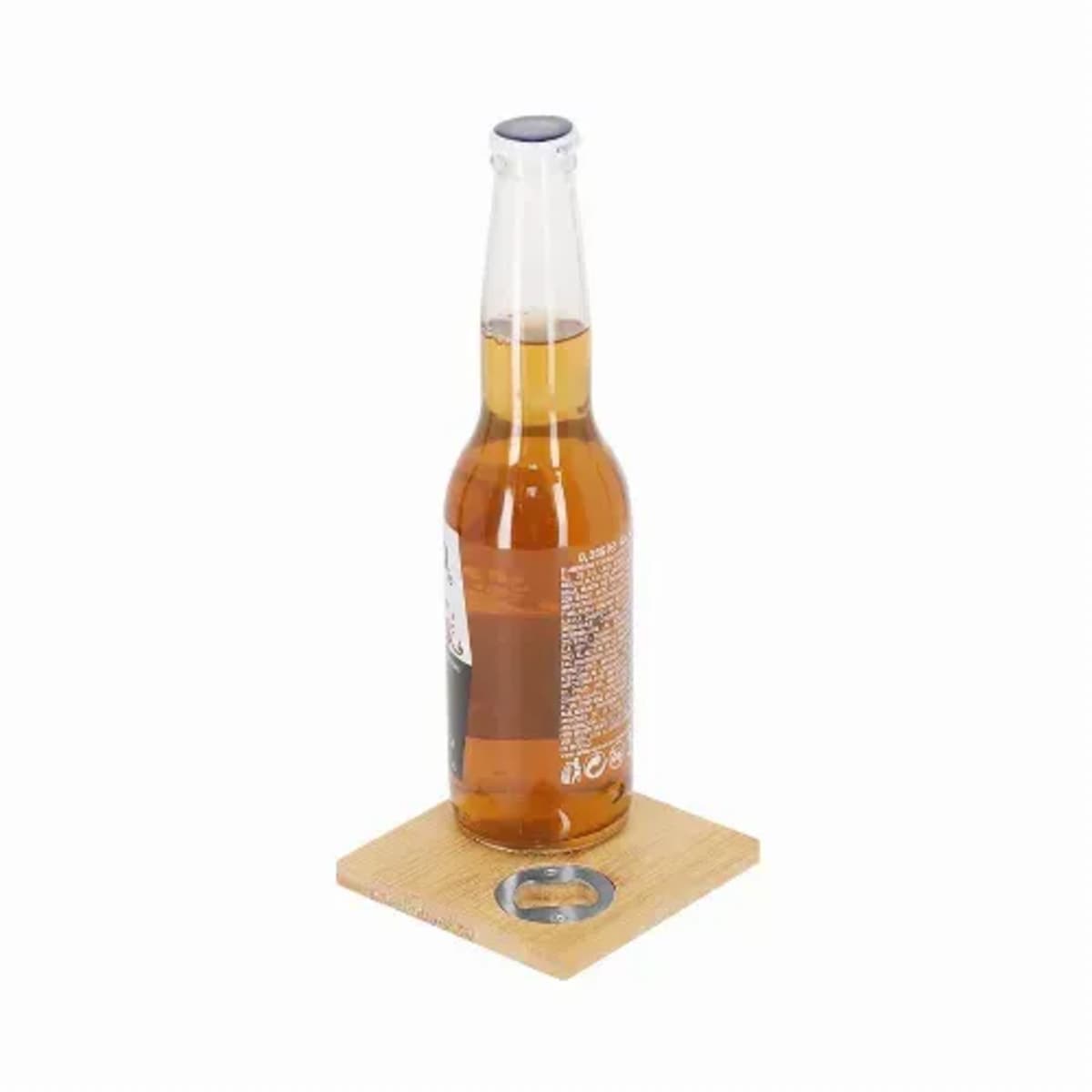 Useful coaster made of bamboo with integrated bottle opener, ideal for enjoying drinks while protecting the surface.