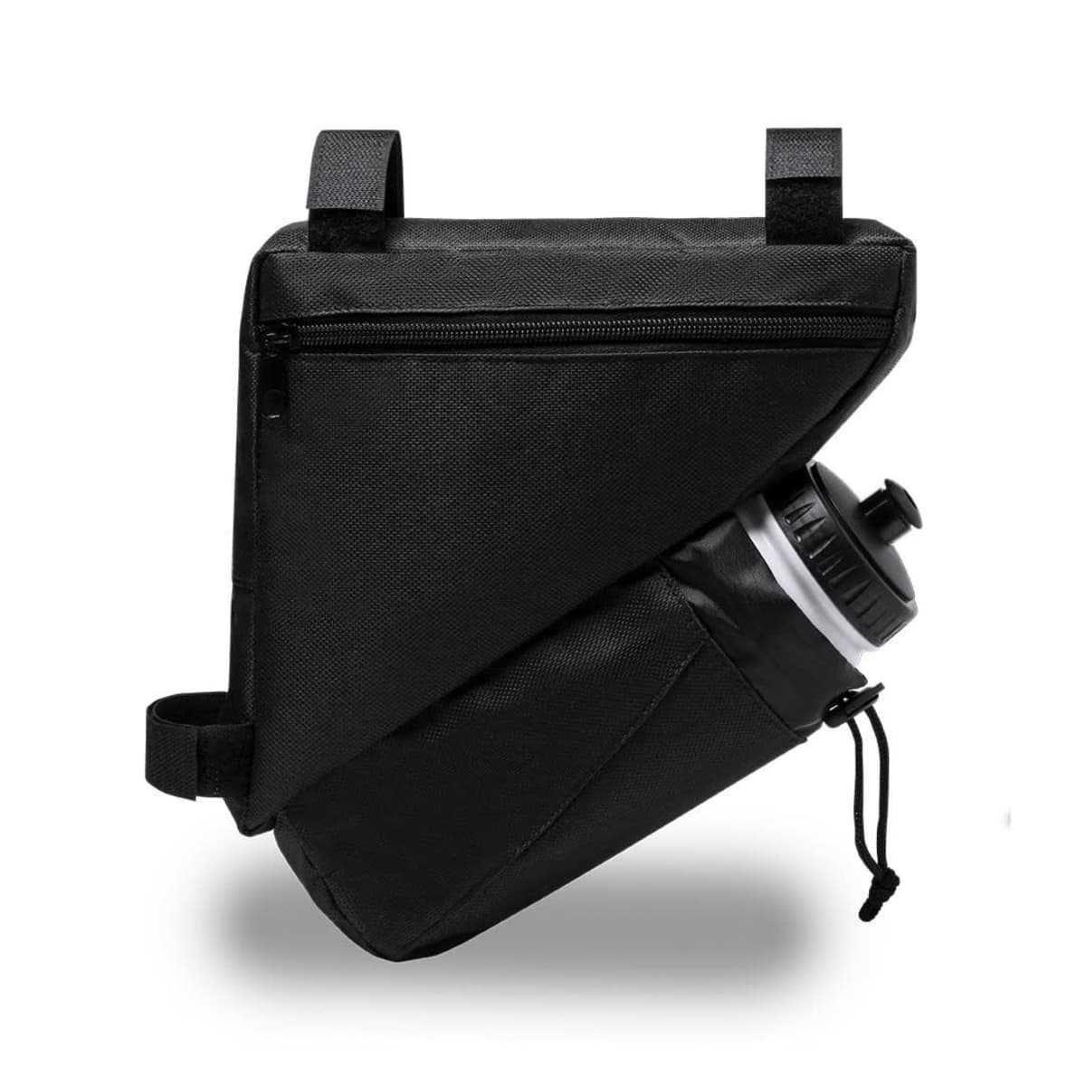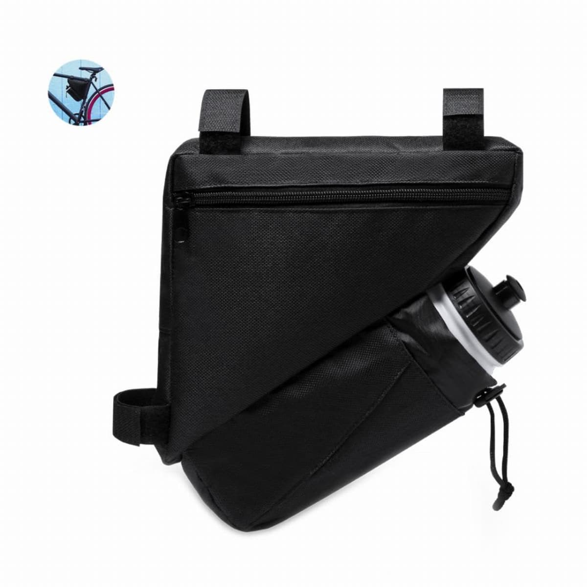 Available in black color. Main compartment with zip and universal adjustment to the bicycle frame by means of 3 velcro strips. Water bottle compartment with adjustable string.