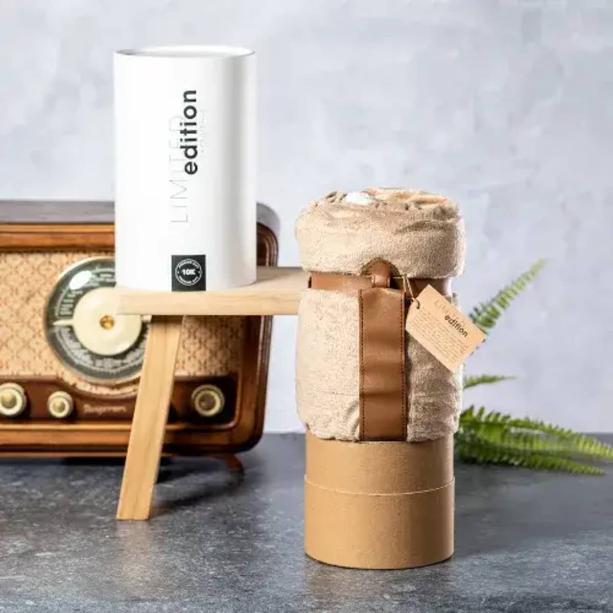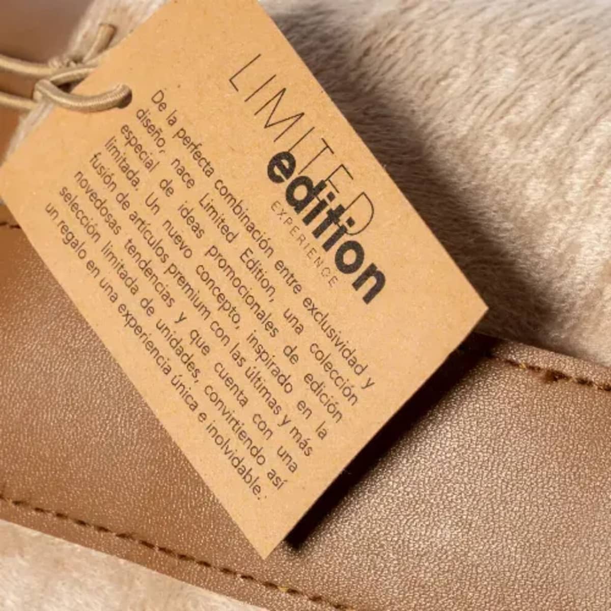 Manufactured in premium materials (Coral Fleece and Sherpa 380g/m2), with brown PU leather carrying strap.Presented in a Limited Edition Experience case, with unique design and protected by industrial property rights. Recycled cardboard card with Lim