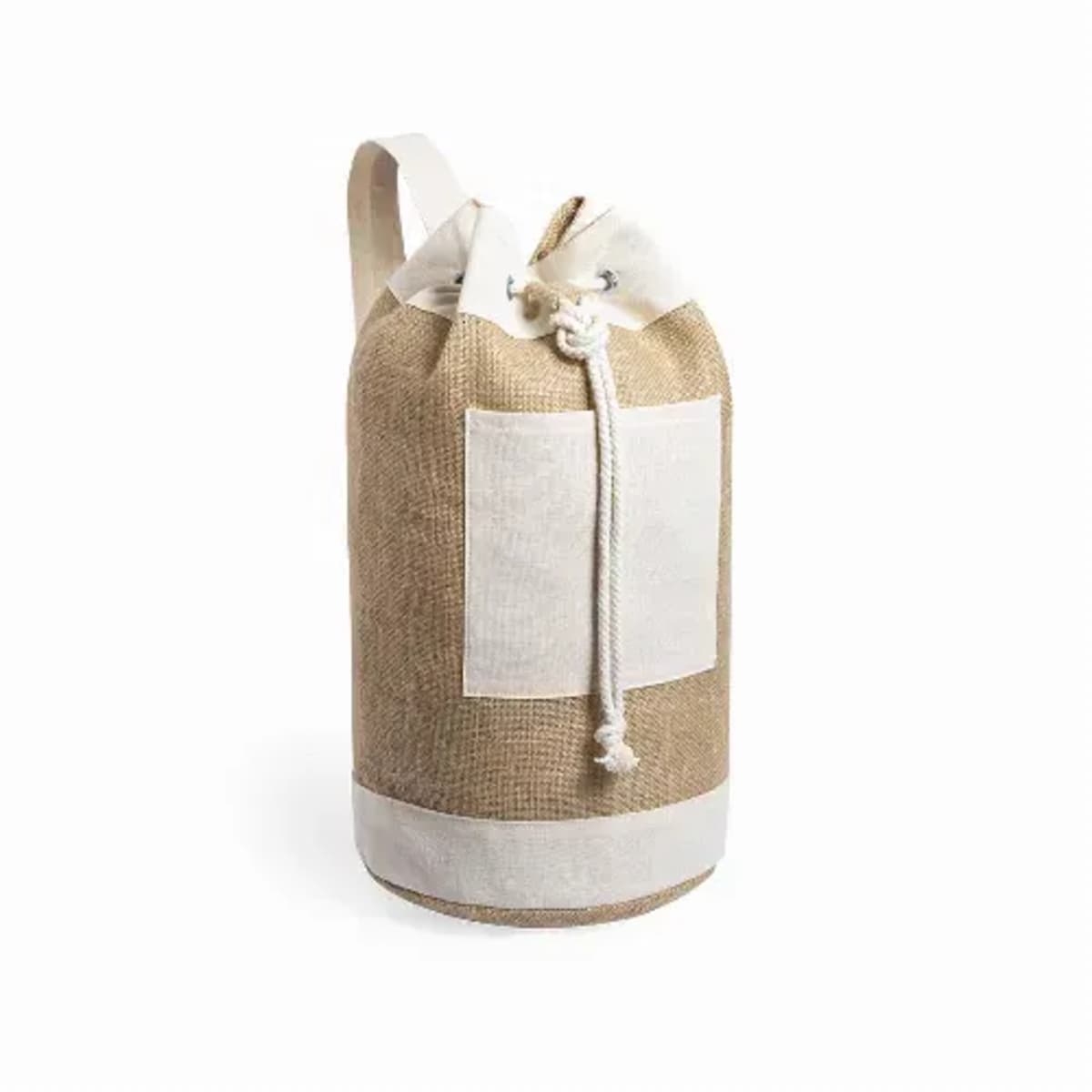Features:  Made of jute, with details in cotton. Adjustable strap and inner pocket. Main compartment with reinforced metal eyelets and front pocket for easy printing.