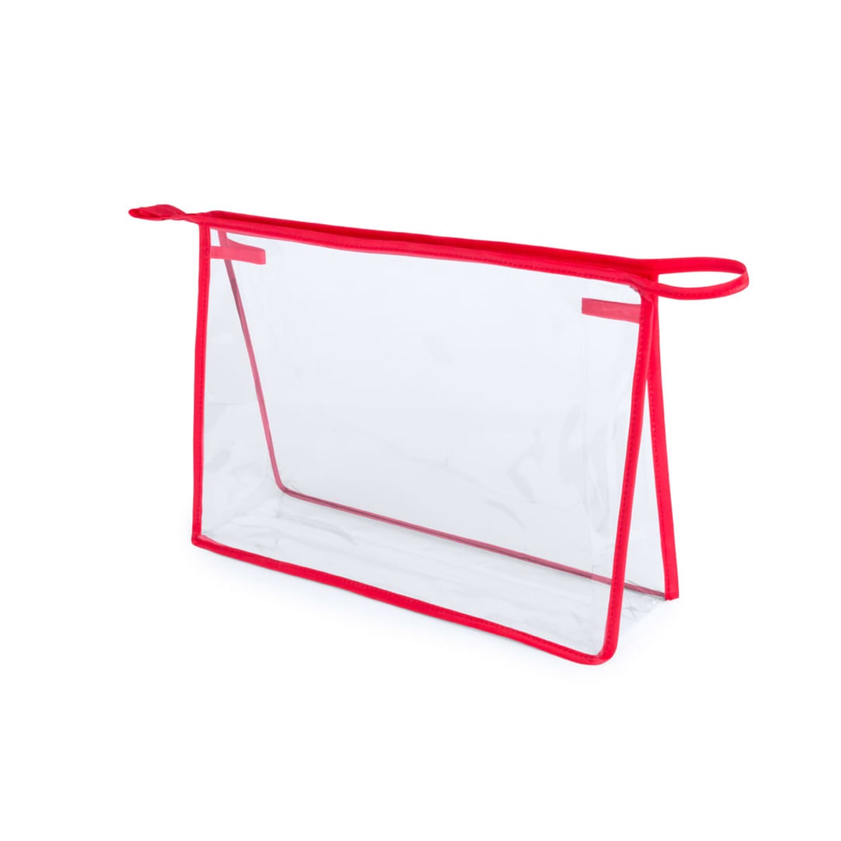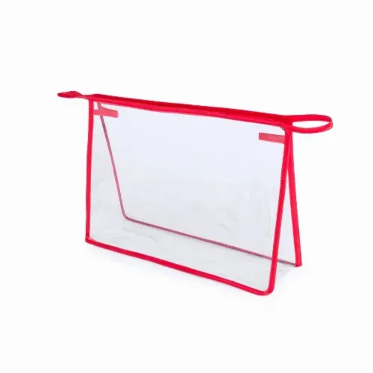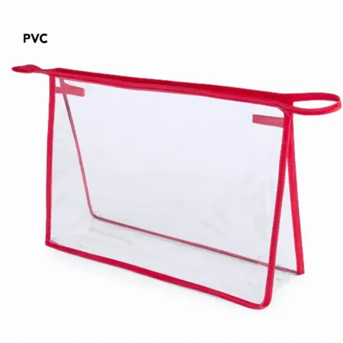 Multi purpose beauty bag in resistant transparent PVC with reinforcement edges in bright tones.