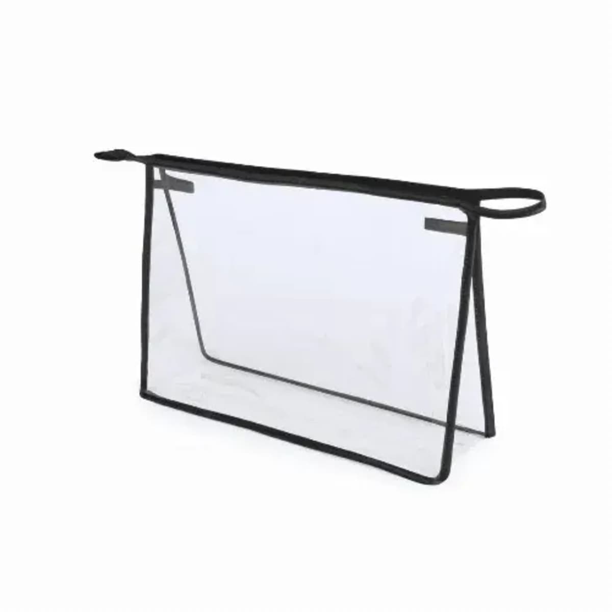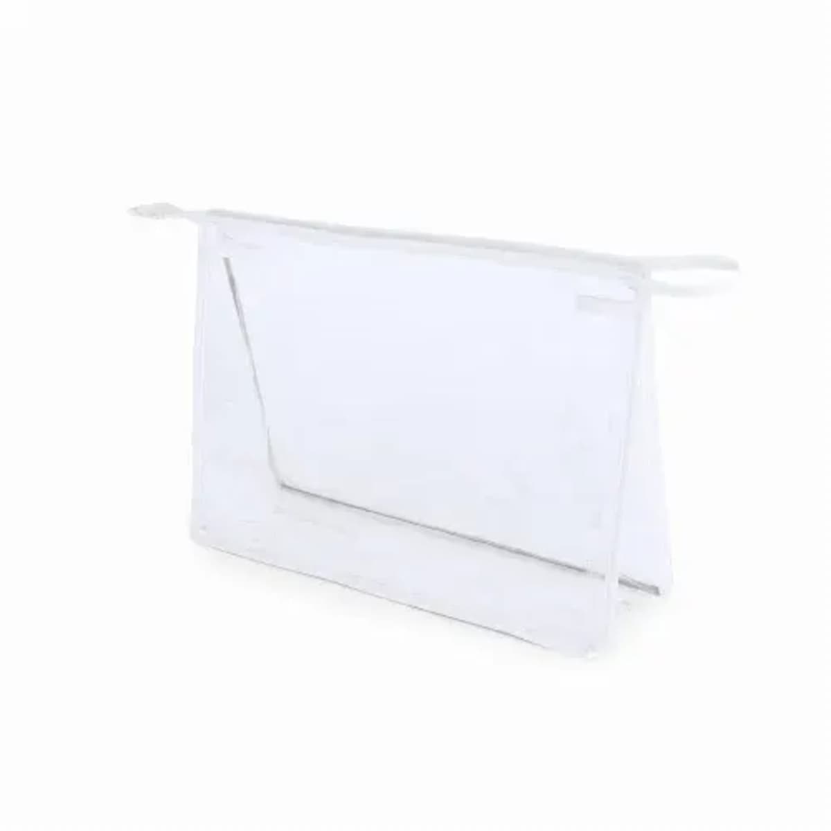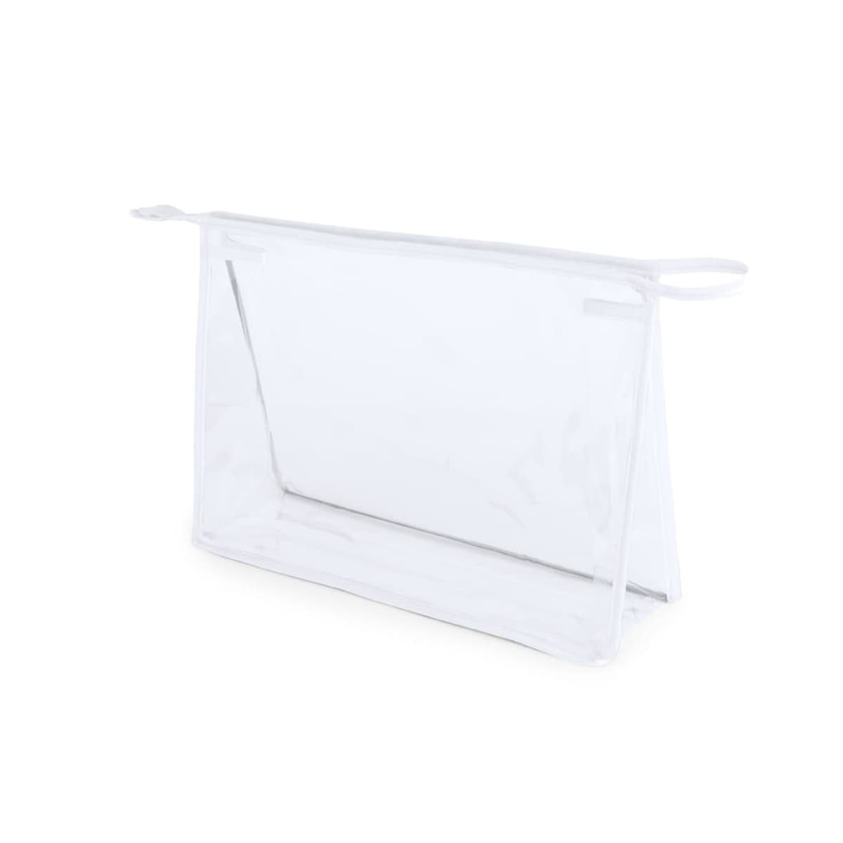 Multi purpose beauty bag in resistant transparent PVC with reinforcement edges in bright tones.