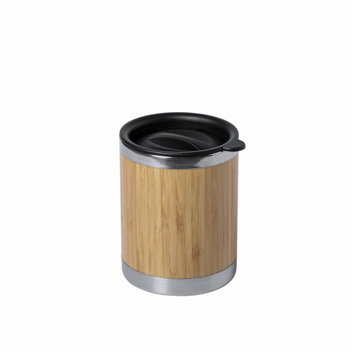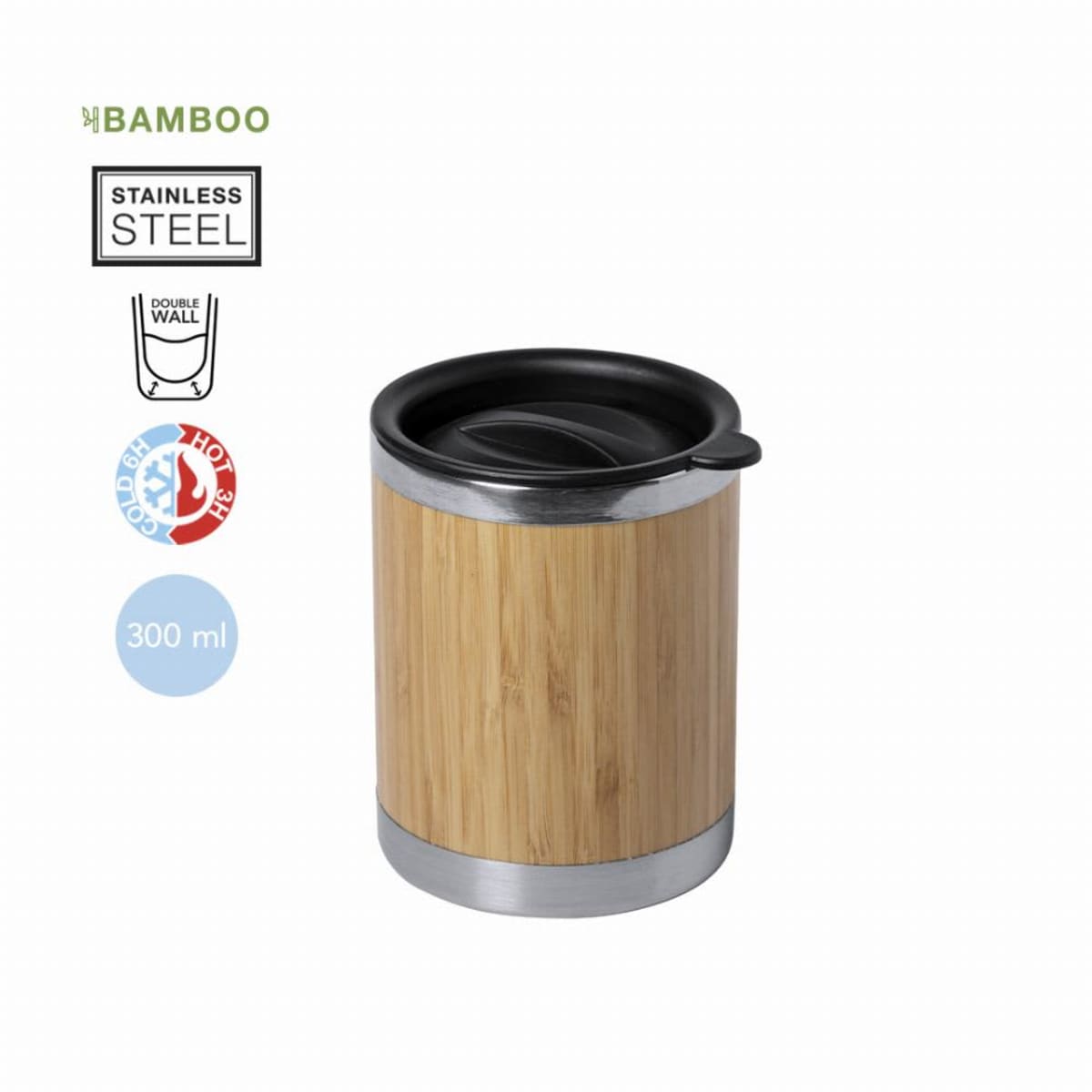 Bamboo and stainless steel double walled body for better and longer lasting temperature conservation. With an original black dosing cap with easy-opener. It is ideal for your desk, table, or any surface where you can enjoy your favorite drink.