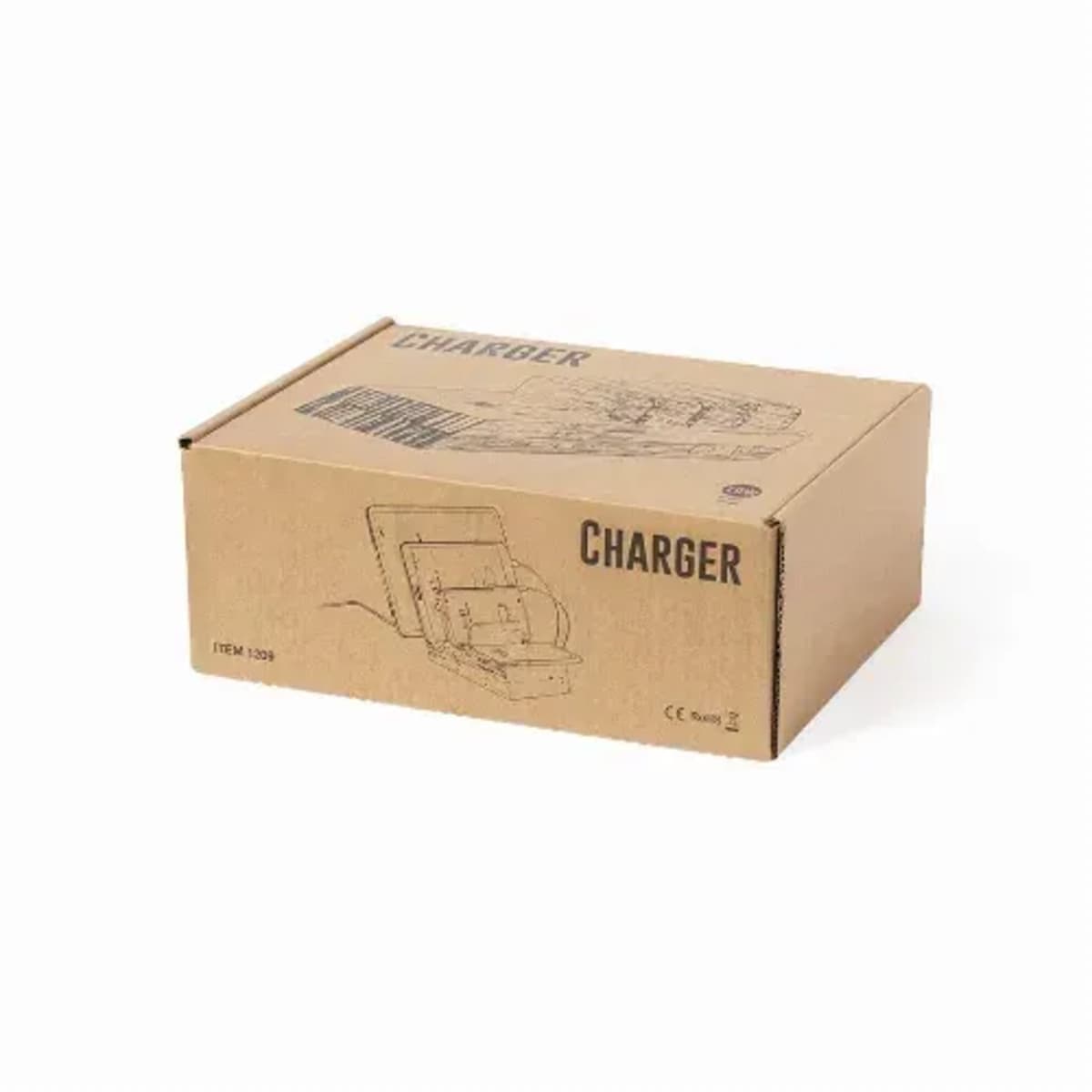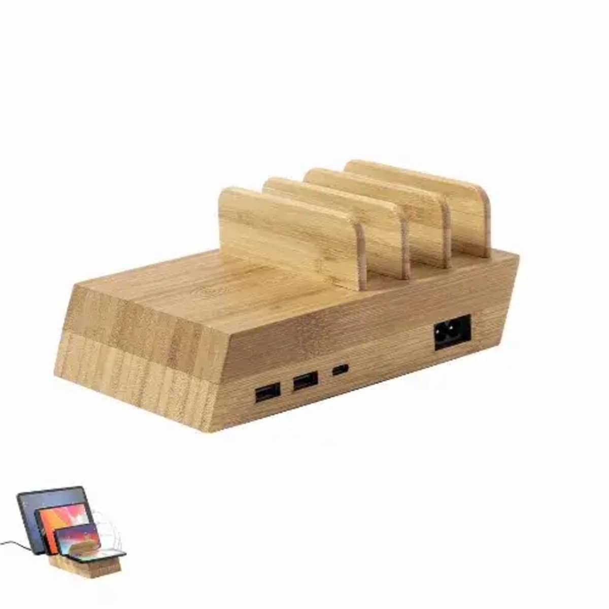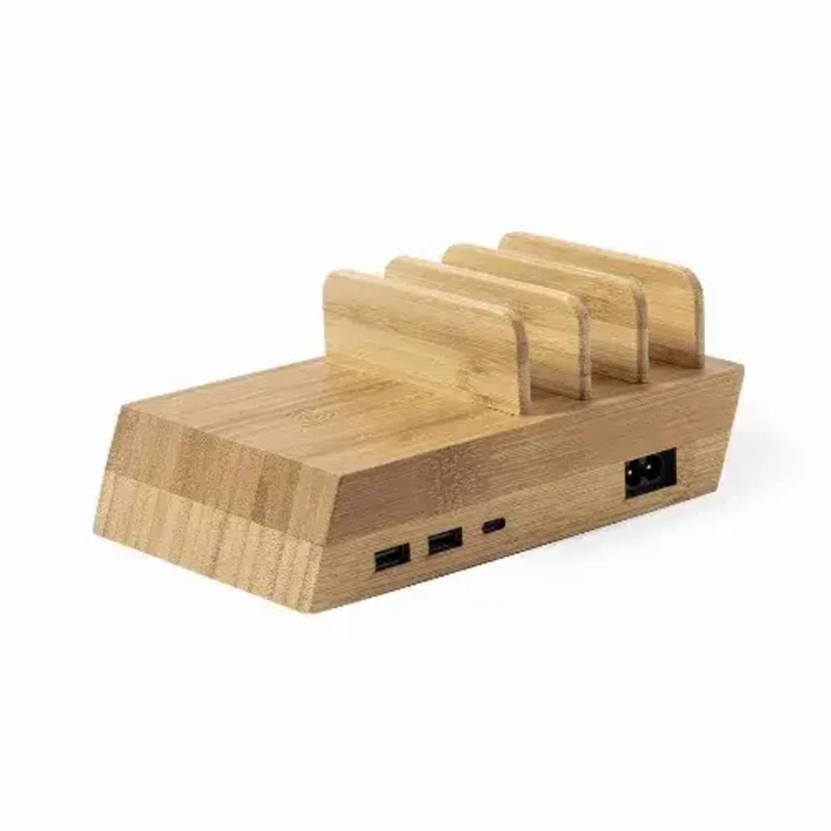 Made of bambo and including 2 USB and 1 Type-C outputs. Compatible with devices equipped with wireless charging technology. 150 cm connection cable, with European plug and a wide branding surface. Presented in an attractive eco-design box, with instr
