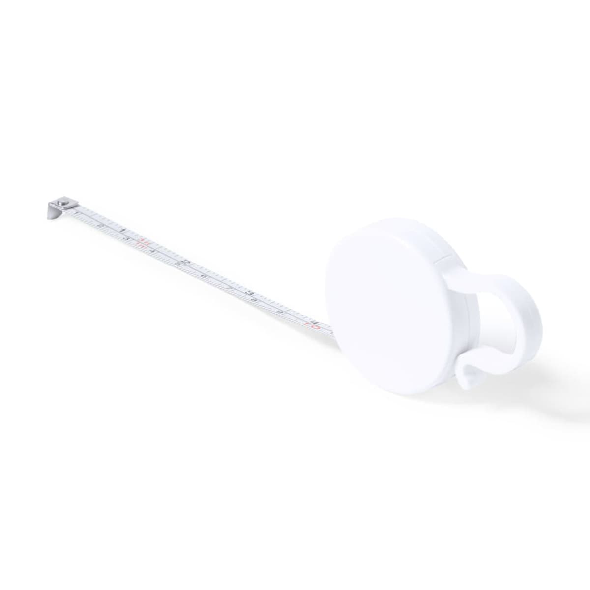 1 m flexometer in resistant white ABS, with bamboo insert on the body and transport ring.