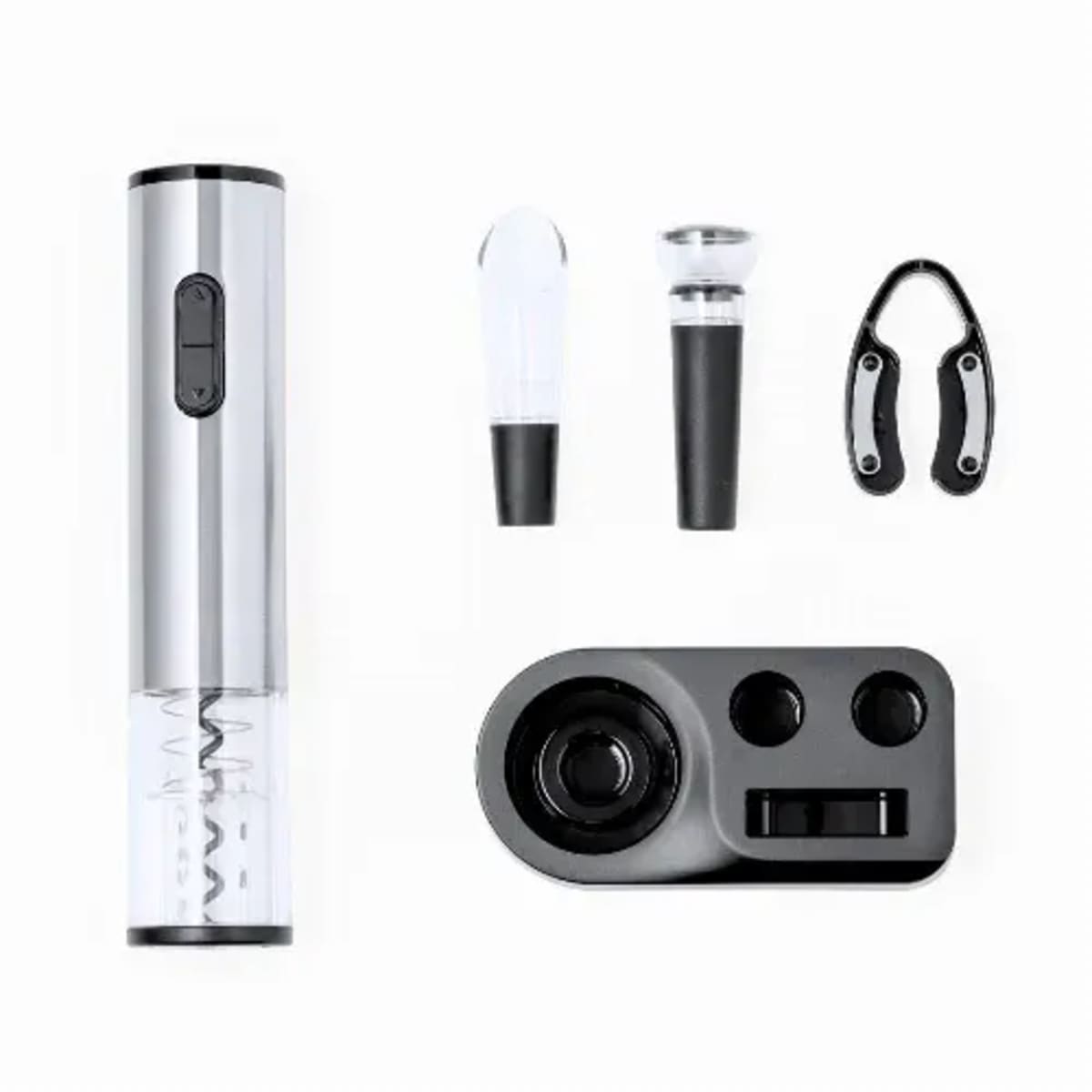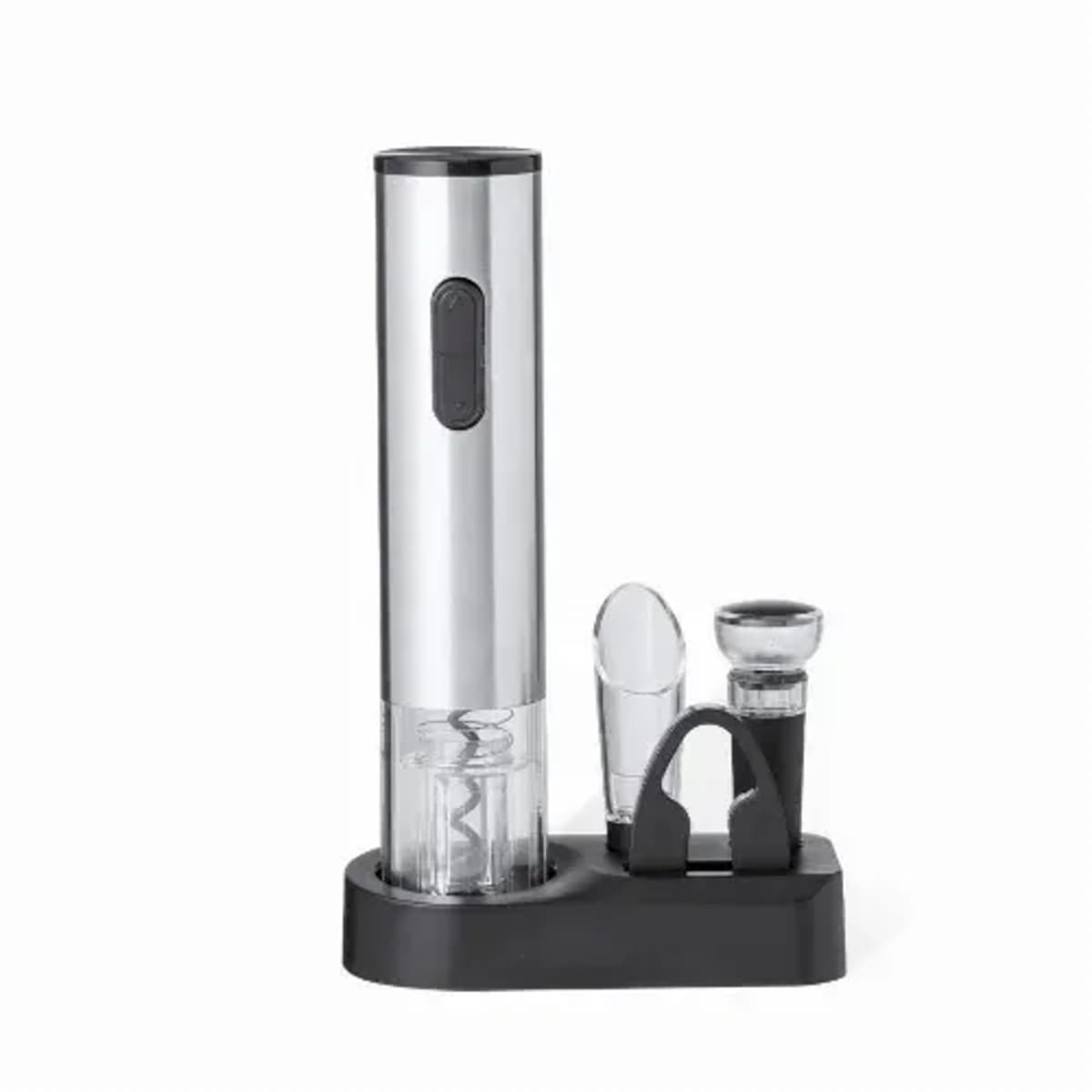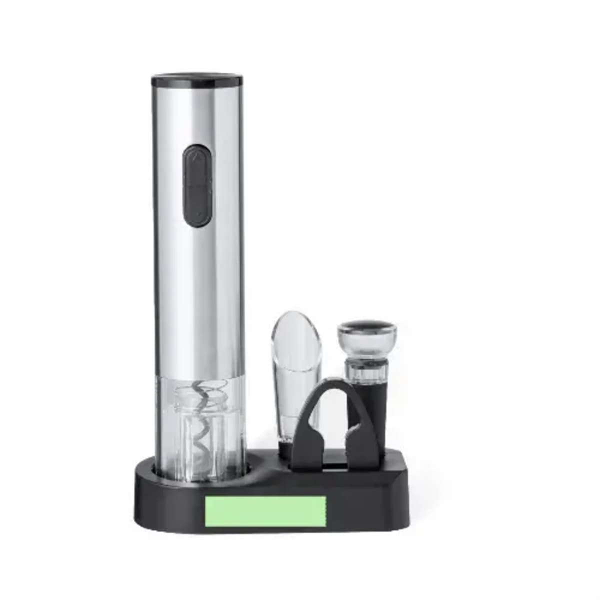 Contains an electric corkscrew powered by 4 AAA batteries (not included), a decanter, a lid, and a capsule cutter, with push-on mechanism. Including an elegant black base to keep the accessories tidy. Presented in a kraft design box.