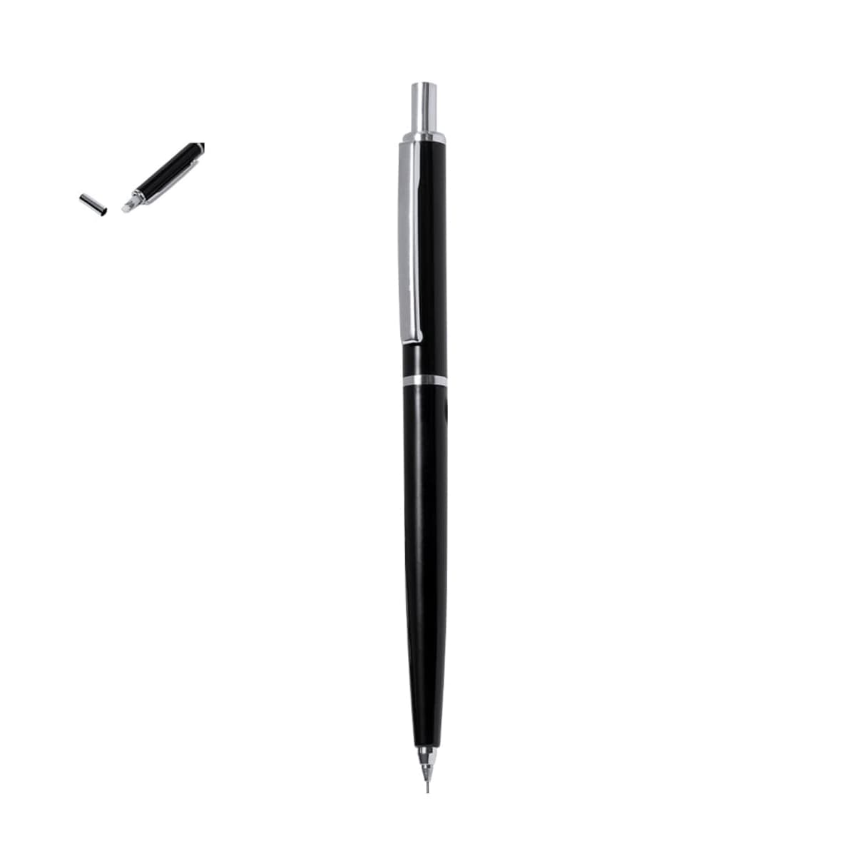 Features:  Black barrel and matching smooth grip, with chrome-plated push button, clip, tip and central ring. Including eraser and 0.7 mm leads.