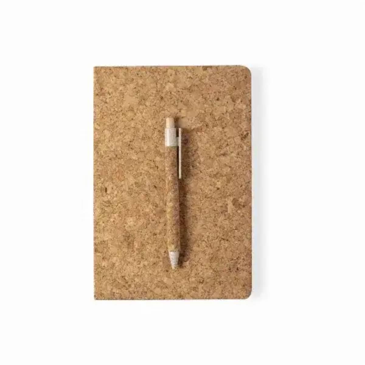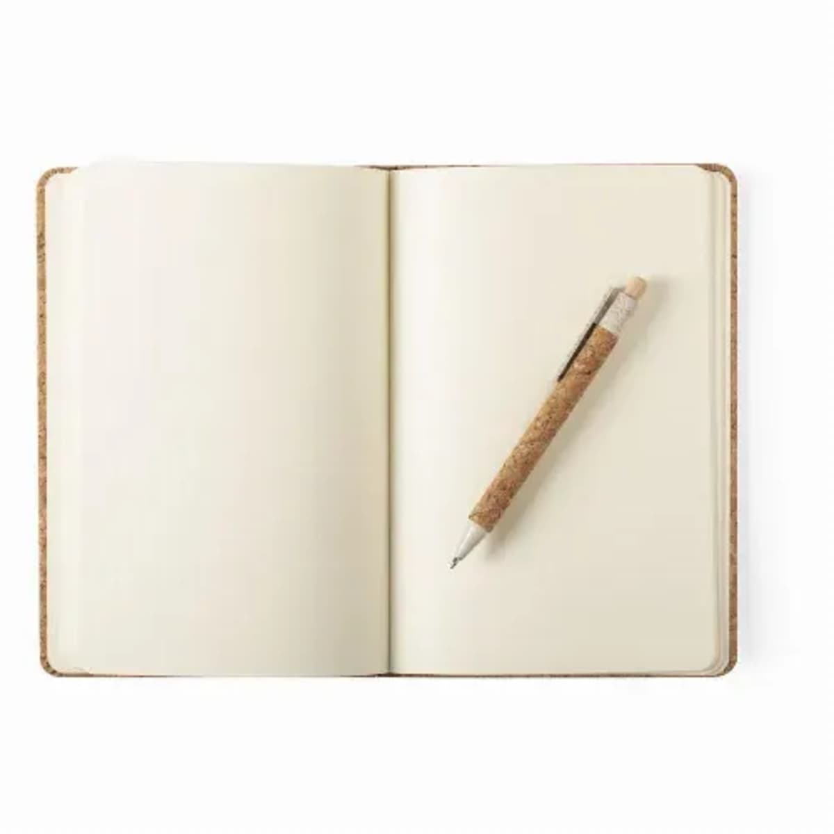 Features:  Notebook with hard covers in natural cork, with 80 plain sheets. Ball pen with push-up mechanism, with natural cork body and accessories in wheat straw, to encourage the use of natural raw materials and reducing contaminant emissions. Presented in a