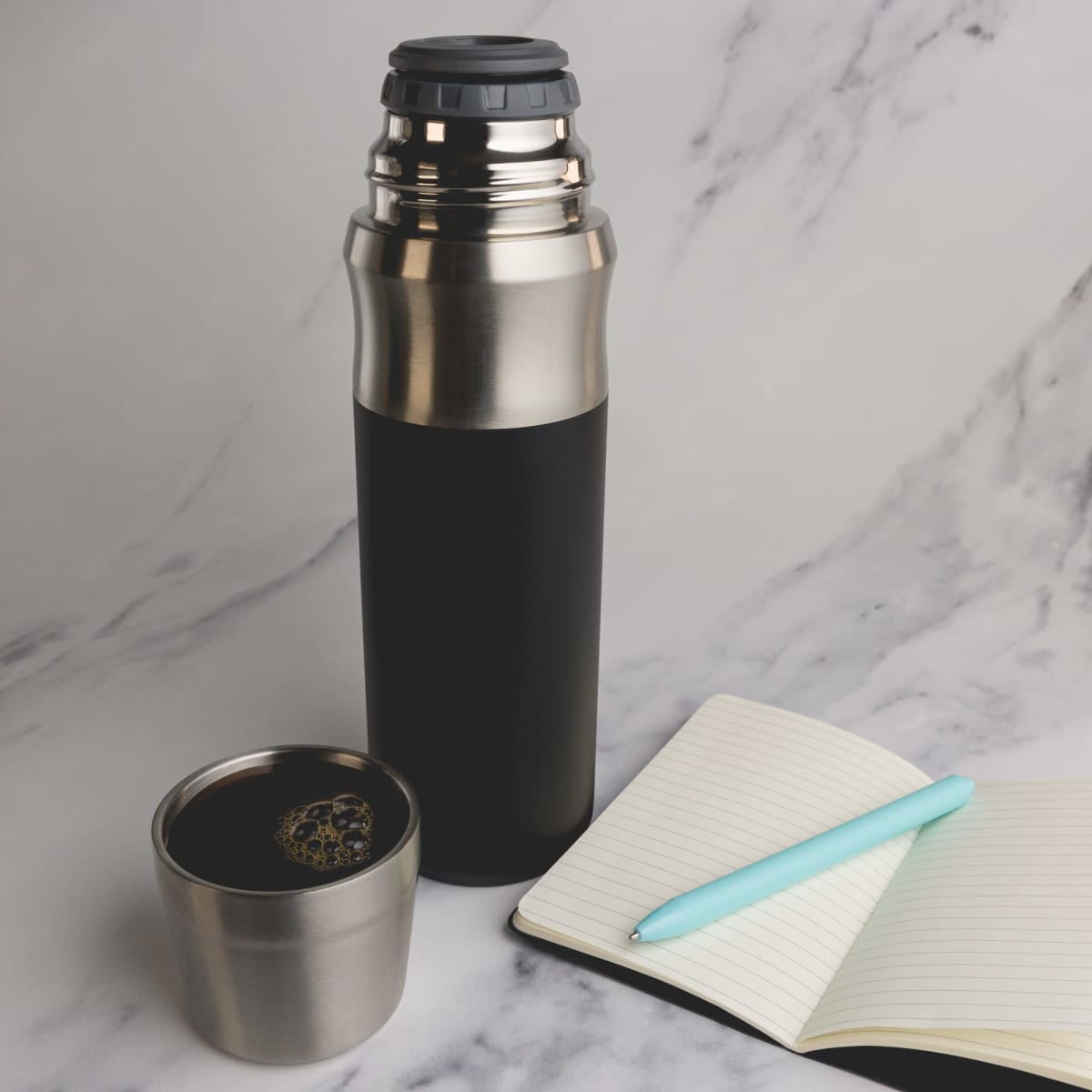 The Monte 600ml Vacuum Flask, designed for superior insulation while on the go. This flask features a double wall construction with 304 grade stainless steel inner and outer layers, ensuring your beverages stay hot or cold for longer. The sleek black powder coating covers approximately 150mm from the base, complemented by a grey lid. The screw-open/push-button lid and stainless steel screw-on cup add convenience to your drinking experience. The cup is perfect for tea, coffee, hot or cold beverages, and more. Standing at approximately 260mm tall (including the cup) with a diameter of 73mm, this flask is perfect for on-the-go hydration.