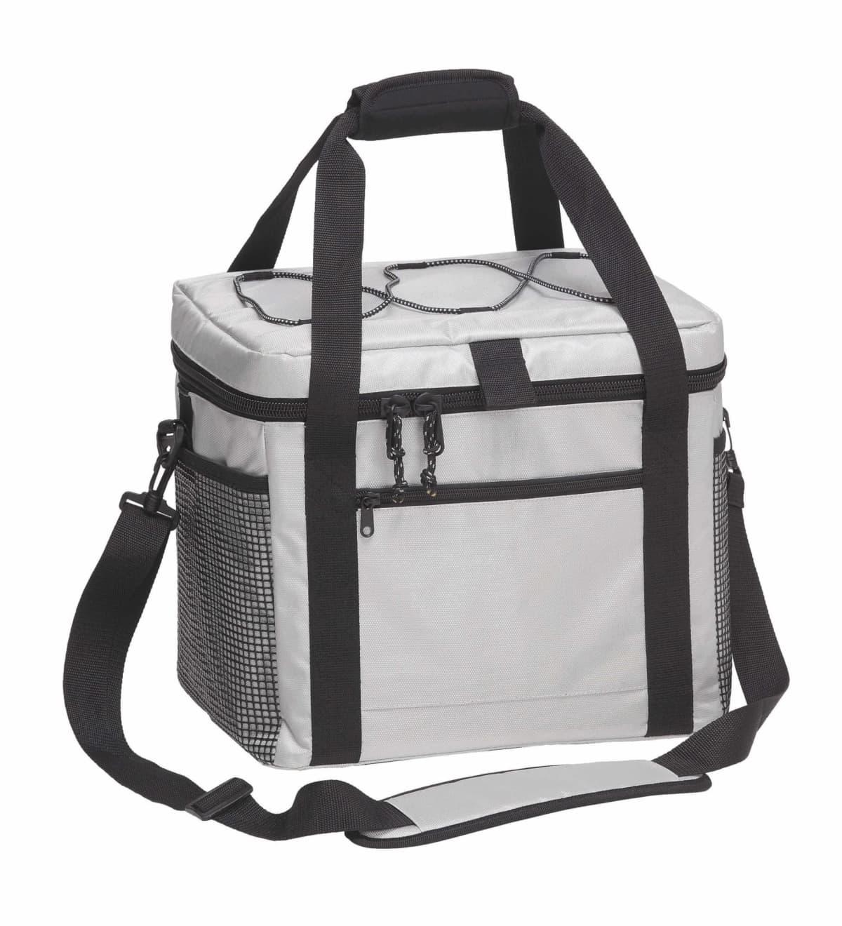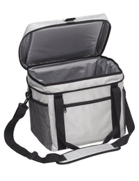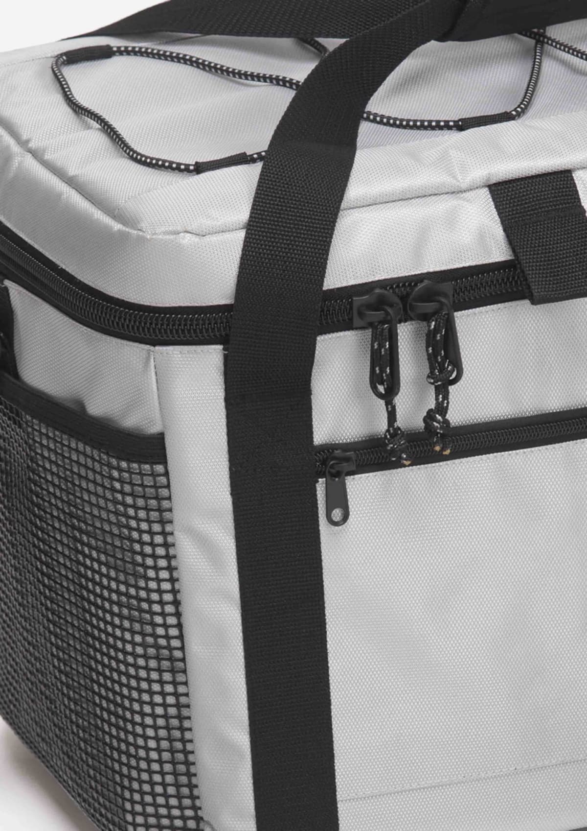 210D polyester with latex rubber backing|Heat sealed leak-proof PEVA Lining|Huge extra thick thermal insulated main cooler compartment keeps items cool for 2 days|Corrosion resistant zippers|Dual mesh side pockets|Stretch bungee cord system on lid|Detachable/adjustable shoulder strap|Velcro wrap carry handle for comfortable grip|Capacity: 28 Litres