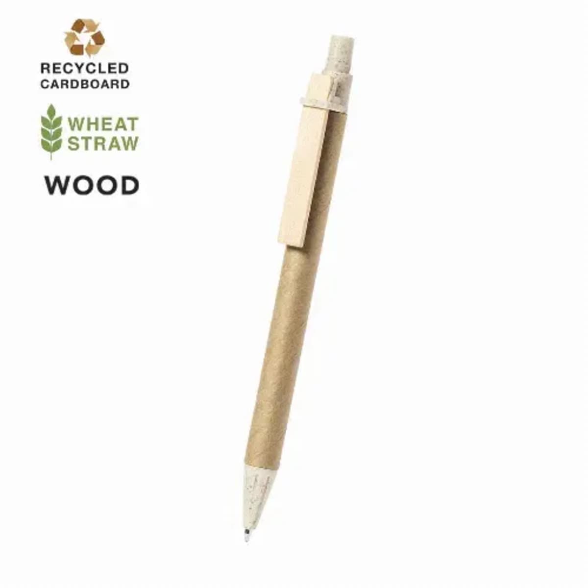 Features:  Made combination of recycled cardboard barrel in natural colour, with tip and push-button in wheat straw and wooden clip, promoting the use and recycling of raw materials, thus reducing pollutant emissions. Blue ink, with Wheat Straw emblem on the to