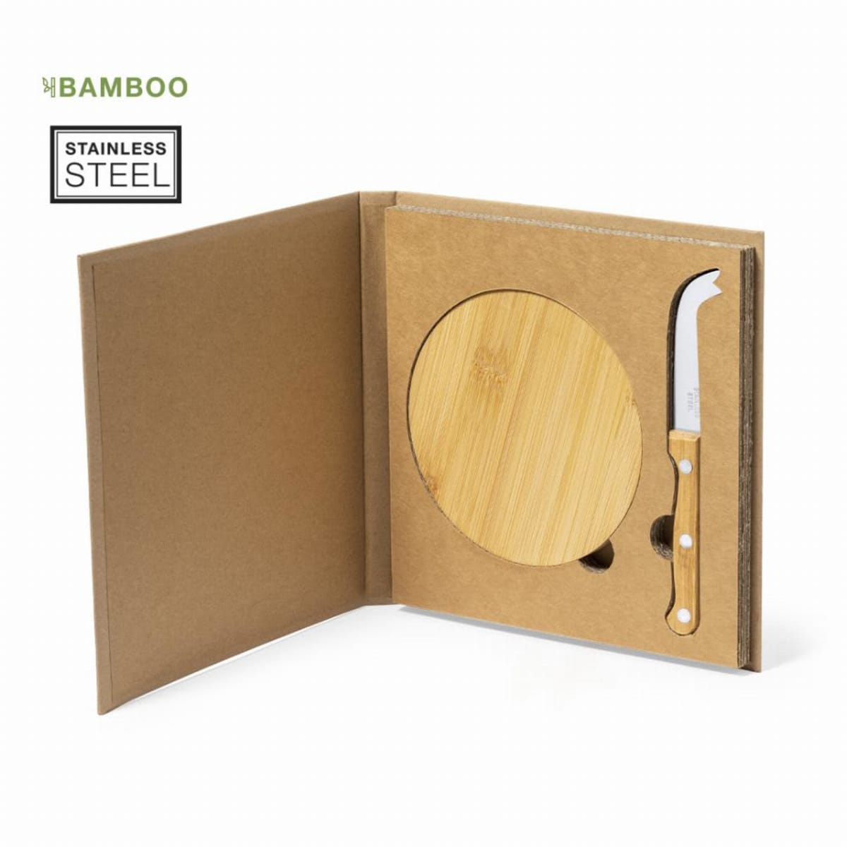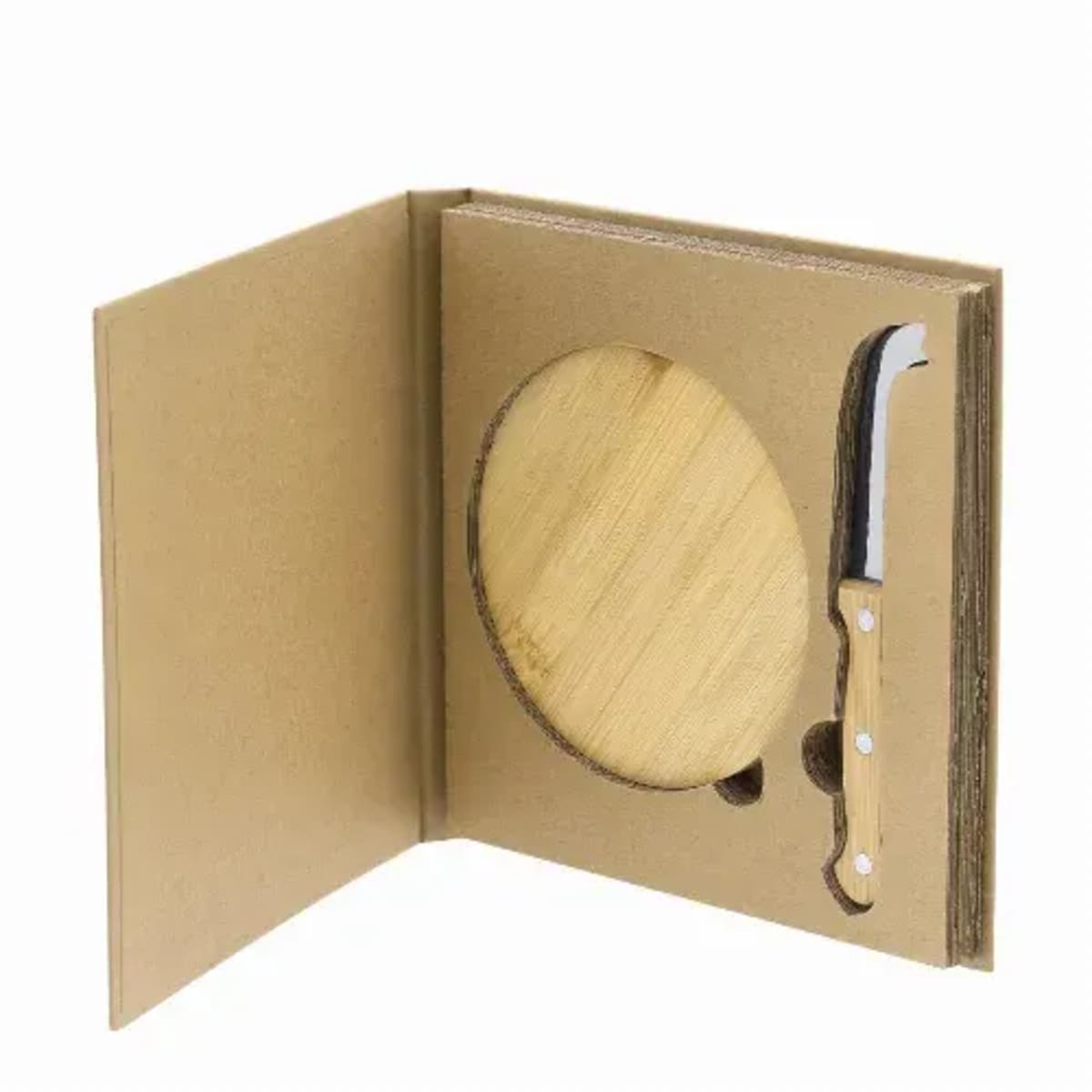 Including round cutting and serving board and a special cheese knife. Presented in an individual die-cut case made of recycled cardboard with kraft finish.