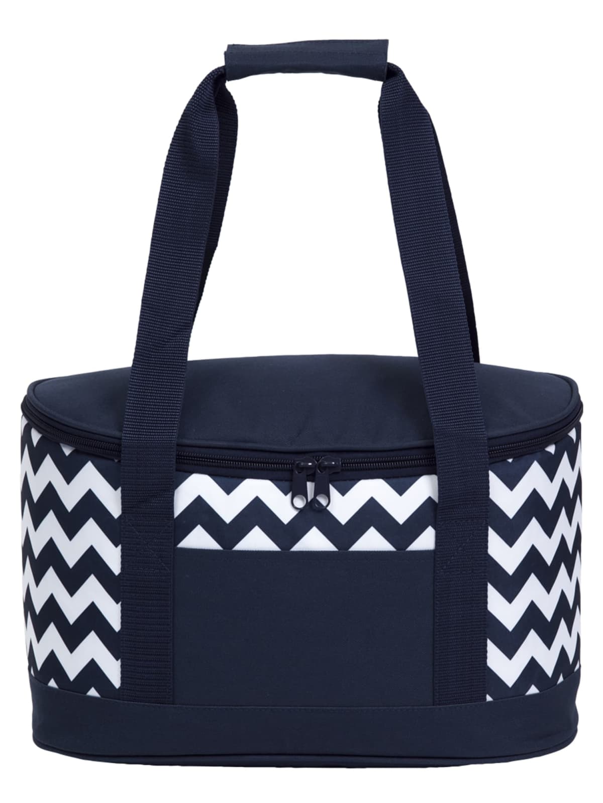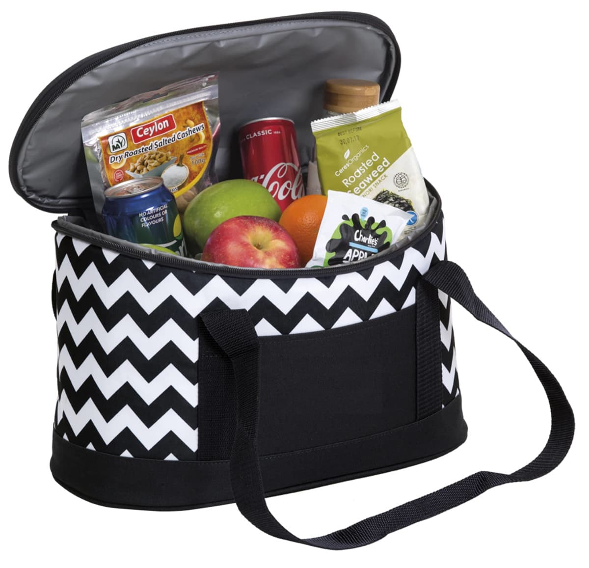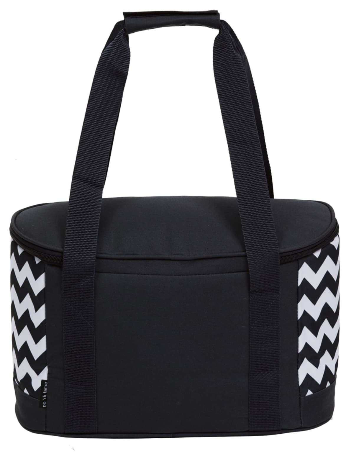 Chevron Printed 600D & 300D polyester|Heat sealed leak-proof PEVA lining|D shaped zippered opening to main insulated cooler compartment|Webbing carry handles with Velcro wrap closure|Front accessory slip pocket|po ‘di fame pip|Capacity: 19 Litres