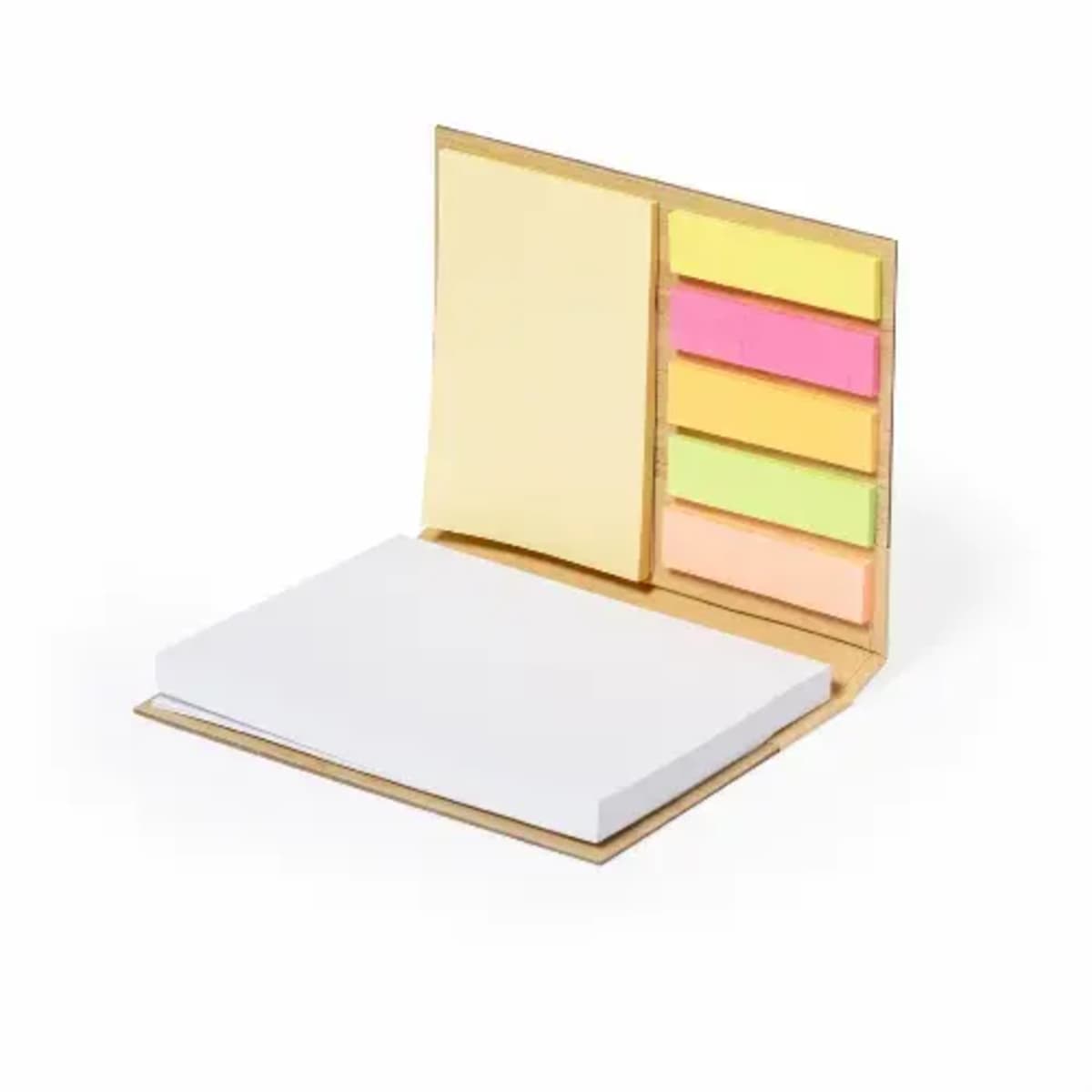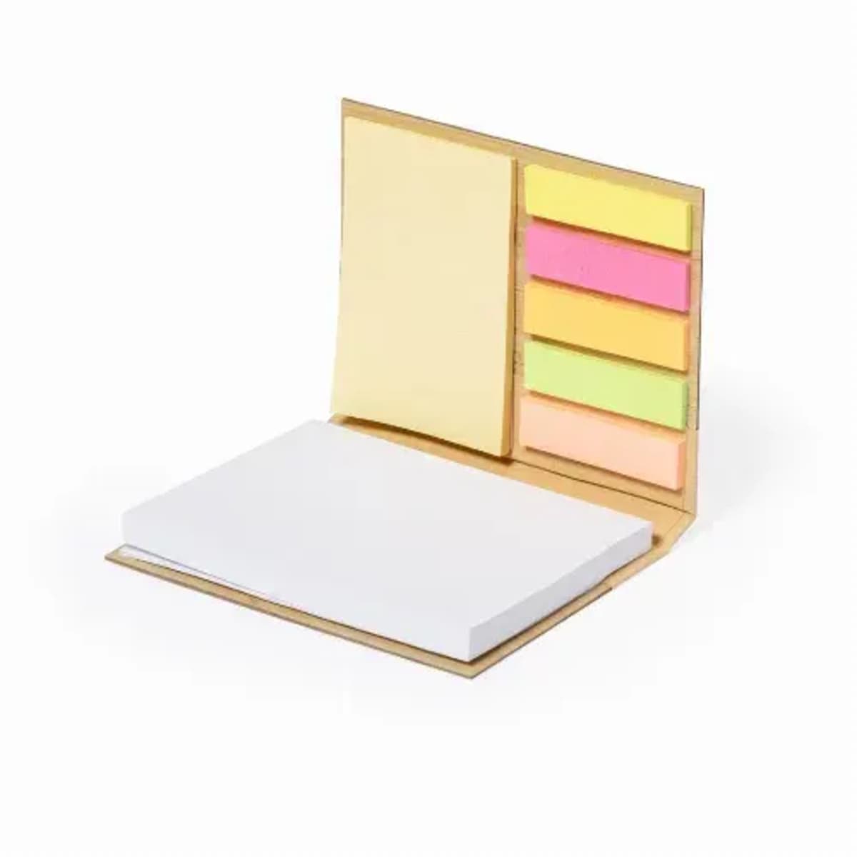 Inside with 25 sticky notes of 7,5x5cm and 125 mini sticky notes of 4,5x1,2cm, in 5 different colours. Presented in an individual paper bag.Materials such as bamboo promote the use of natural raw materials, thus reducing pollutant emissions. It comes