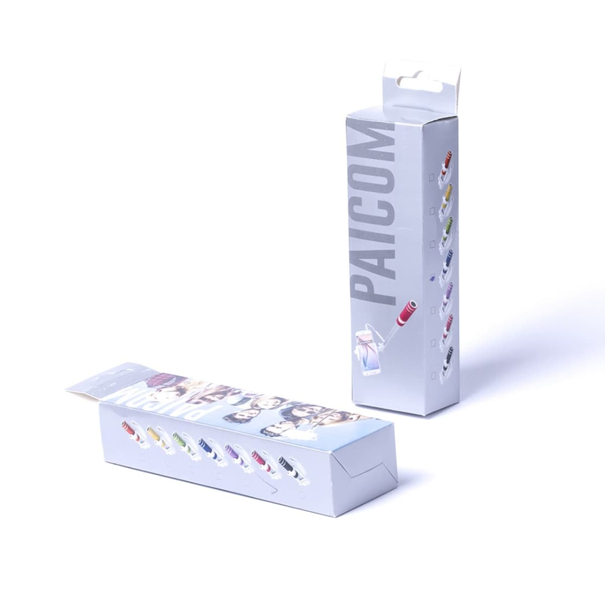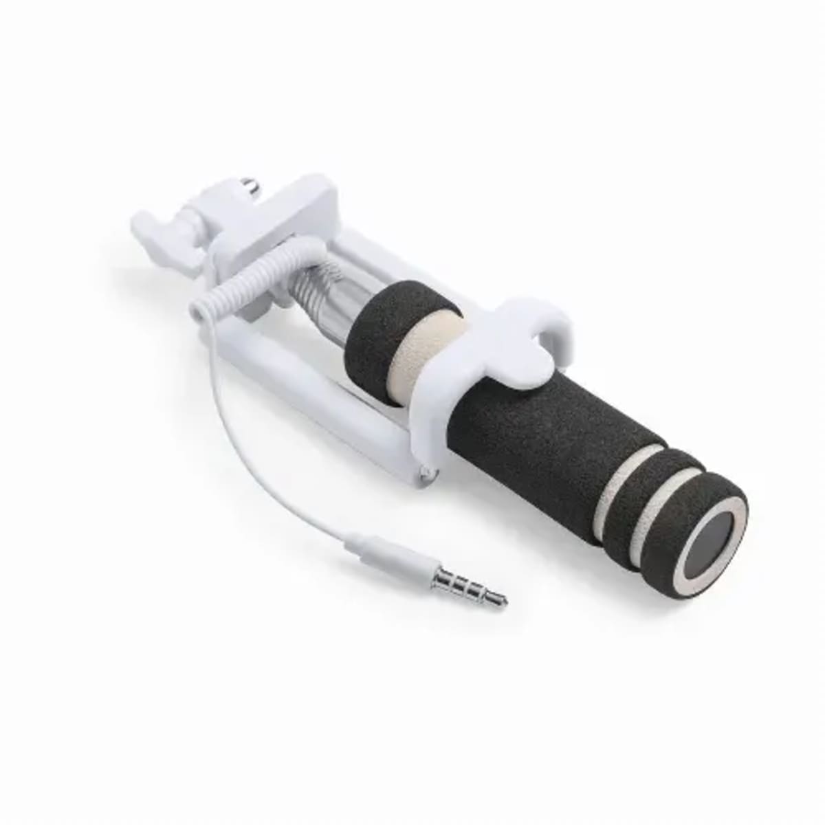Compact folding selfie stick, minimalist design, with 3.5mm jack connection, anti-rotation system and built-in shooter in handle.