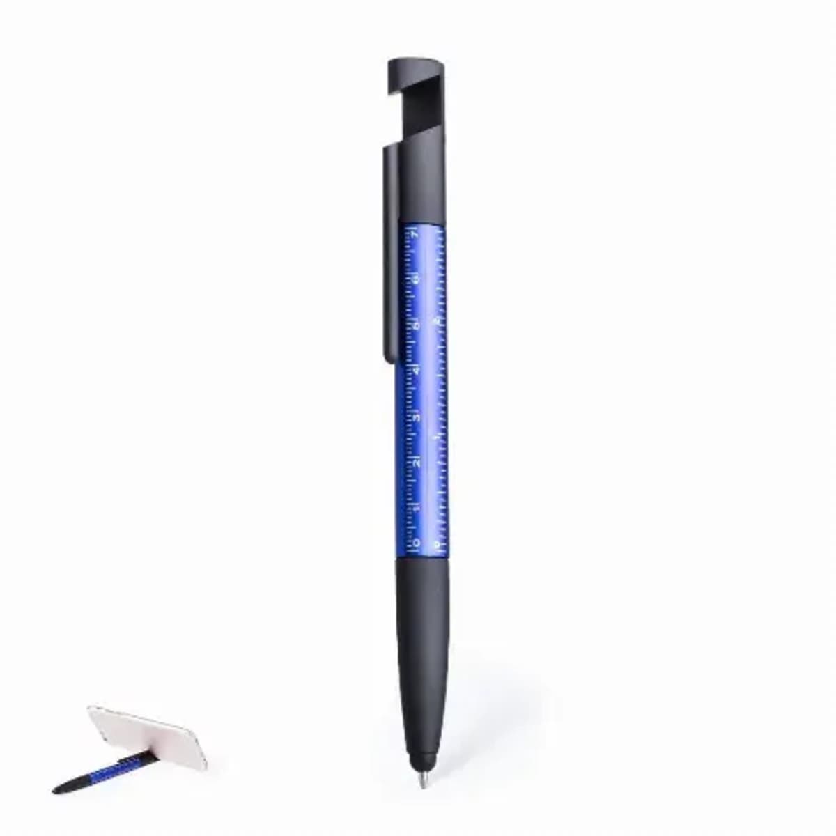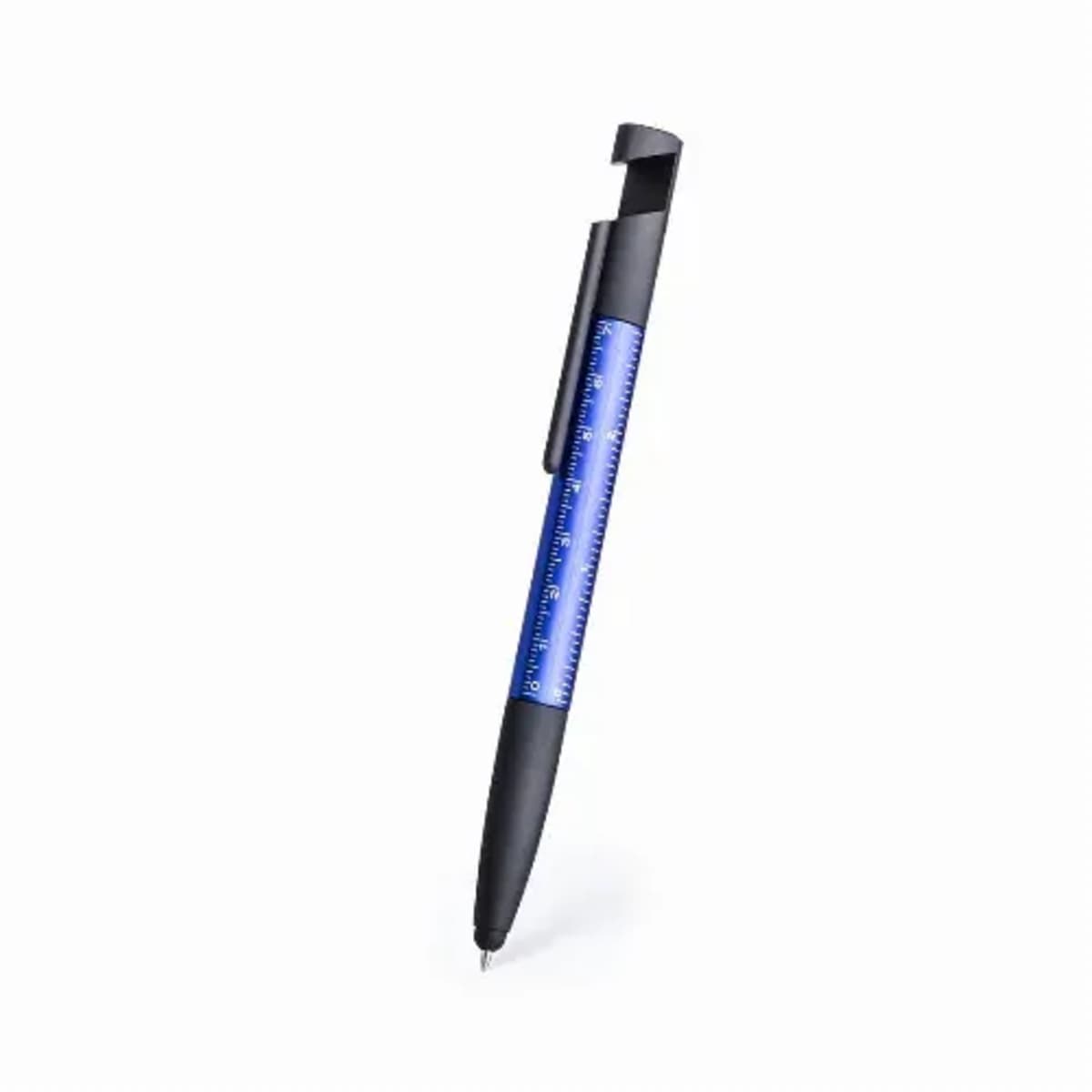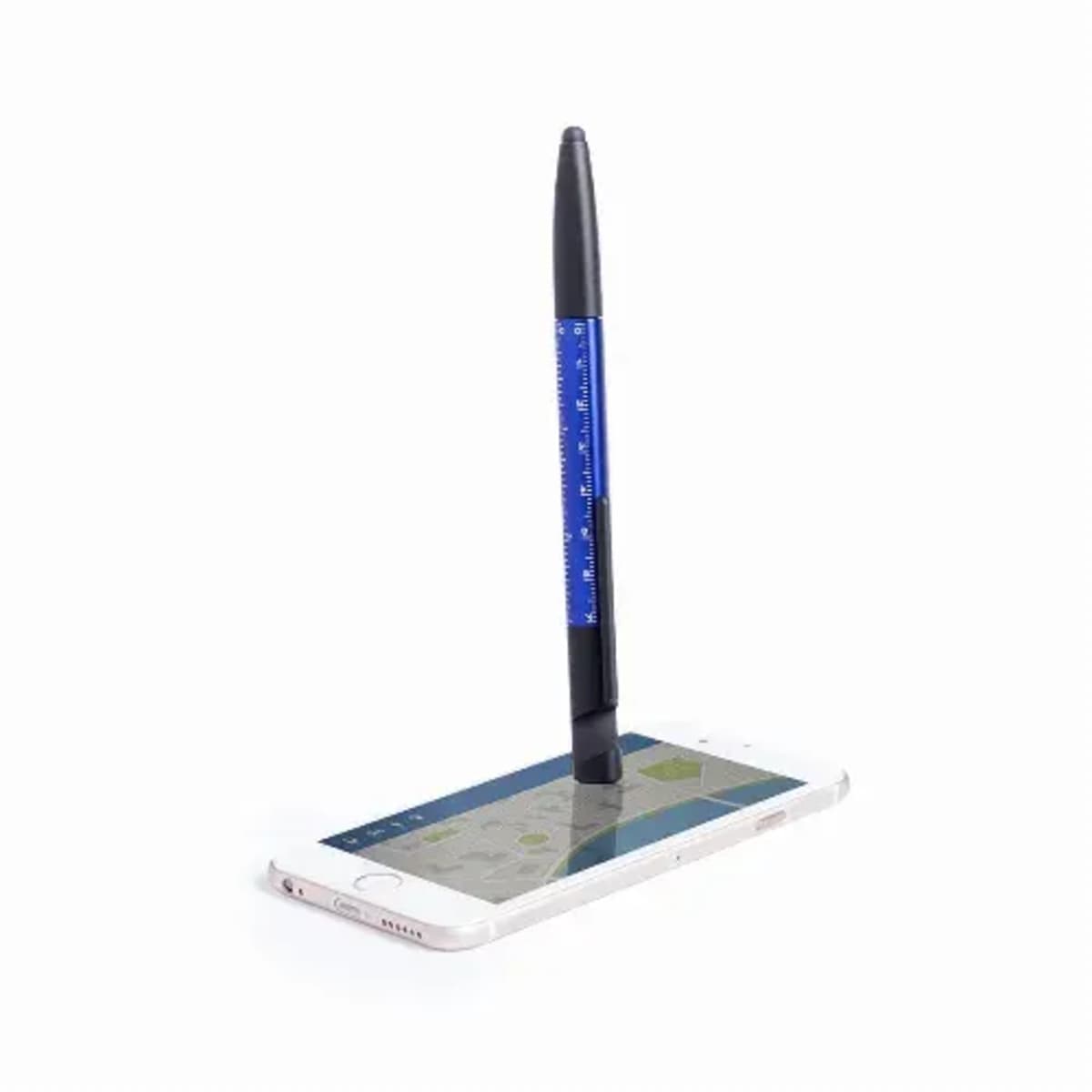 With holder for mobile device, pointer, screen cleaner, built-in ruler -cm and inches-, flat-head and cross-head screwdrivers. Blue ink.