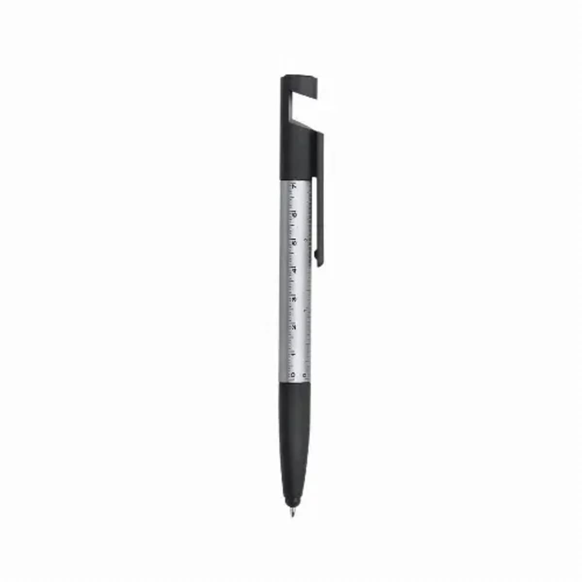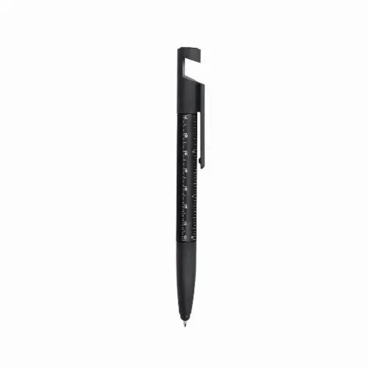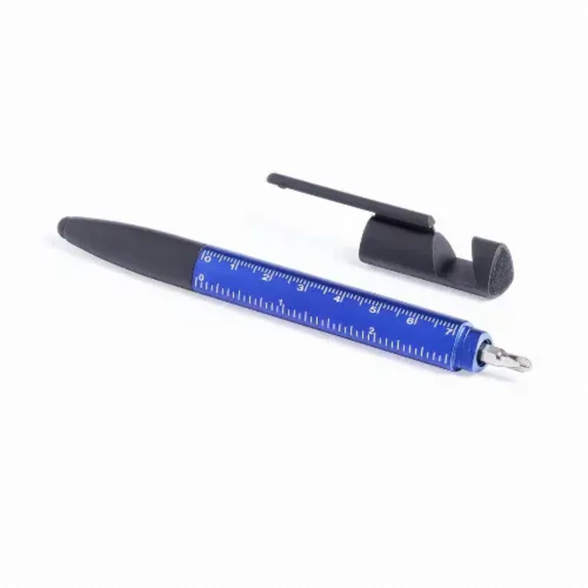 With holder for mobile device, pointer, screen cleaner, built-in ruler -cm and inches-, flat-head and cross-head screwdrivers. Blue ink.