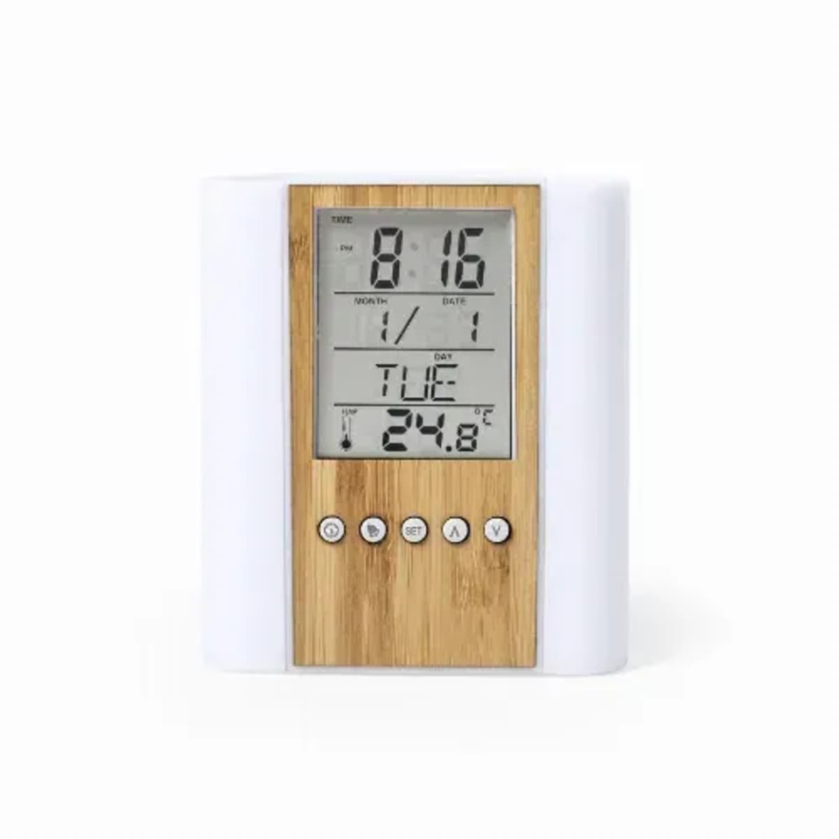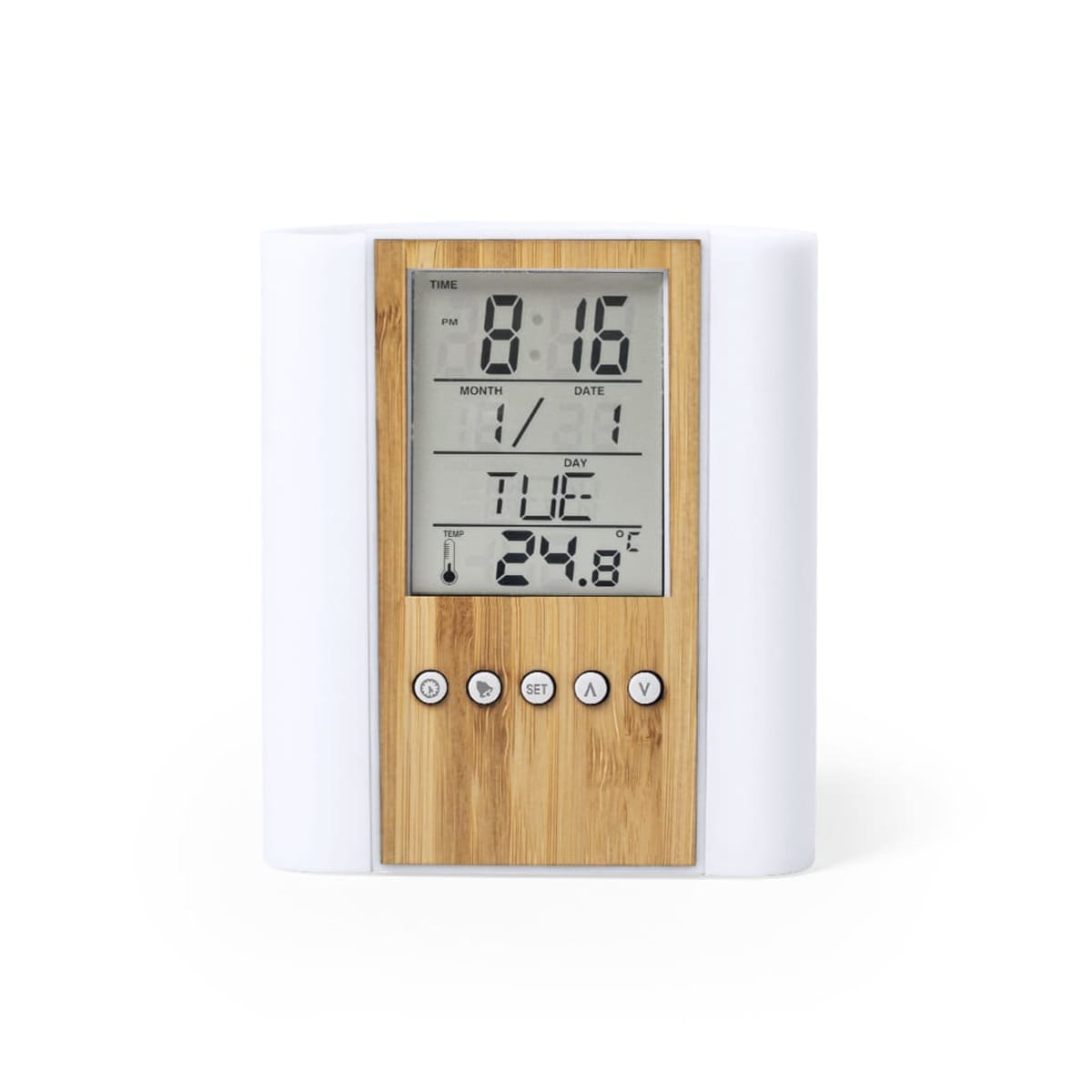 Made of a combination of bamboo and ABS materials. Thermometer, calendar and alarm functions timer and birthday reminder. Battery powered (cell button included) and presented in attractive eco design box. Instruction manual available in Spanish a
