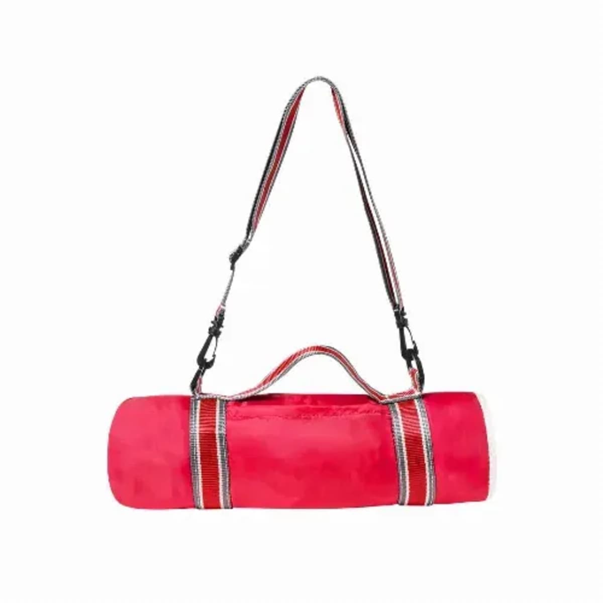 In size 120 x 150 cm,and with shoulder carrying strap made of durable nylon, with adjustable velcro fastening and in matching colour with the blanket. Folds up easily and is available in several colours. Presented in an individual recycled bag.
