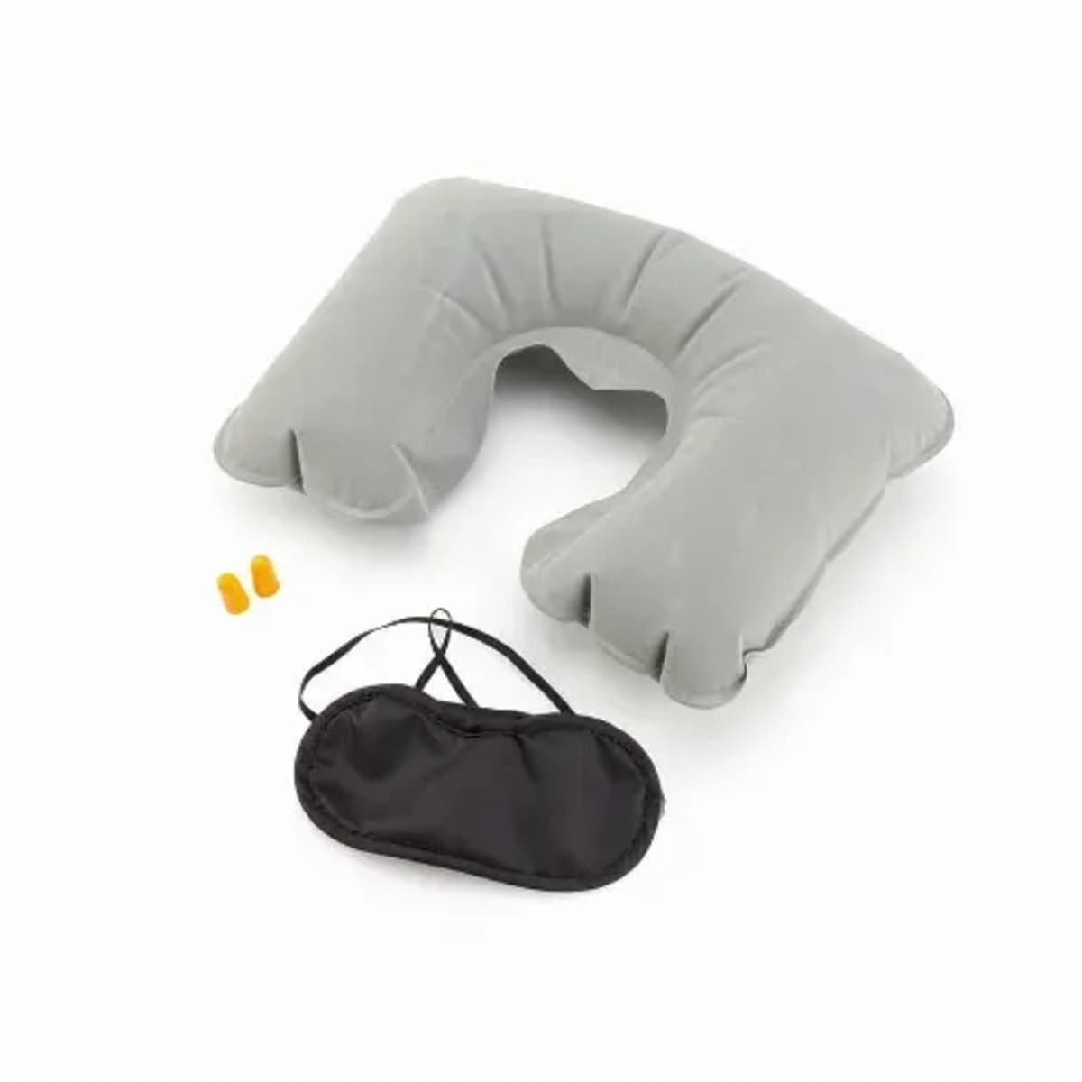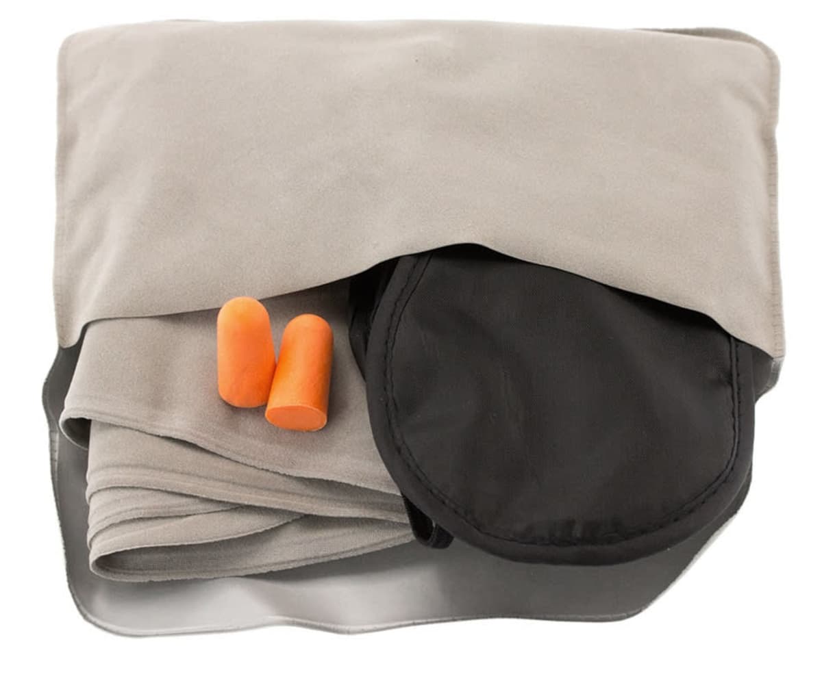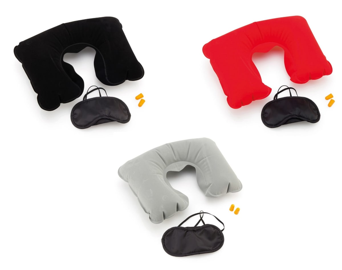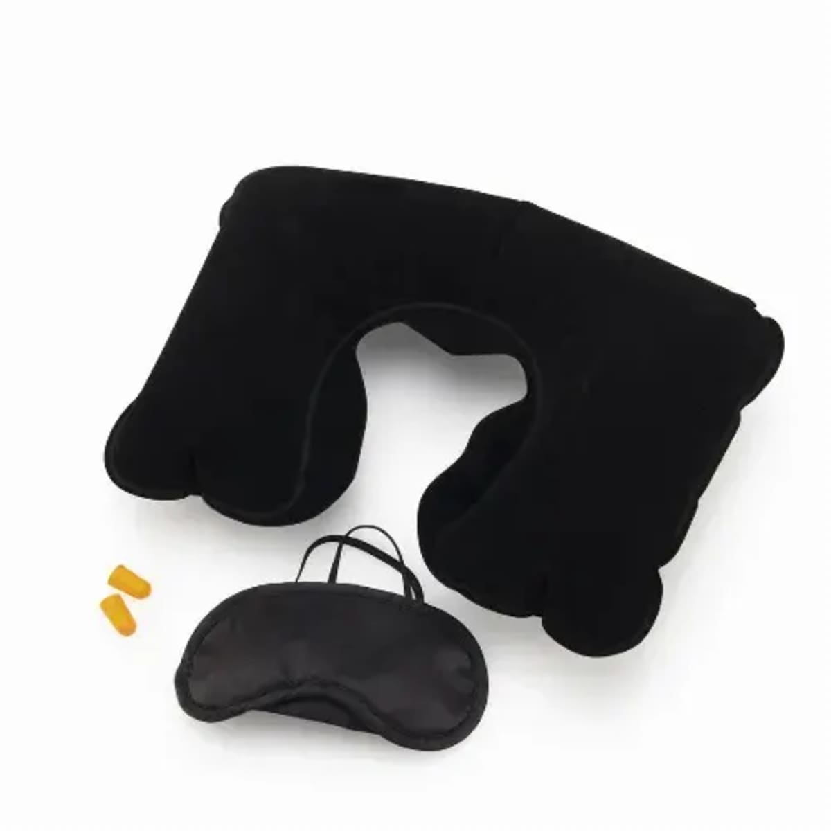 Includes a soft and comfortable black microfiber mask with matching color double elastic fit, inflatable neck cushion in velvet, and a pair of orange earplugs in comfortable EVA material.